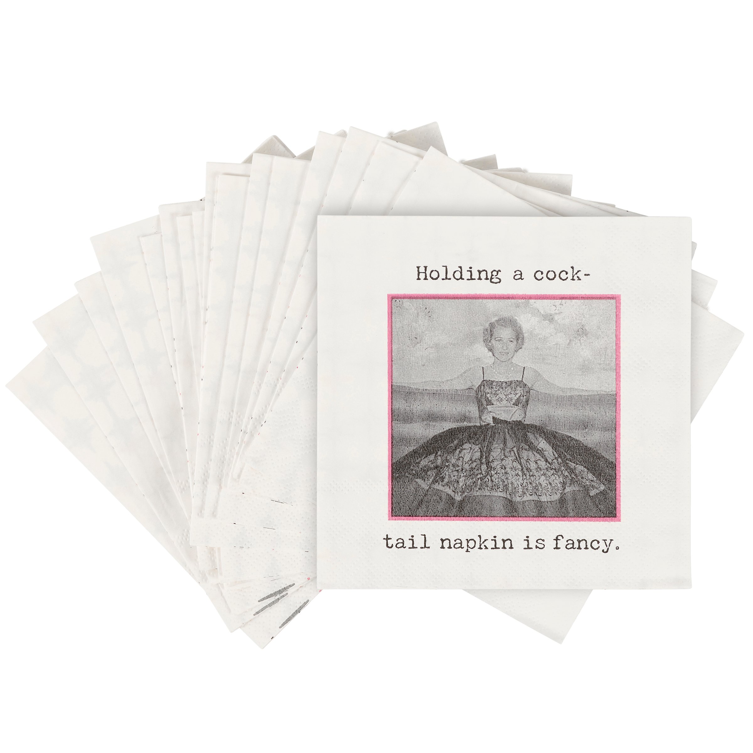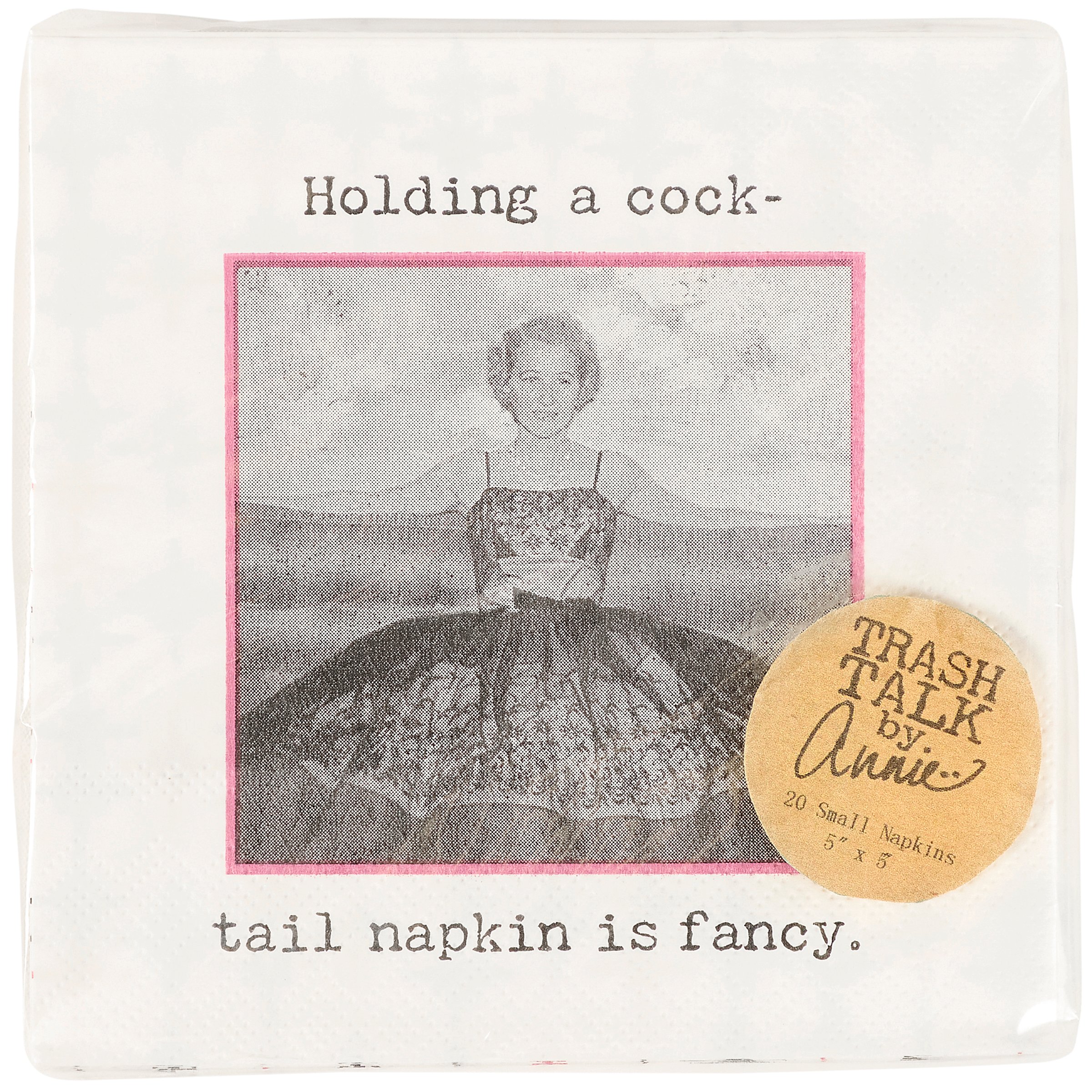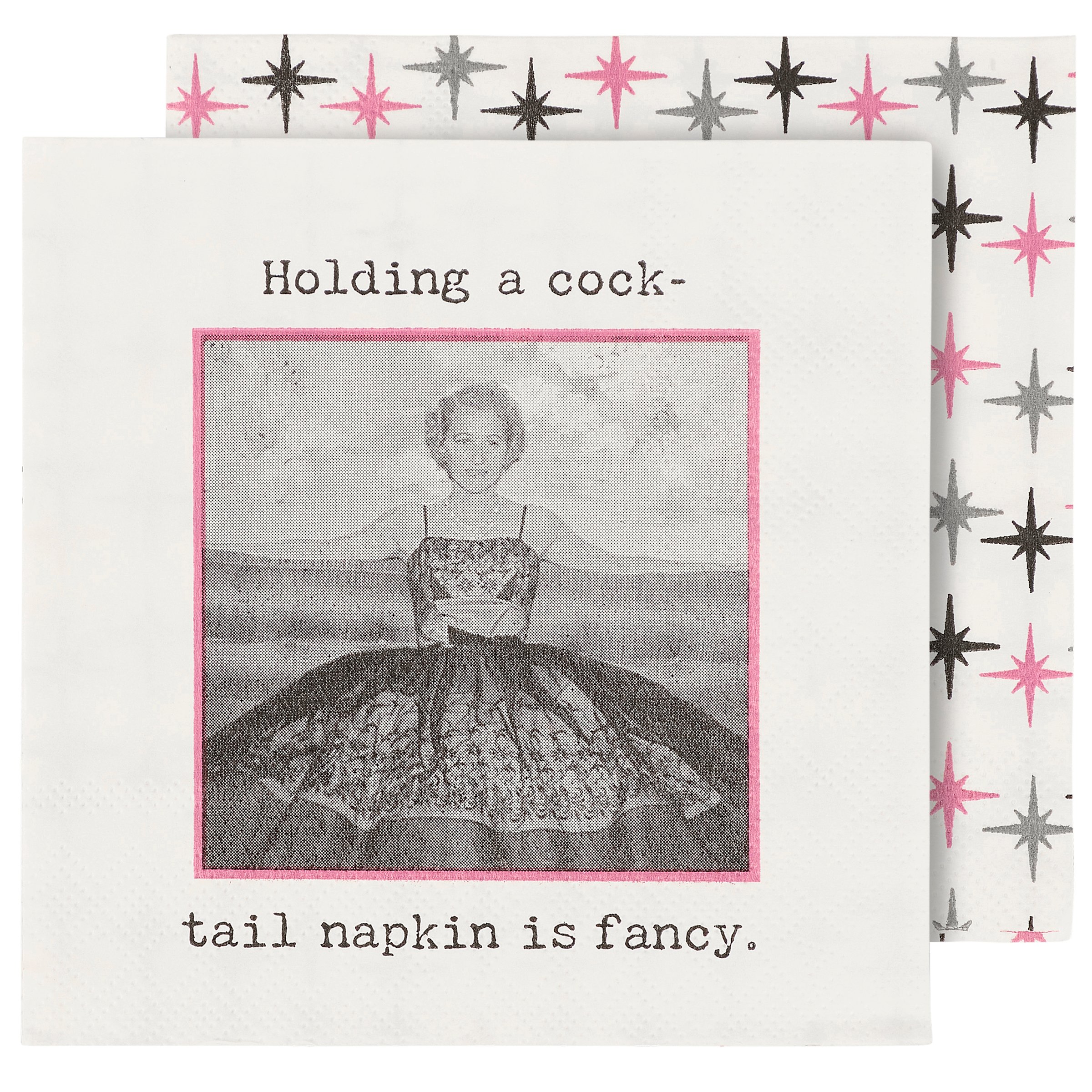 Perfect for entertaining guests and making clean-up a breeze, this disposable beverage napkin from our Trash Talk By Annie Collection displays a vintage black and white photograph complemented with a humorous sentiment that reads "Holding A Cock-tail Napkin Is Fancy." Beverage napkin also features a coordinating retro pattern on the back when flipped as well as the rest of the napkin when unfolded. Our Fancy beverage napkin measures 5" by 5" and comes shrink-wrapped in a set of 20 napkins. A fun retro bar accessory perfect for everyday use.