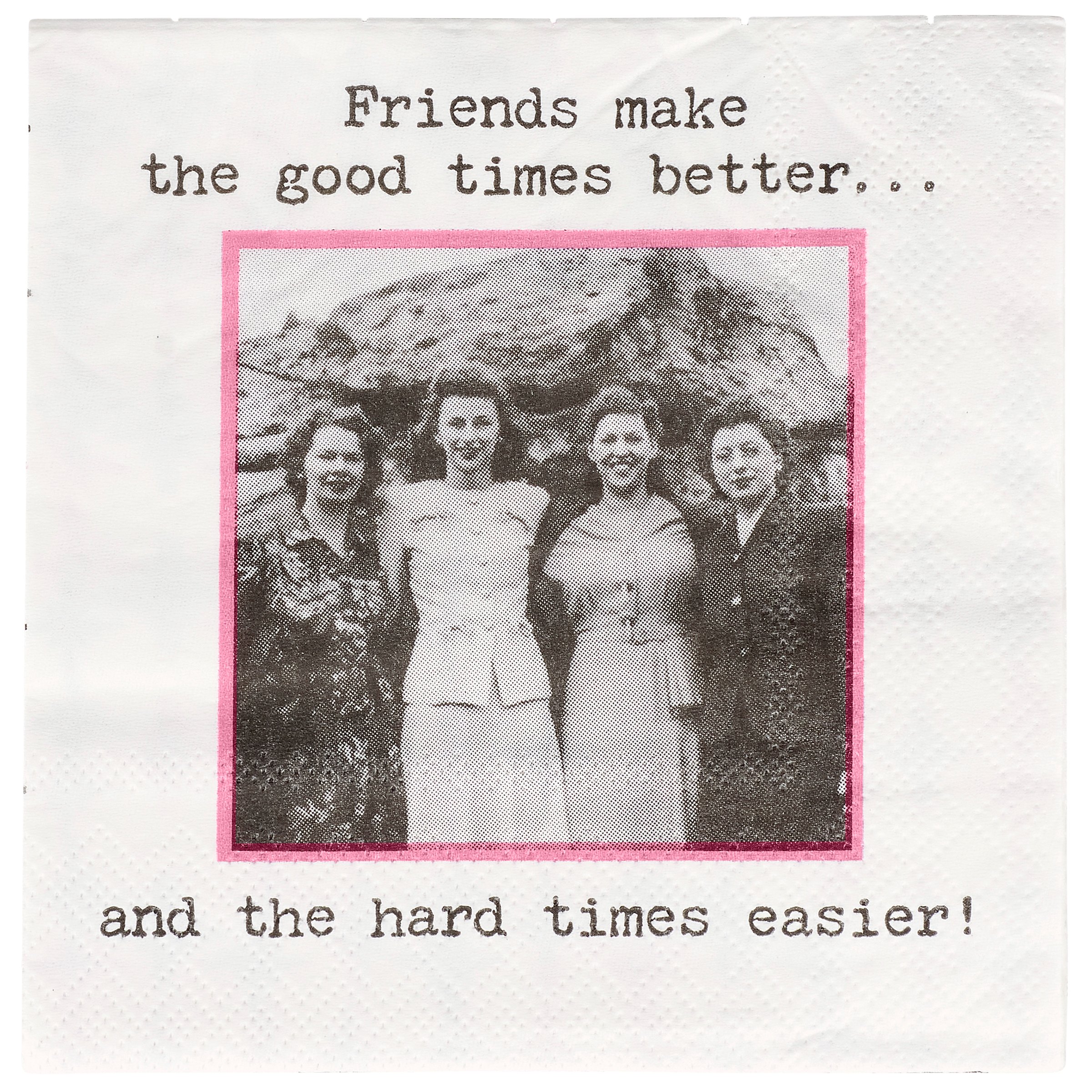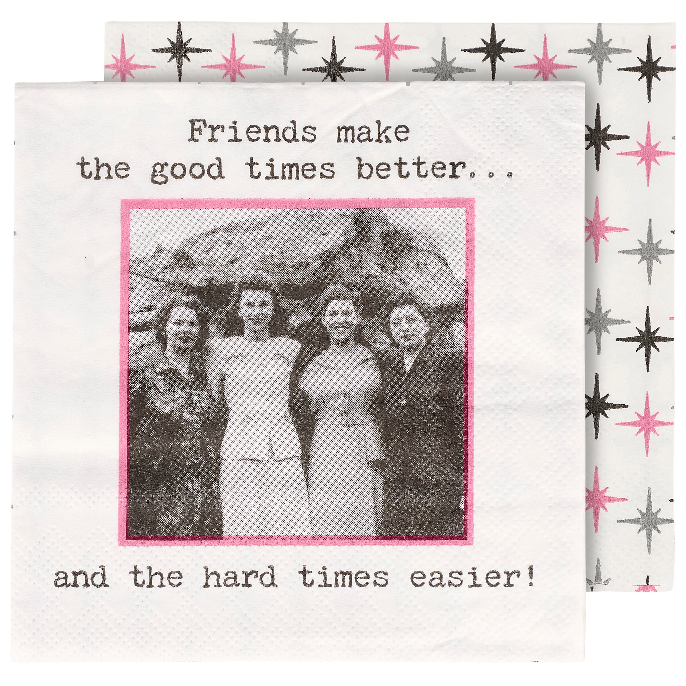 Perfect for entertaining guests and making clean-up a breeze, this disposable beverage napkin from our Trash Talk By Annie Collection displays a vintage black and white photograph complemented with a fun friend themed sentiment that reads "Friends Make The Good Times Better... And The Hard Times Easier!" Beverage napkin also features a coordinating retro pattern on the back when flipped as well as the rest of the napkin when unfolded. Our Friends Make Good Times beverage napkin measures 5" by 5" and comes shrink-wrapped in a set of 20 napkins. A fun retro bar accessory perfect for everyday gatherings.