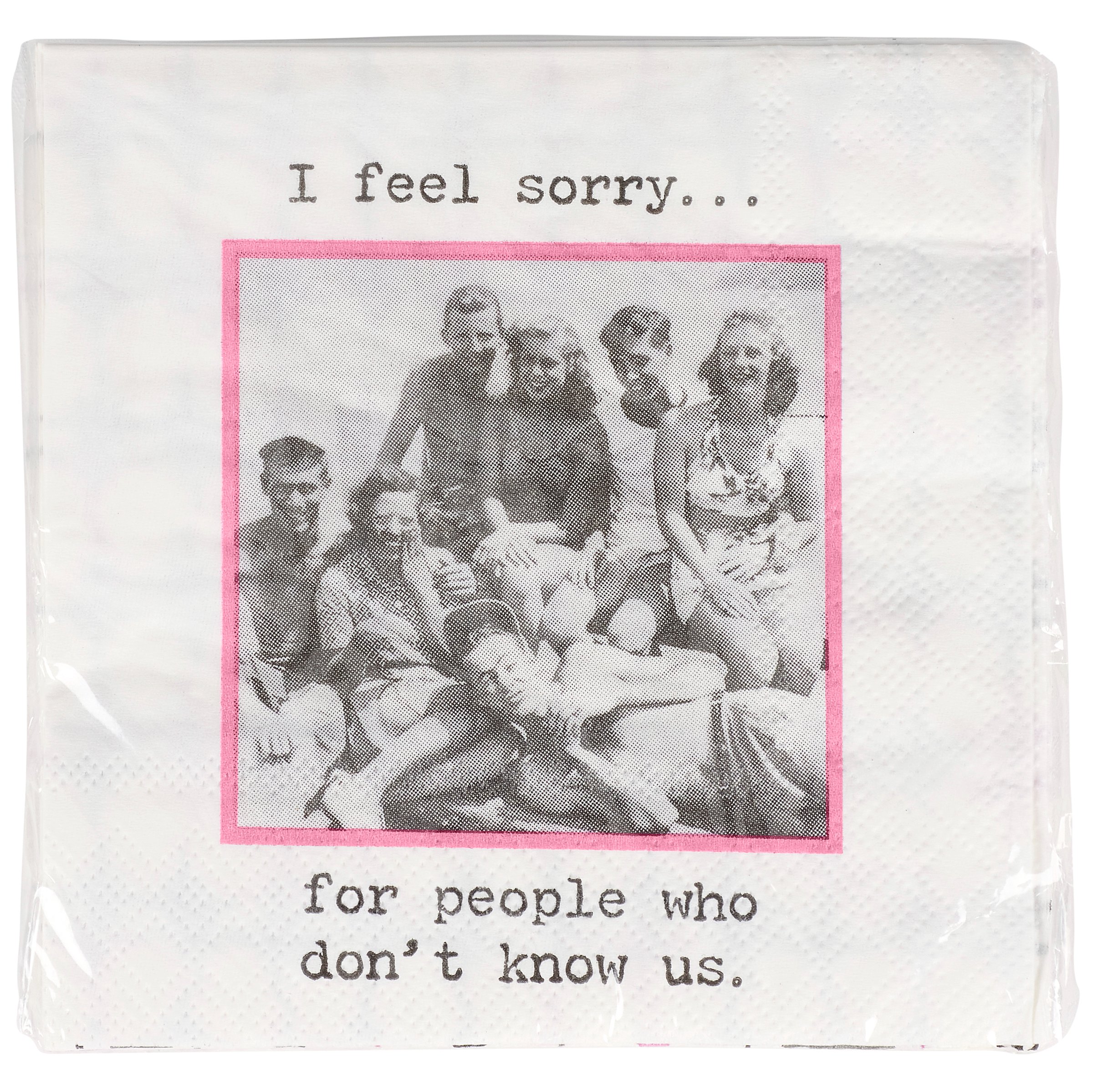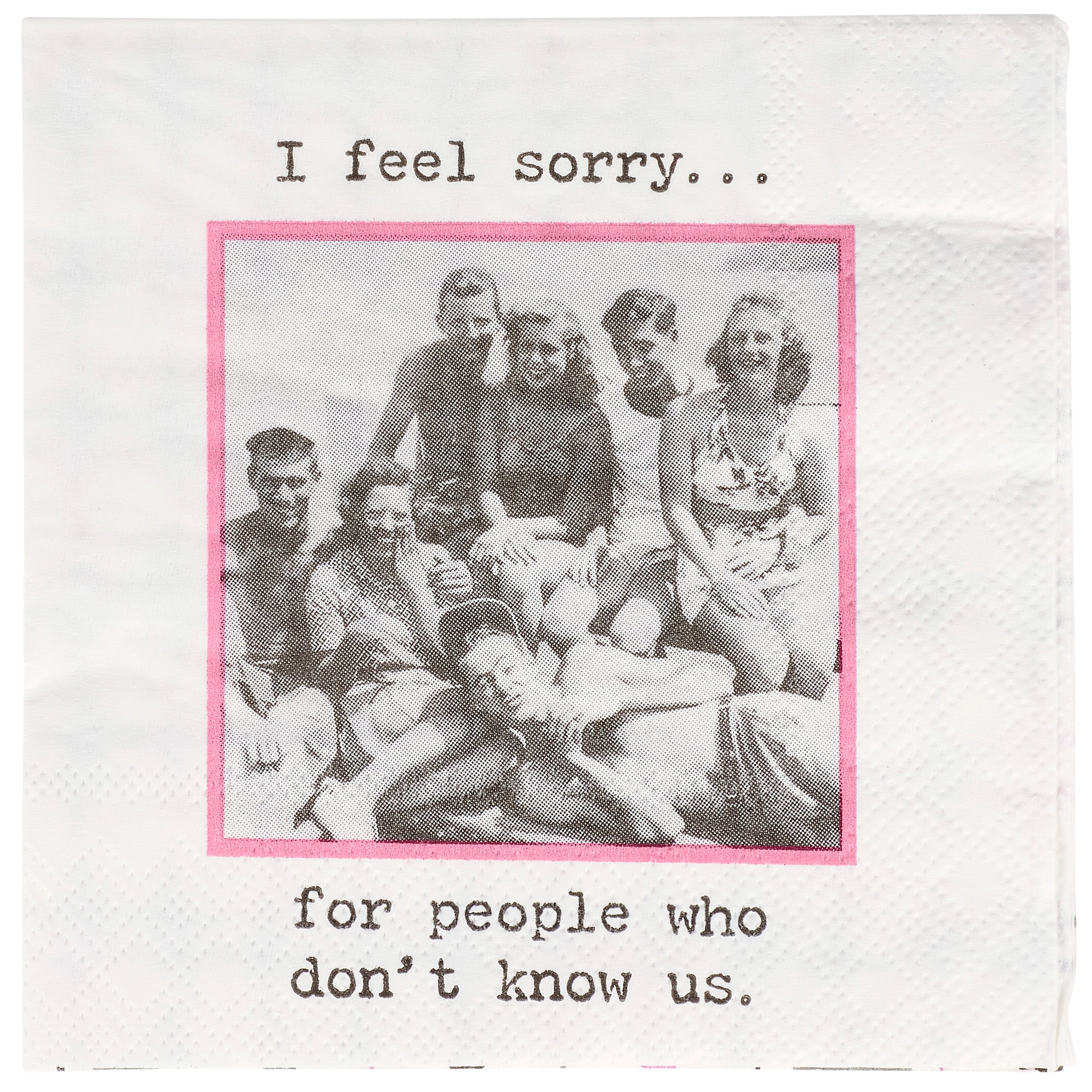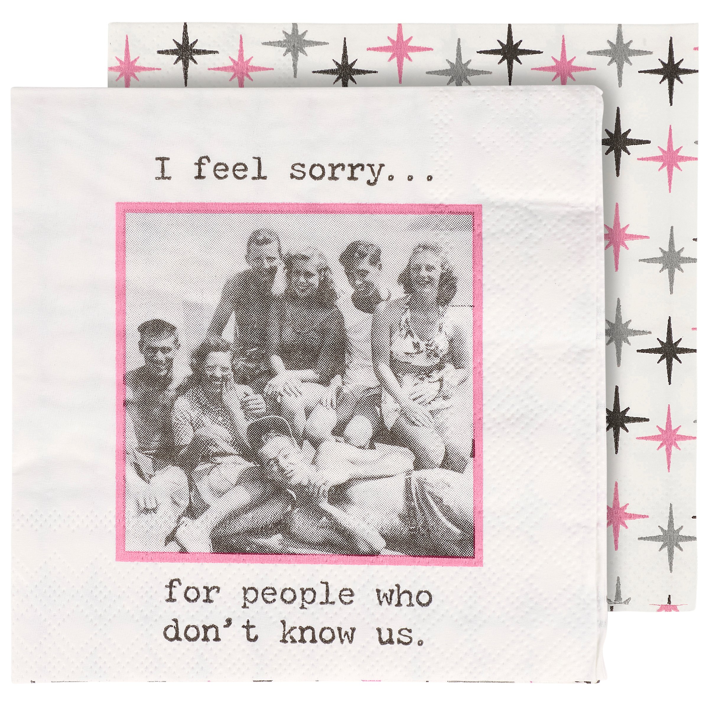 Perfect for entertaining guests and making clean-up a breeze, this disposable beverage napkin from our Trash Talk By Annie Collection displays a vintage black and white photograph complemented with a sassy friend themed sentiment that reads "I Feel Sorry... For People Who Don't Know Us." Beverage napkin also features a coordinating retro pattern on the back when flipped as well as the rest of the napkin when unfolded. Our I Feel Sorry For People beverage napkin measures 5" by 5" and comes shrink-wrapped in a set of 20 napkins. A fun retro bar accessory perfect for everyday gatherings.