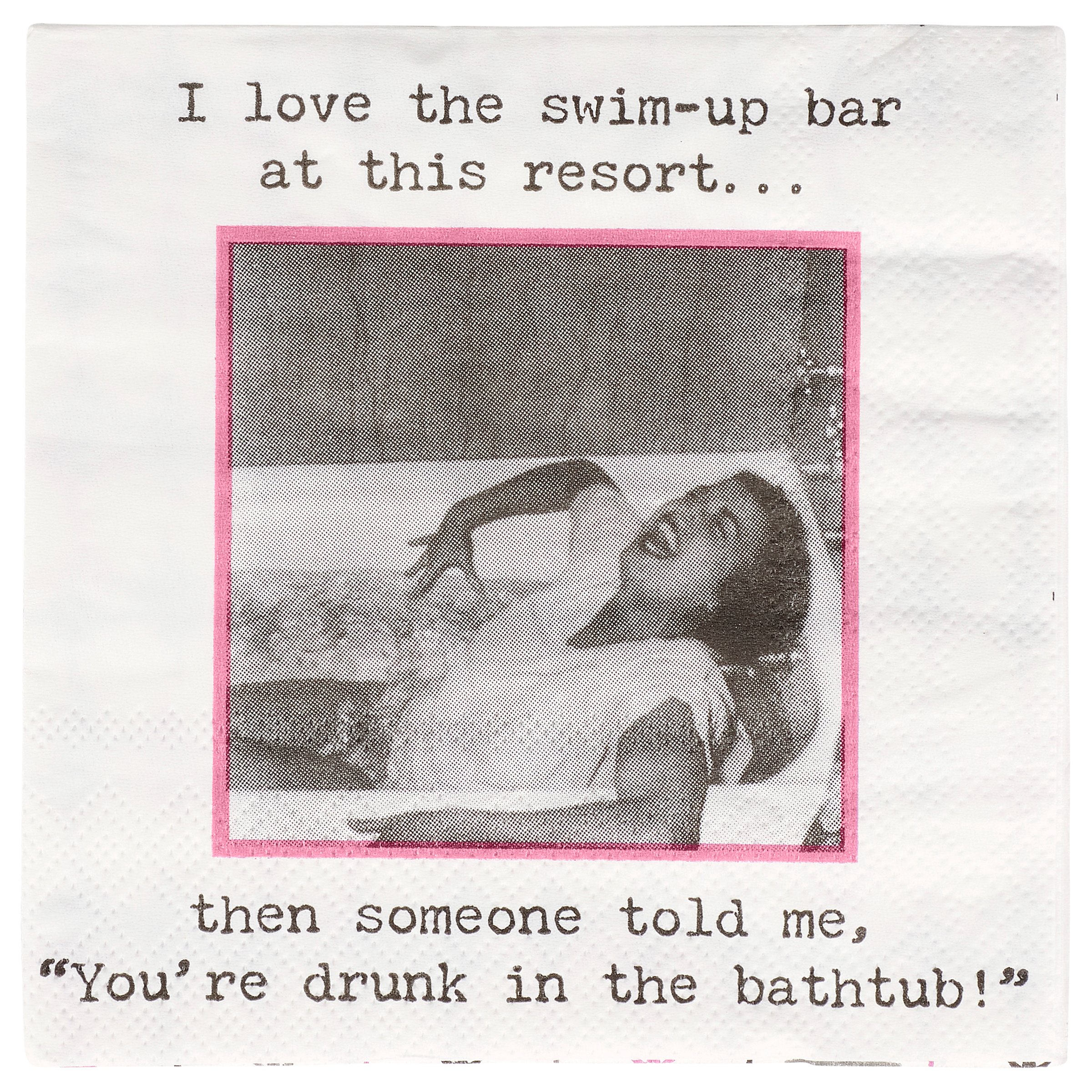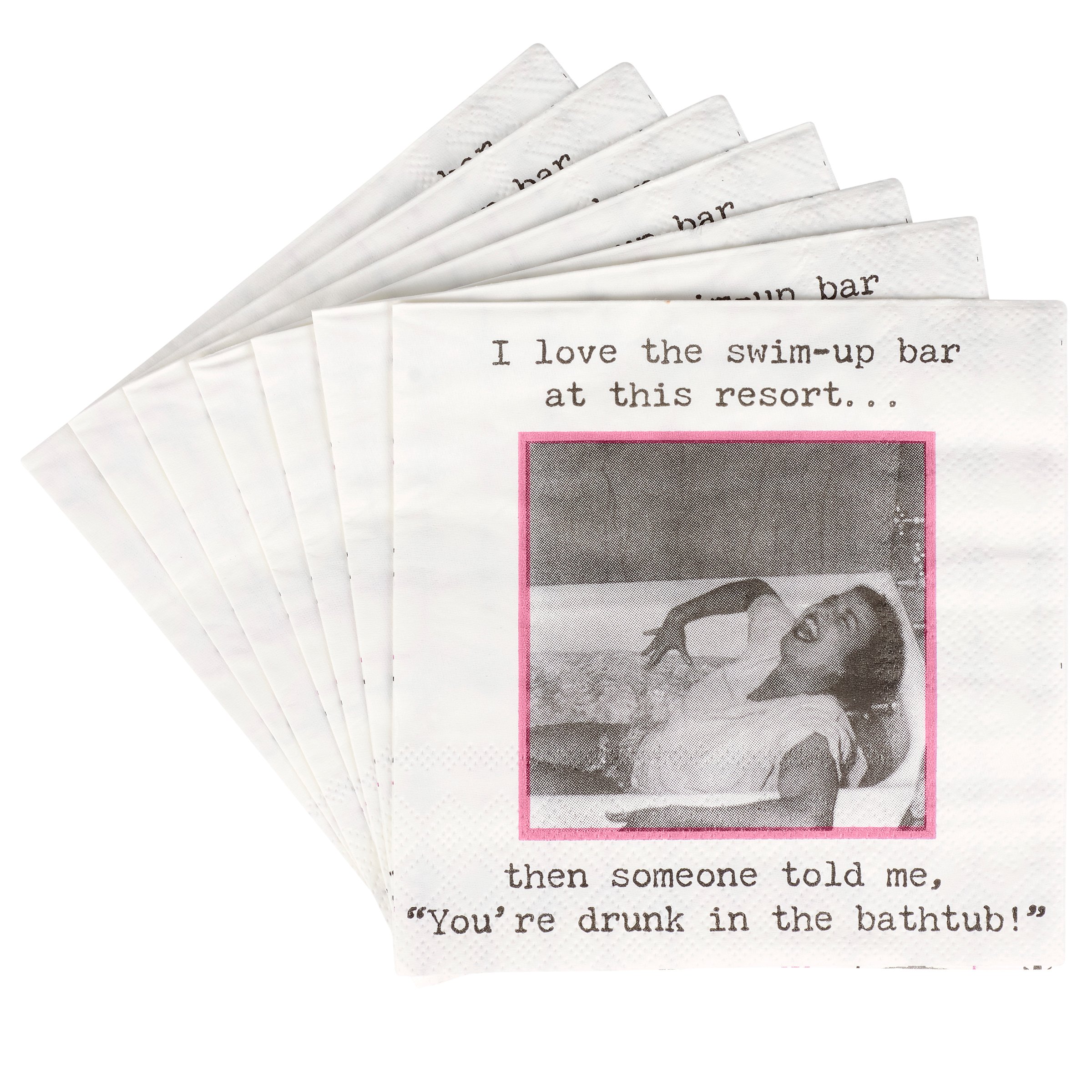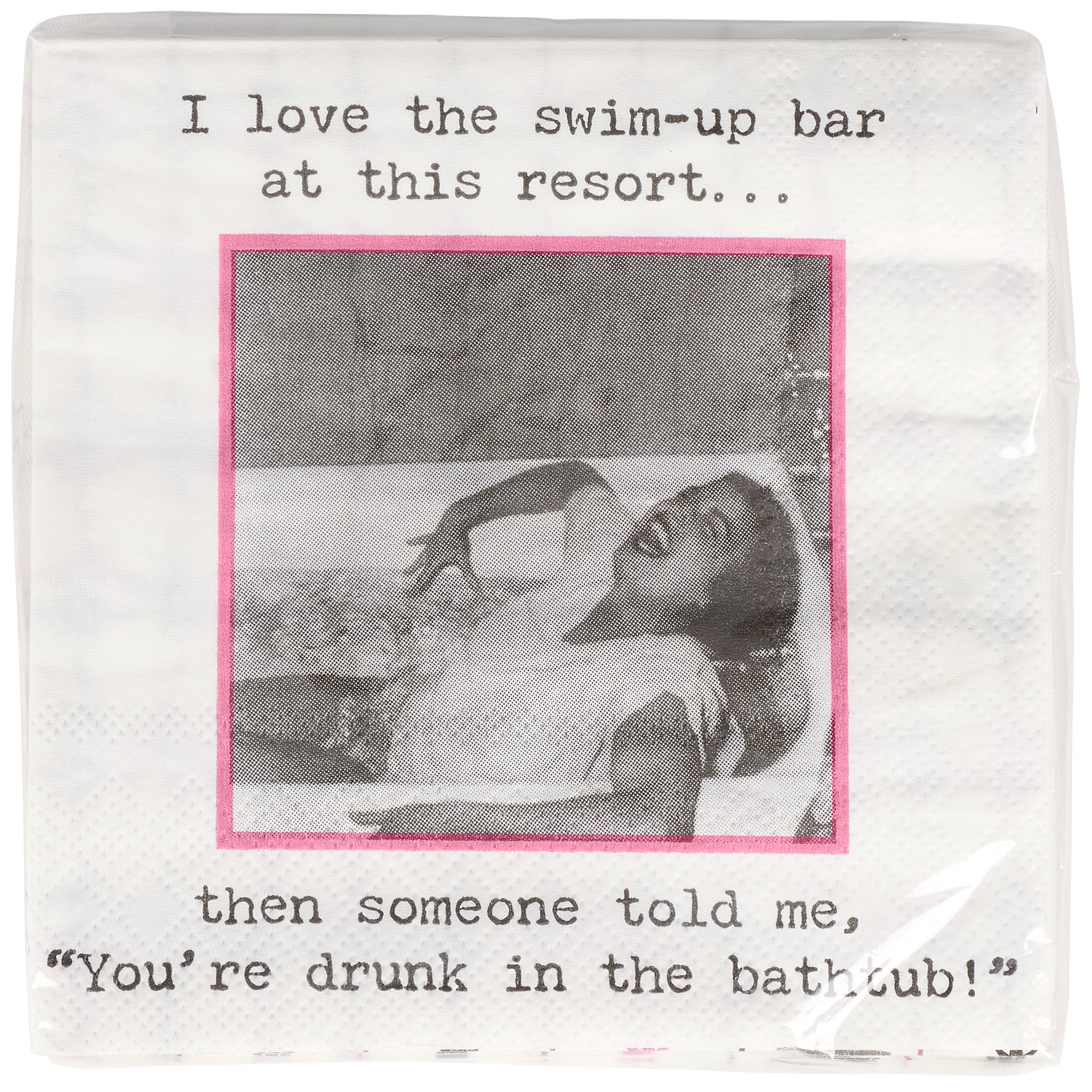 Perfect for entertaining guests and making clean-up a breeze, this disposable beverage napkin from our Trash Talk By Annie Collection displays a vintage black and white photograph complemented with a sassy alcohol themed sentiment that reads "I Love The Swim-Up Bar At This Resort... Then Someone Told Me, 'You're Drunk In The Bathtub!'" Beverage napkin also features a coordinating retro pattern on the back when flipped as well as the rest of the napkin when unfolded. Our I Love The Swim-Up Bar beverage napkin measures 5" by 5" and comes shrink-wrapped in a set of 20 napkins. A fun retro bar accessory perfect for everyday gatherings.