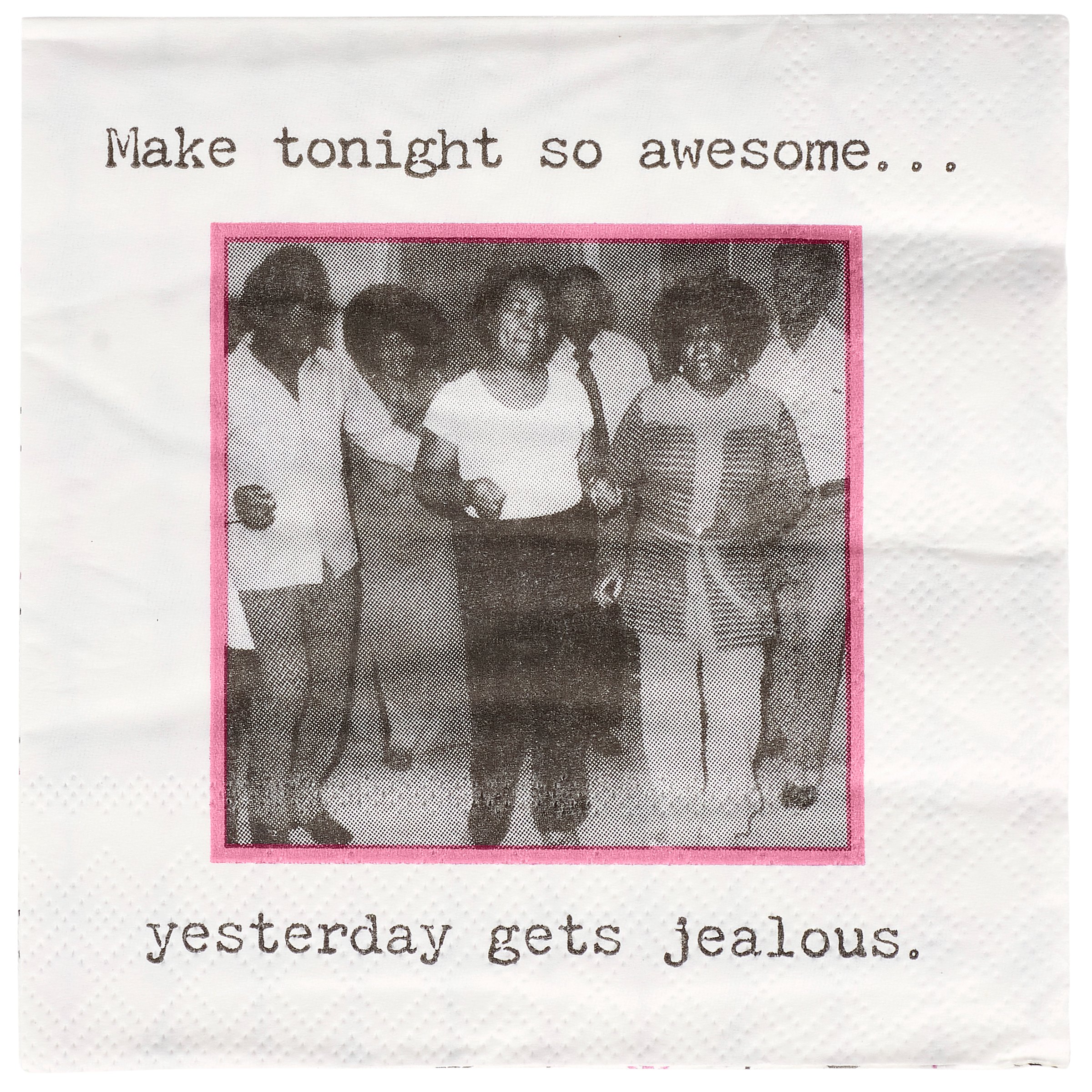Perfect for entertaining guests and making clean-up a breeze, this disposable beverage napkin from our Trash Talk By Annie Collection displays a vintage black and white photograph complemented with a fun party themed sentiment that reads "Make Tonight So Awesome... Yesterday Gets Jealous." Beverage napkin also features a coordinating retro pattern on the back when flipped as well as the rest of the napkin when unfolded. Our Make Tonight So Awesome beverage napkin measures 5" by 5" and comes shrink-wrapped in a set of 20 napkins. A fun retro bar accessory perfect for everyday gatherings.