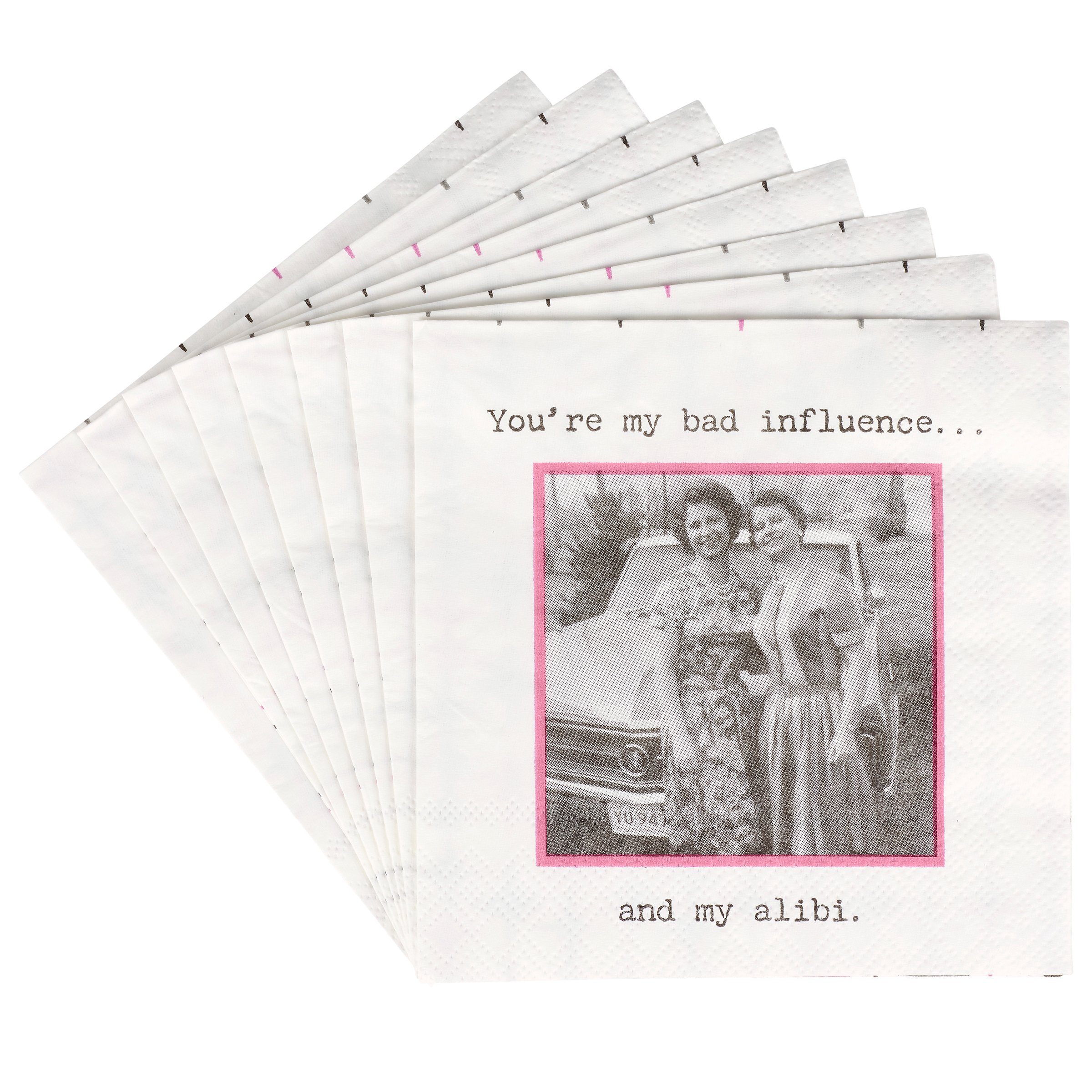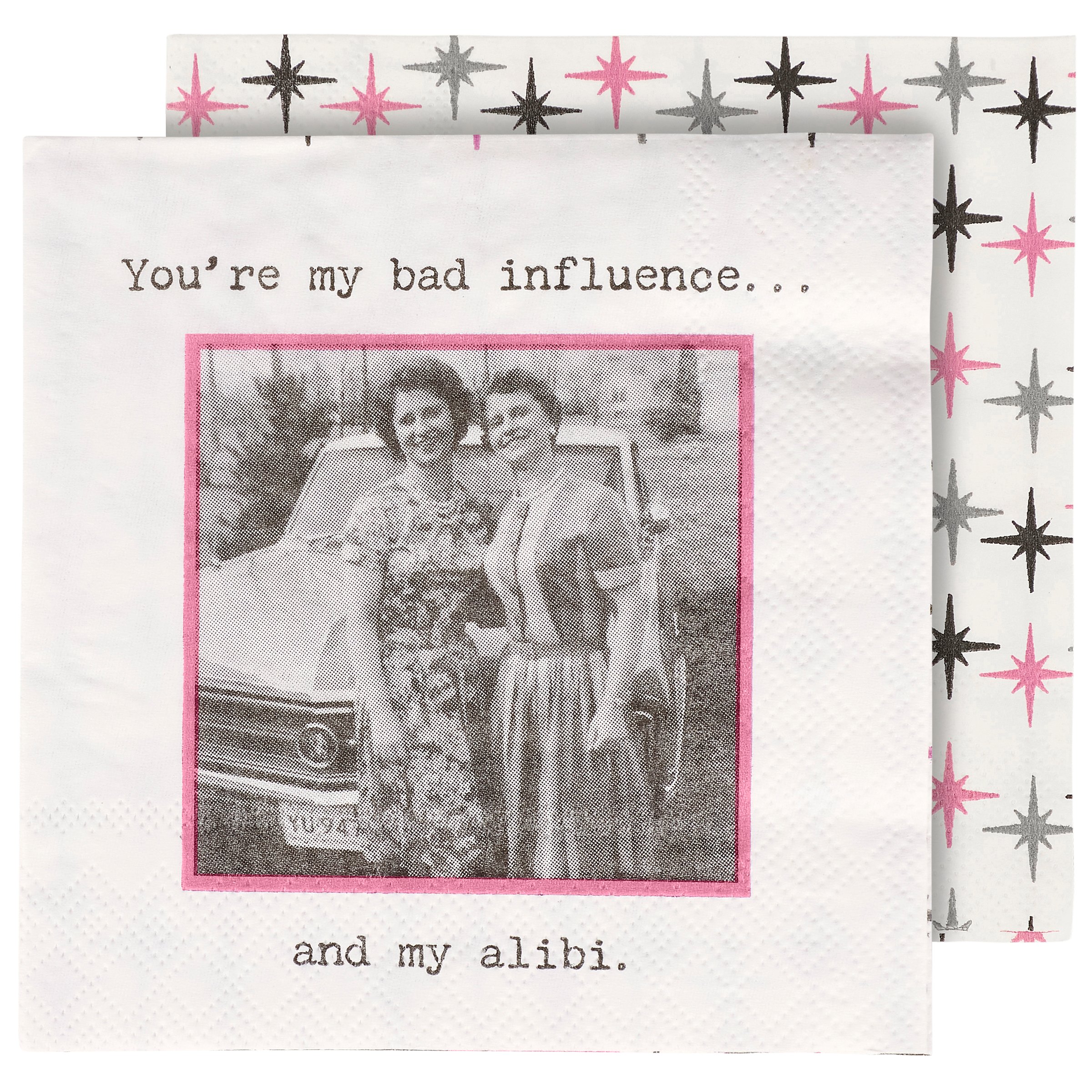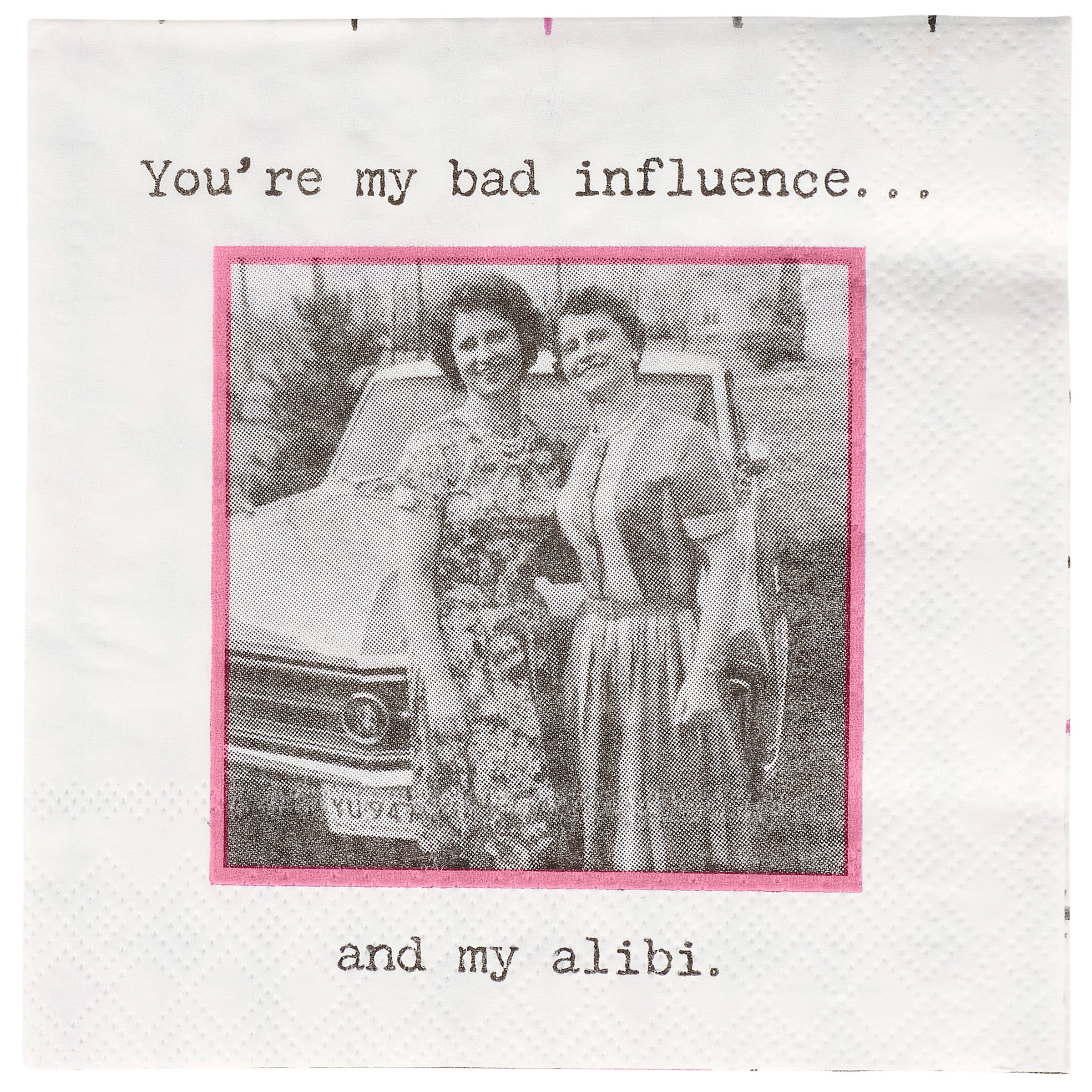 Perfect for entertaining guests and making clean-up a breeze, this disposable beverage napkin from our Trash Talk By Annie Collection displays a vintage black and white photograph complemented with a sassy friend themed sentiment that reads "You're My Bad Influence... And My Alibi." Beverage napkin also features a coordinating retro pattern on the back when flipped as well as the rest of the napkin when unfolded. Our My Bad Influence And My Alibi beverage napkin measures 5" by 5" and comes shrink-wrapped in a set of 20 napkins. A fun retro bar accessory perfect for everyday gatherings.