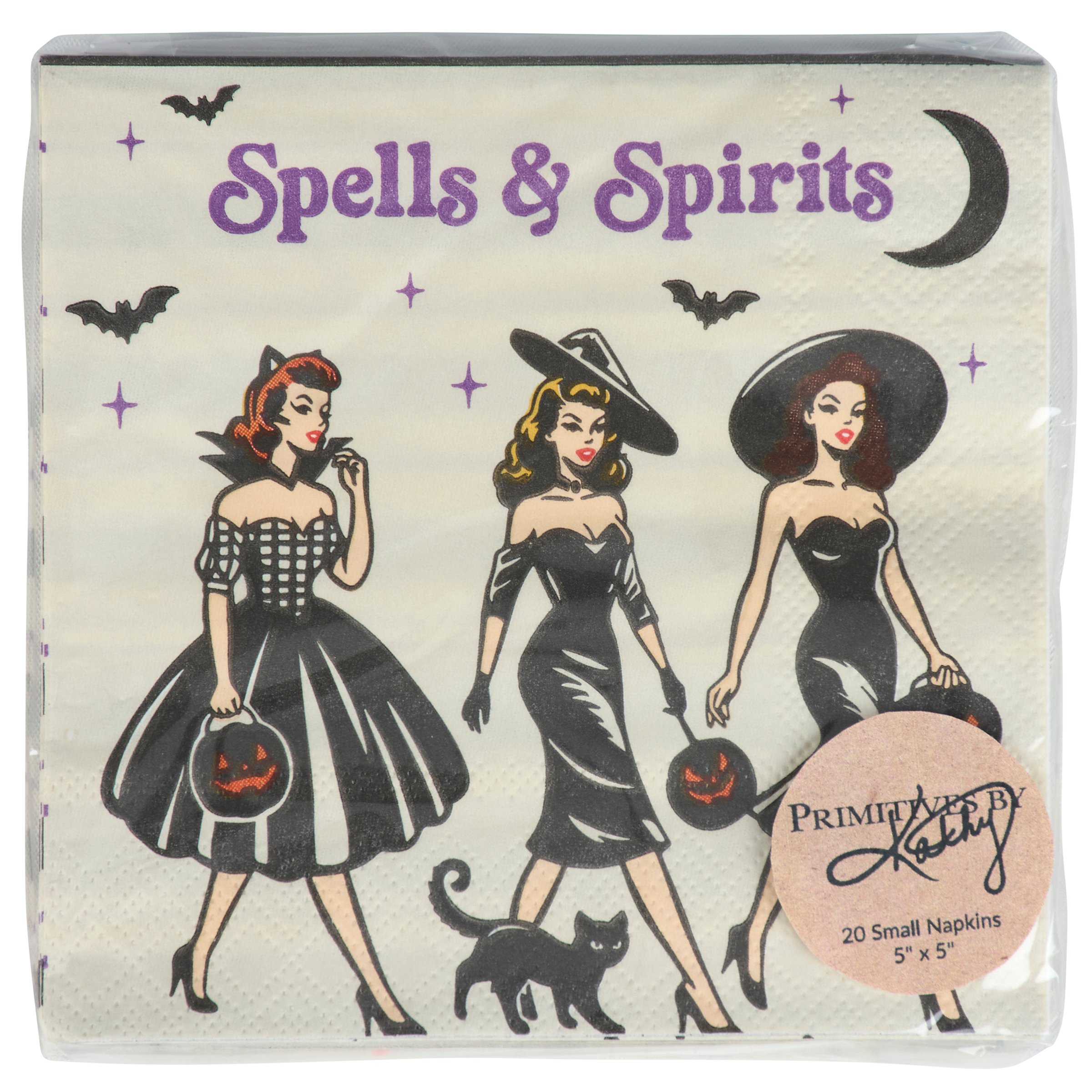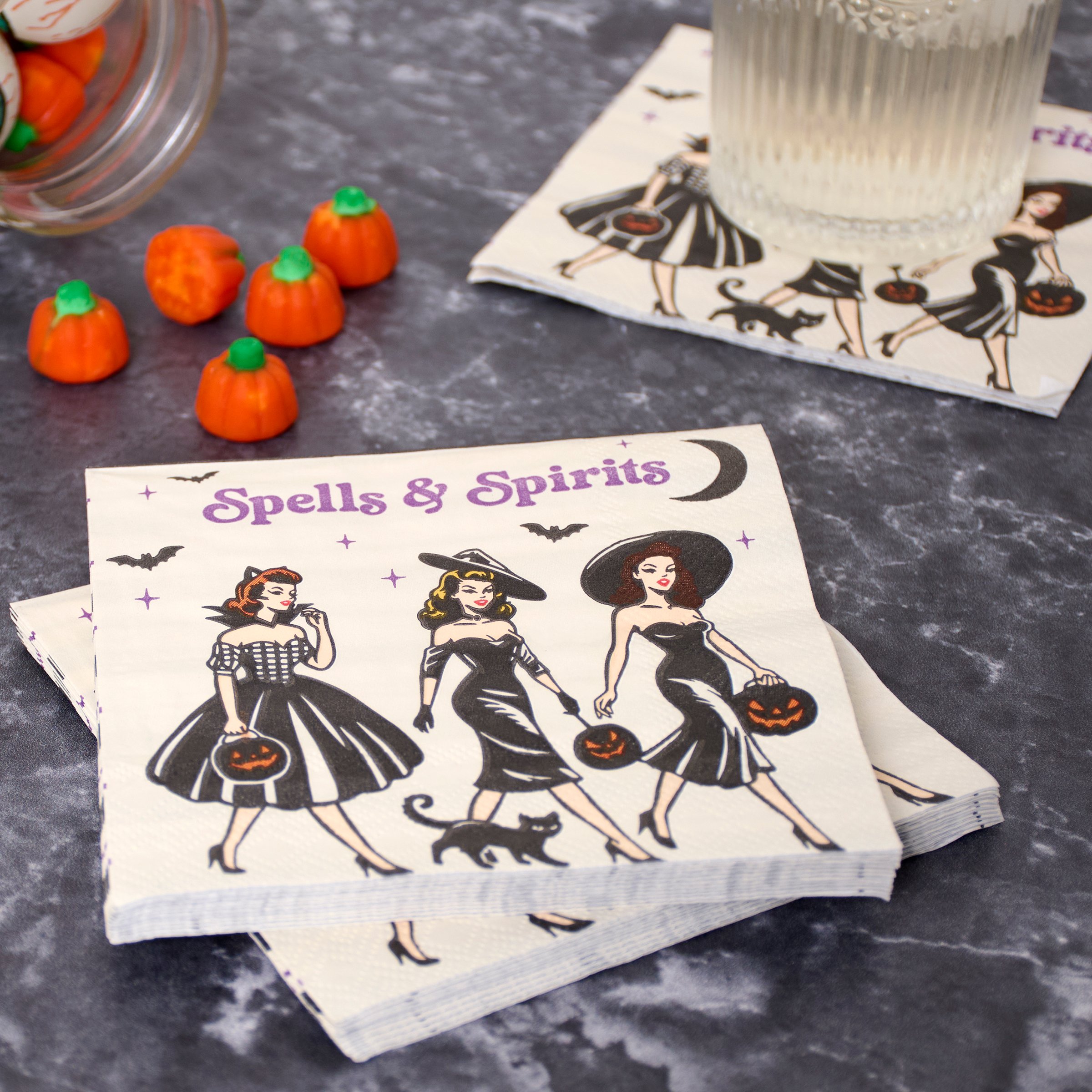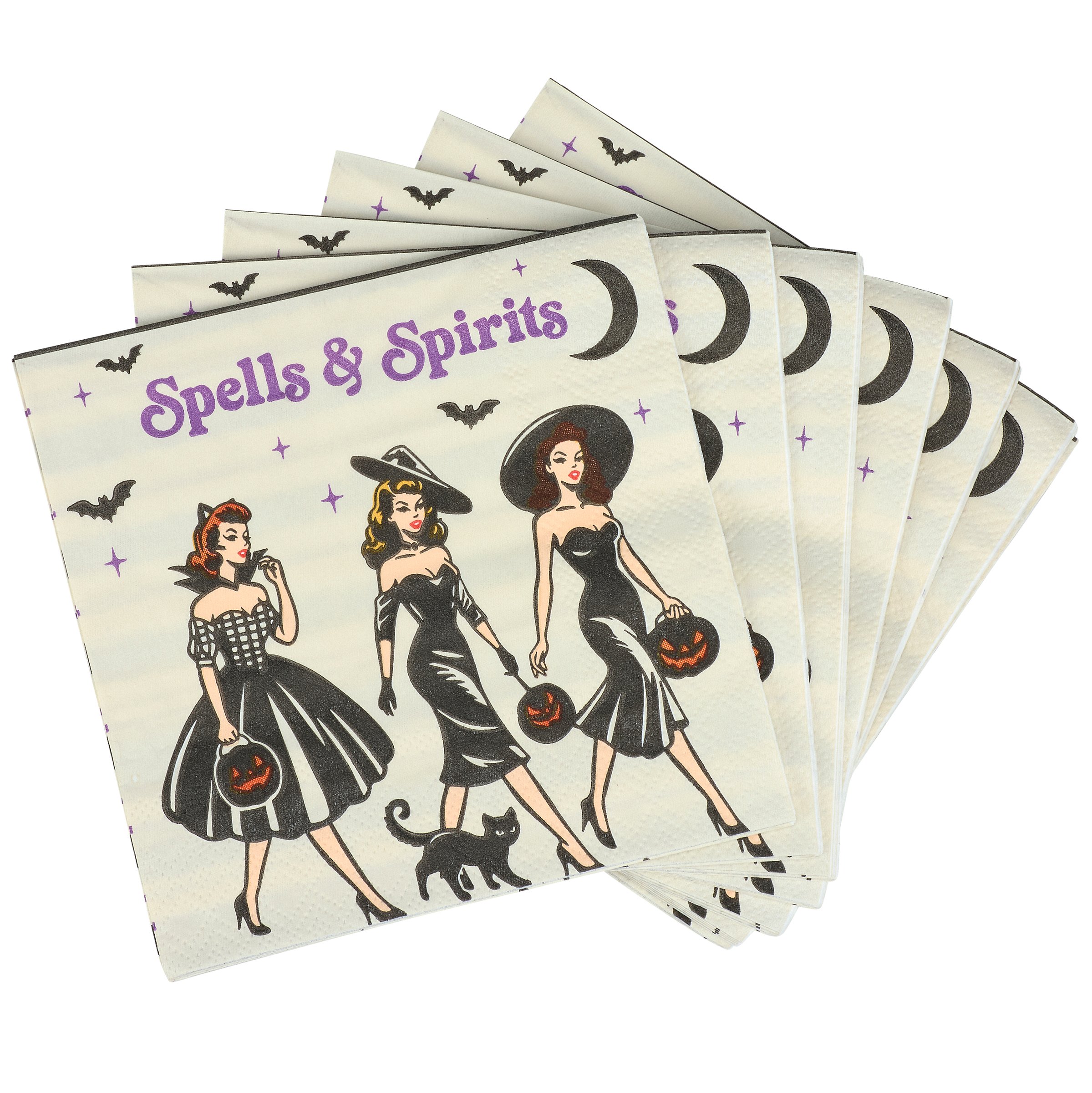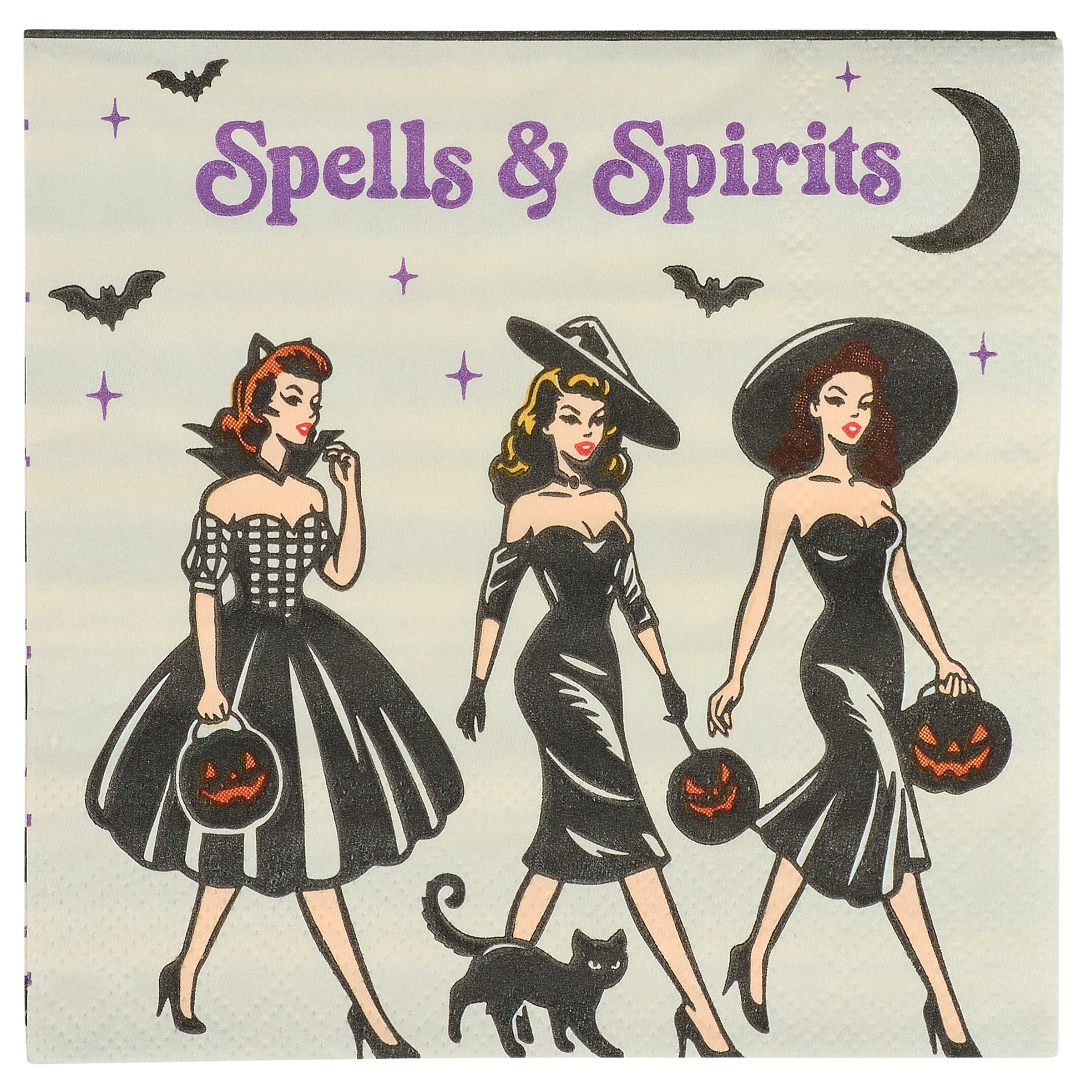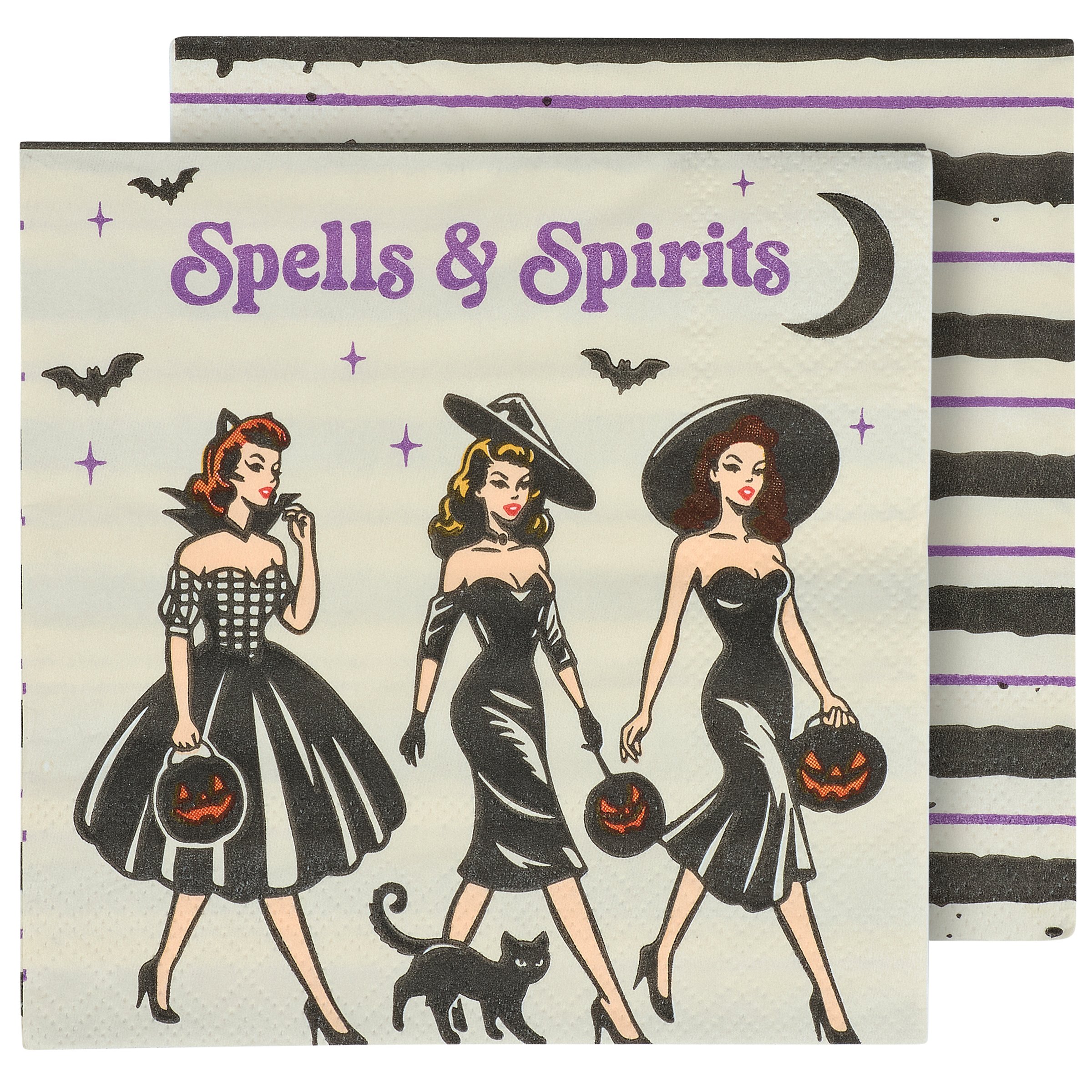 Perfect for customizing place settings and making clean-up a breeze, this seasonal paper napkin from our Halloween Collection displays colorful retro art of fancy witches with trick-or-treat buckets and a fun alcohol inspired sentiment that reads "Spells & Spirits." This fun witch napkin also features a coordinating stripe pattern on the back for multiple display options. Our Spell & Spirits beverage napkin measures 5 inches by 5 inches and comes shrink-wrapped in a set of 20 napkins. A fun witch-themed tabletop accessory great for Halloween parties.