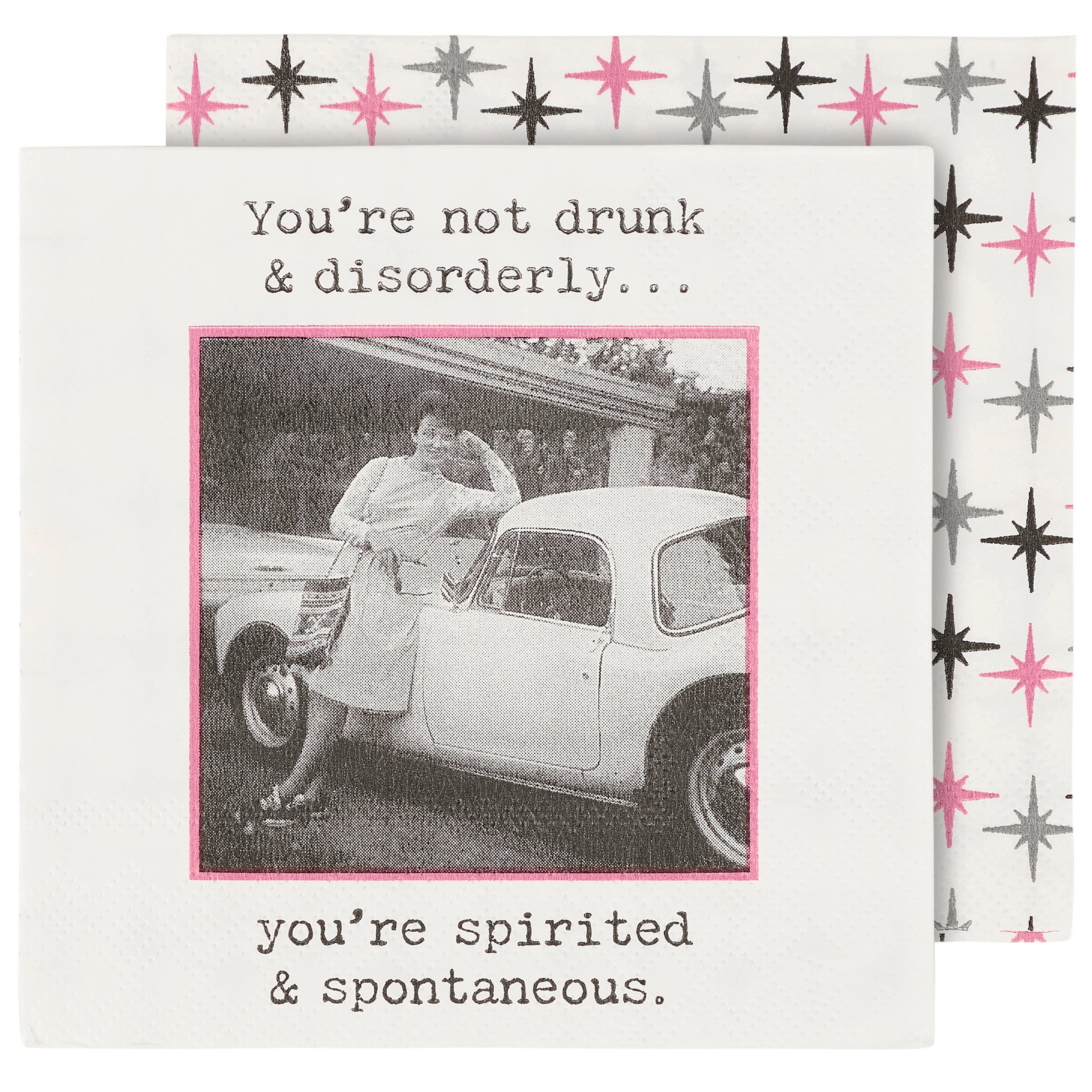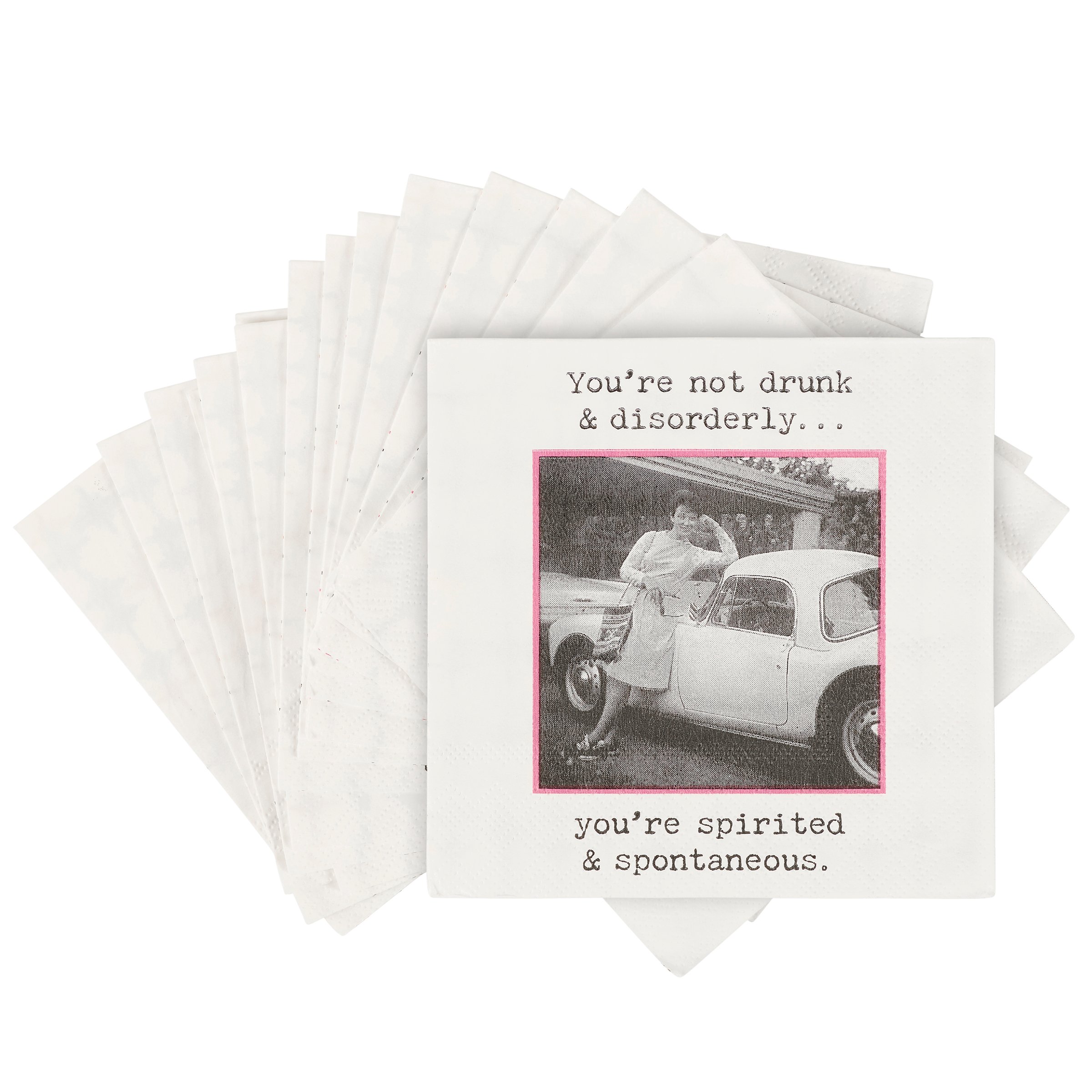 Perfect for entertaining guests and making clean-up a breeze, this disposable beverage napkin from our Trash Talk By Annie Collection displays a vintage black and white photograph complemented with a humorous sentiment that reads "You're Not Drunk & Disorderly... You're Spirited & Spontaneous." Beverage napkin also features a coordinating retro pattern on the back when flipped as well as the rest of the napkin when unfolded. Our Spirited And Spontaneous beverage napkin measures 5" by 5" and comes shrink-wrapped in a set of 20 napkins. A fun retro bar accessory perfect for everyday use.