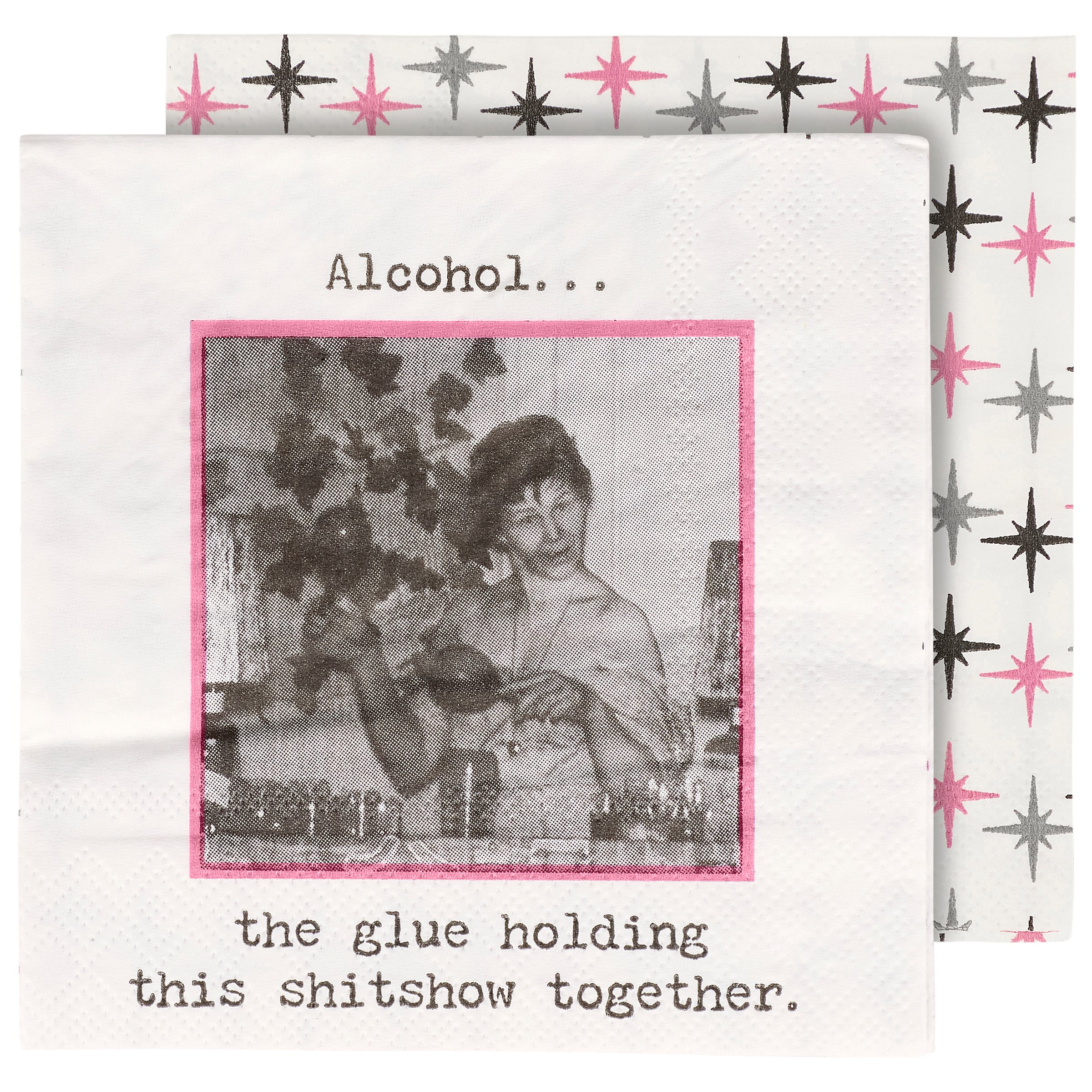 Perfect for entertaining guests and making clean-up a breeze, this disposable beverage napkin from our Trash Talk By Annie Collection displays a vintage black and white photograph complemented with a sassy alcohol themed sentiment that reads "Alcohol... The Glue Holding This Shitshow Together." Beverage napkin also features a coordinating retro pattern on the back when flipped as well as the rest of the napkin when unfolded. Our The Glue Holding This Together beverage napkin measures 5" by 5" and comes shrink-wrapped in a set of 20 napkins. A fun retro bar accessory perfect for everyday gatherings.