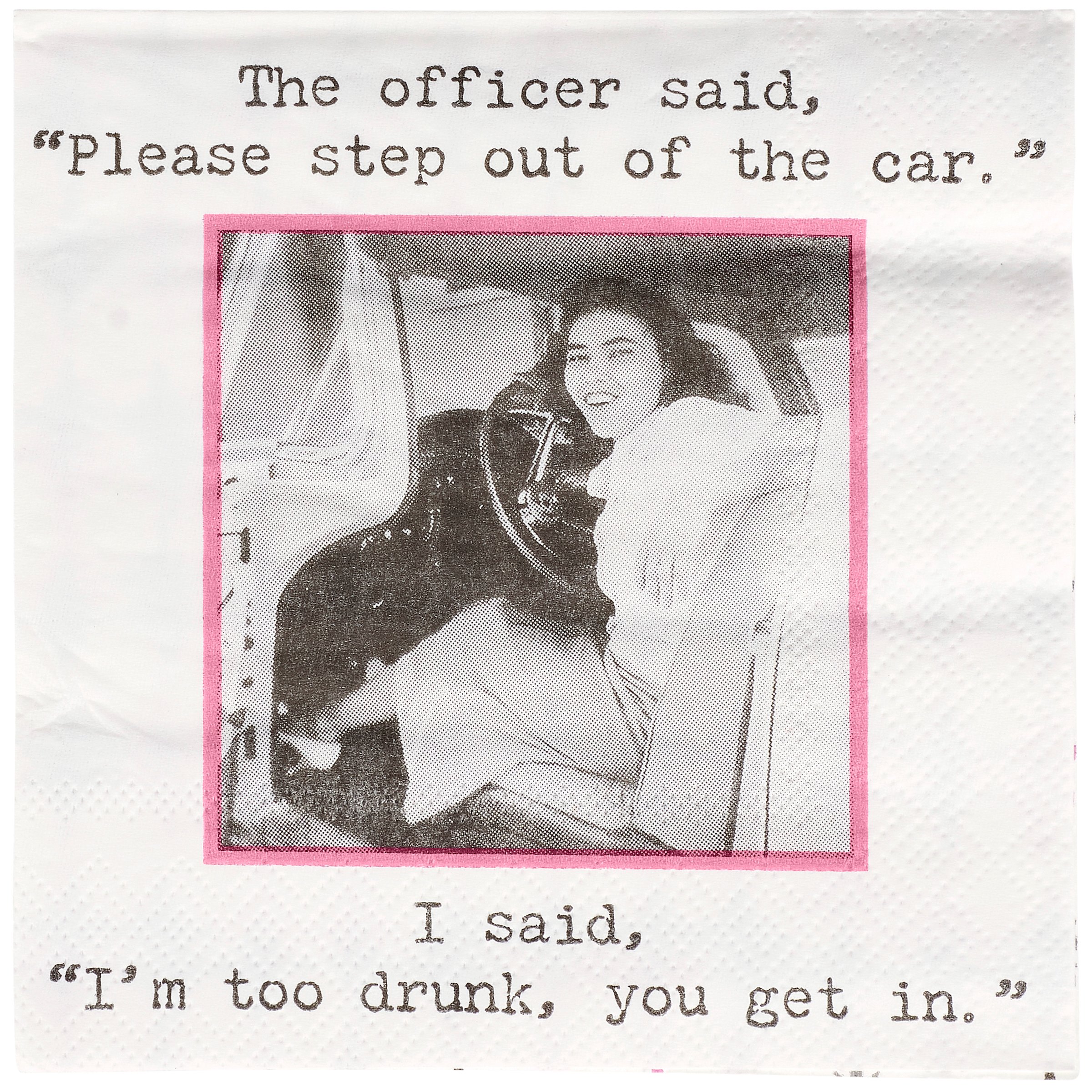 Perfect for entertaining guests and making clean-up a breeze, this disposable beverage napkin from our Trash Talk By Annie Collection displays a vintage black and white photograph complemented with a sassy alcohol themed sentiment that reads "The Officer Said, 'Please Step Out Of The Car.' I Said, 'I'm Too Drunk, You Get In.'" Beverage napkin also features a coordinating retro pattern on the back when flipped as well as the rest of the napkin when unfolded. Our The Officer Said I Said beverage napkin measures 5" by 5" and comes shrink-wrapped in a set of 20 napkins. A fun retro bar accessory perfect for everyday gatherings.