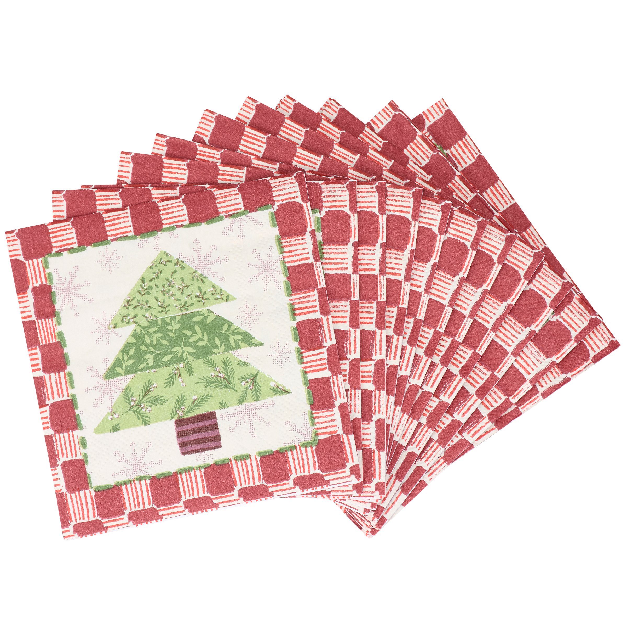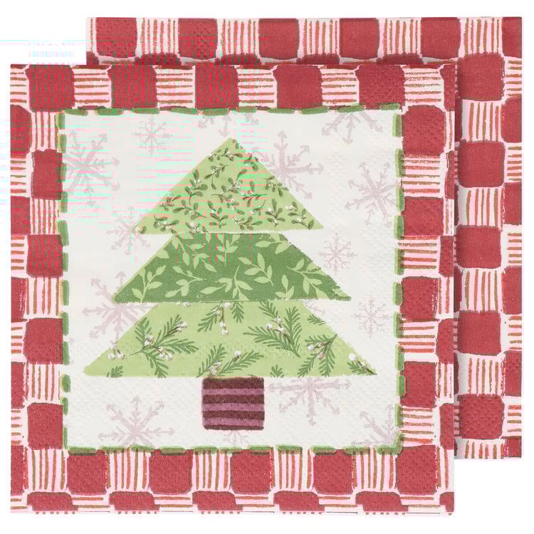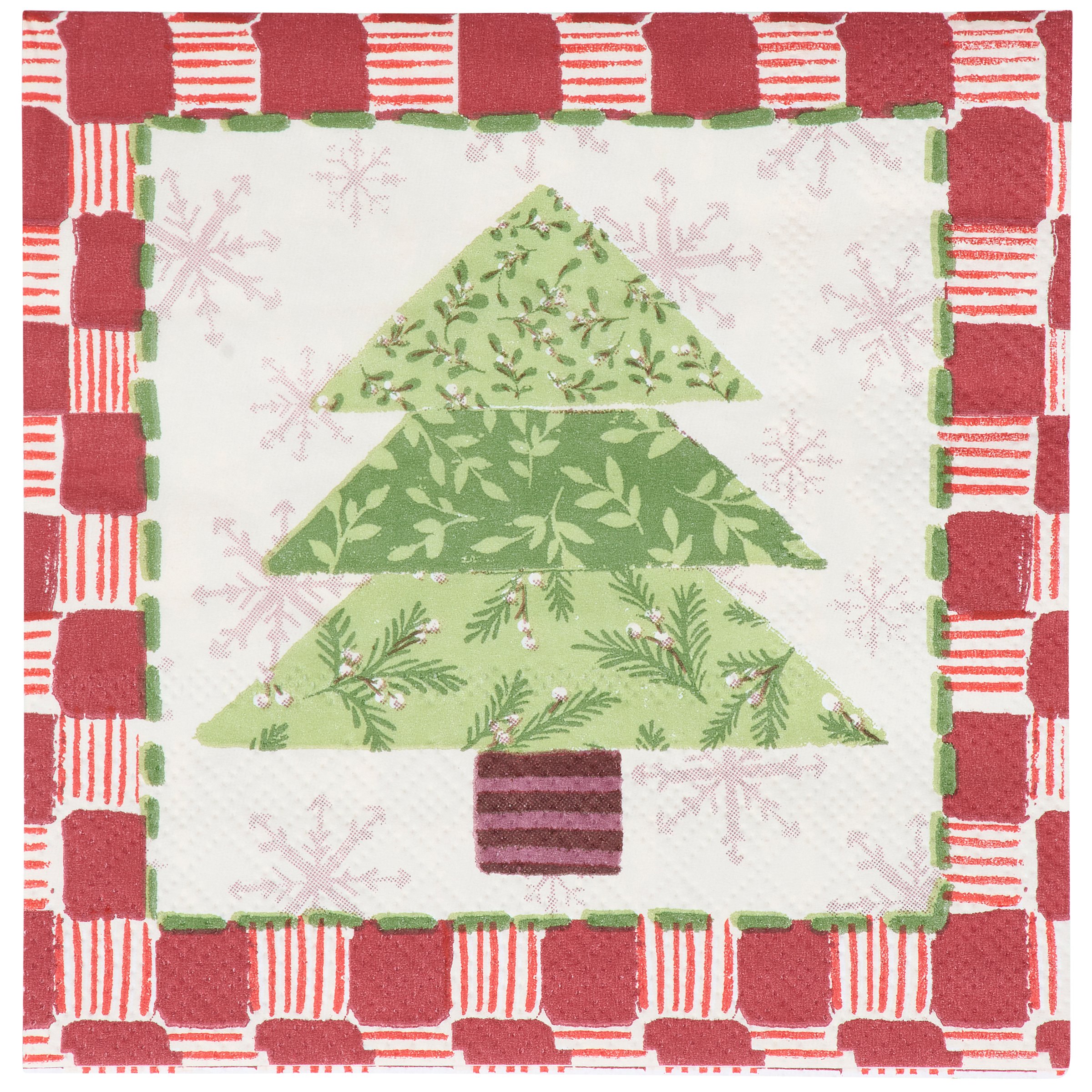 Perfect for customizing place settings and making clean-up a breeze, this seasonal paper napkin from our Craft Christmas Collection features a craft inspired Christmas tree design replicated from original art hand painted in a unique watercolor style. This seasonal napkin also features a coordinating red pattern on the back for multiple display options. Our Tree Quilt beverage napkin measures 5 inches by 5 inches and comes shrink-wrapped in a set of 20 napkins. A craft themed Christmas tabletop accessory great for seasonal gatherings.