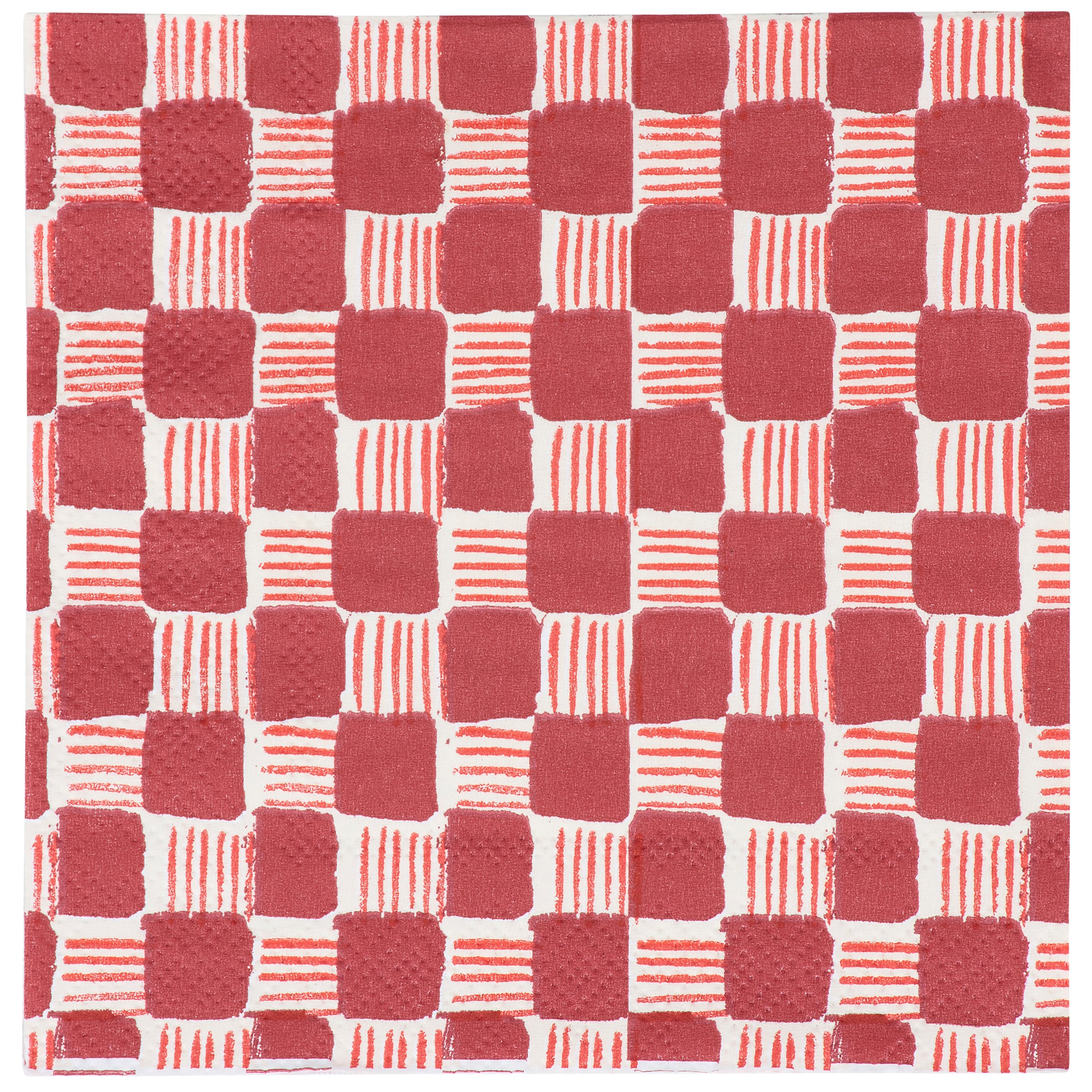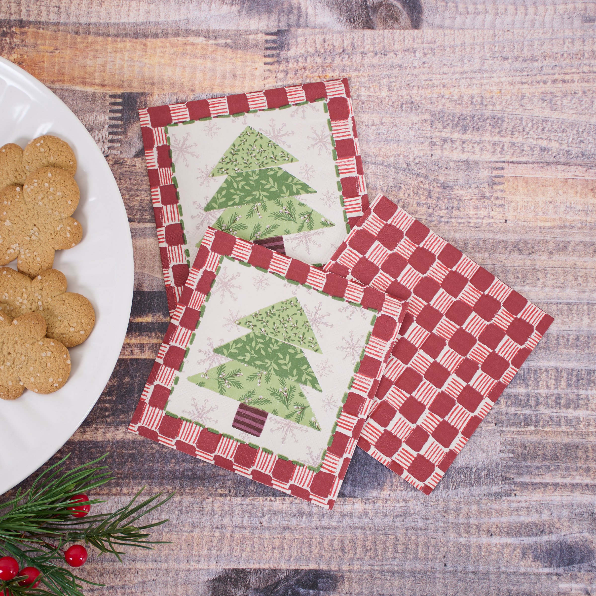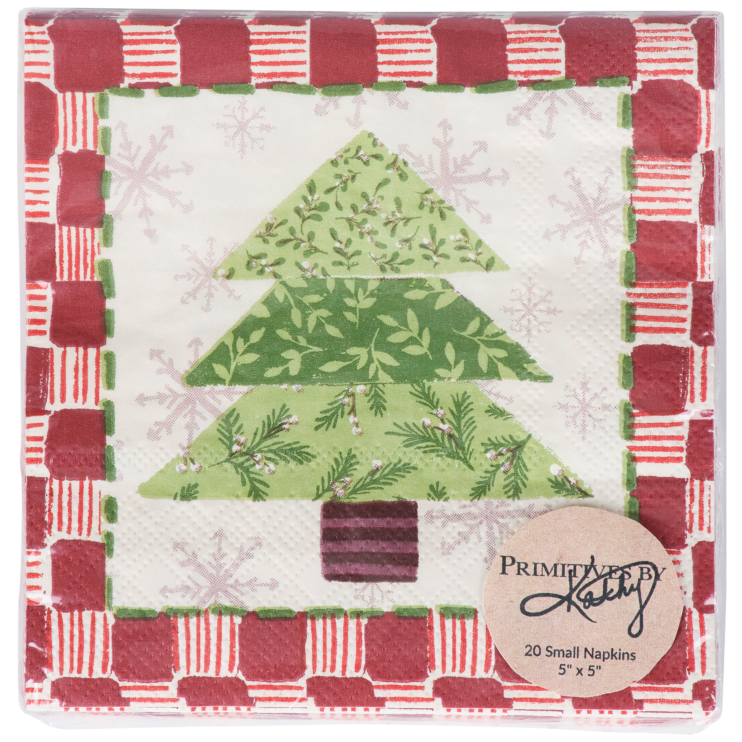 Perfect for customizing place settings and making clean-up a breeze, this seasonal paper napkin from our Craft Christmas Collection features a craft inspired Christmas tree design replicated from original art hand painted in a unique watercolor style. This seasonal napkin also features a coordinating red pattern on the back for multiple display options. Our Tree Quilt beverage napkin measures 5 inches by 5 inches and comes shrink-wrapped in a set of 20 napkins. A craft themed Christmas tabletop accessory great for seasonal gatherings.