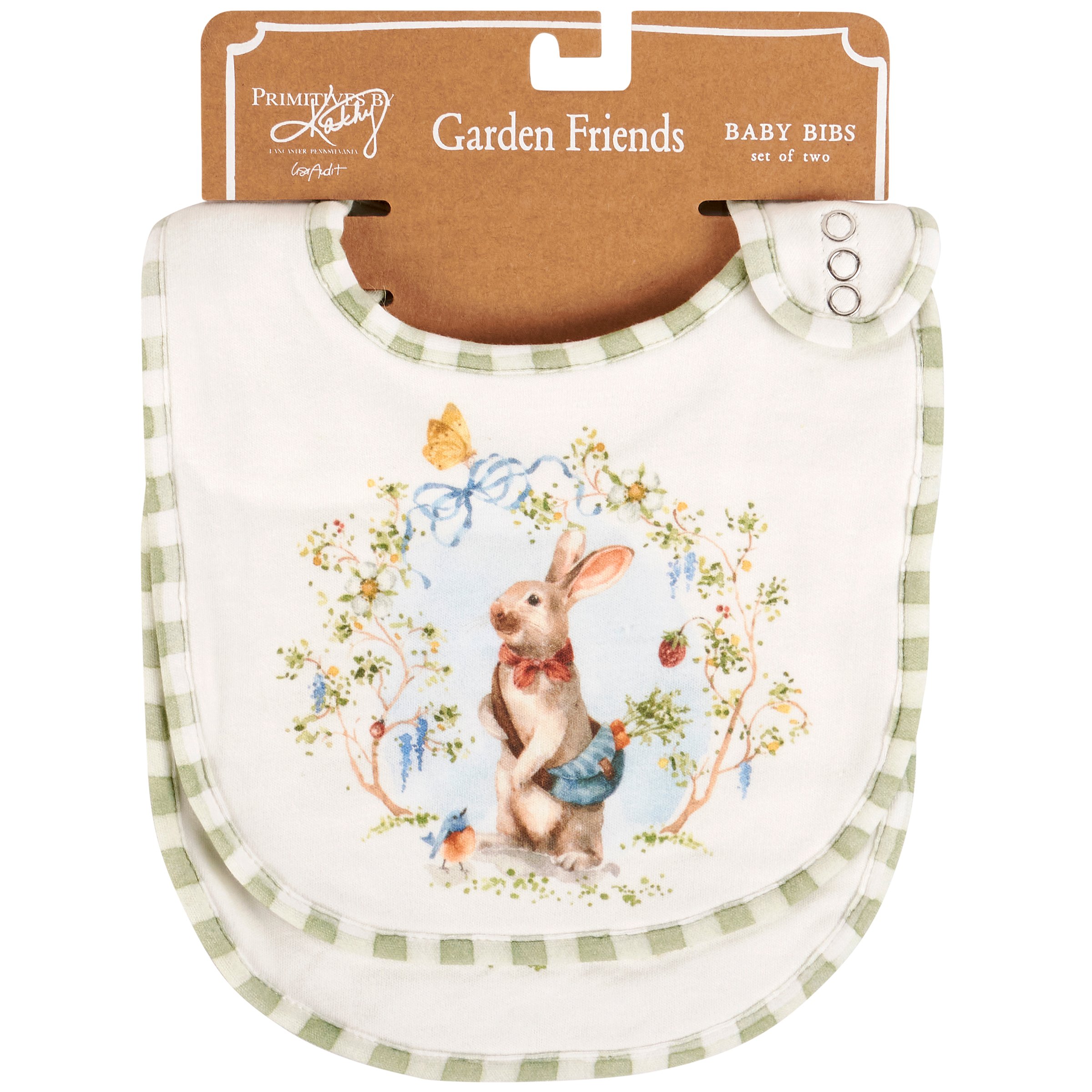 A set of two cotton bibs from our Baby & Kids Collection featuring charming storybook inspired designs on the front of each bib replicated from original art hand painted in a delicate watercolor style and coordinating gingham patterns on the back. Designs include a rabbit carrying a bag of carrots on one bib and a duck with a snail on the other. Cute garden bib set includes an adjustable metal snap closure and is conveniently machine-washable for easy cleaning. Our Garden Friend bibs are packaged on a single cardboard hanger to easily display and gift. A cute garden-themed gift set perfect for baby showers or everyday moments.
