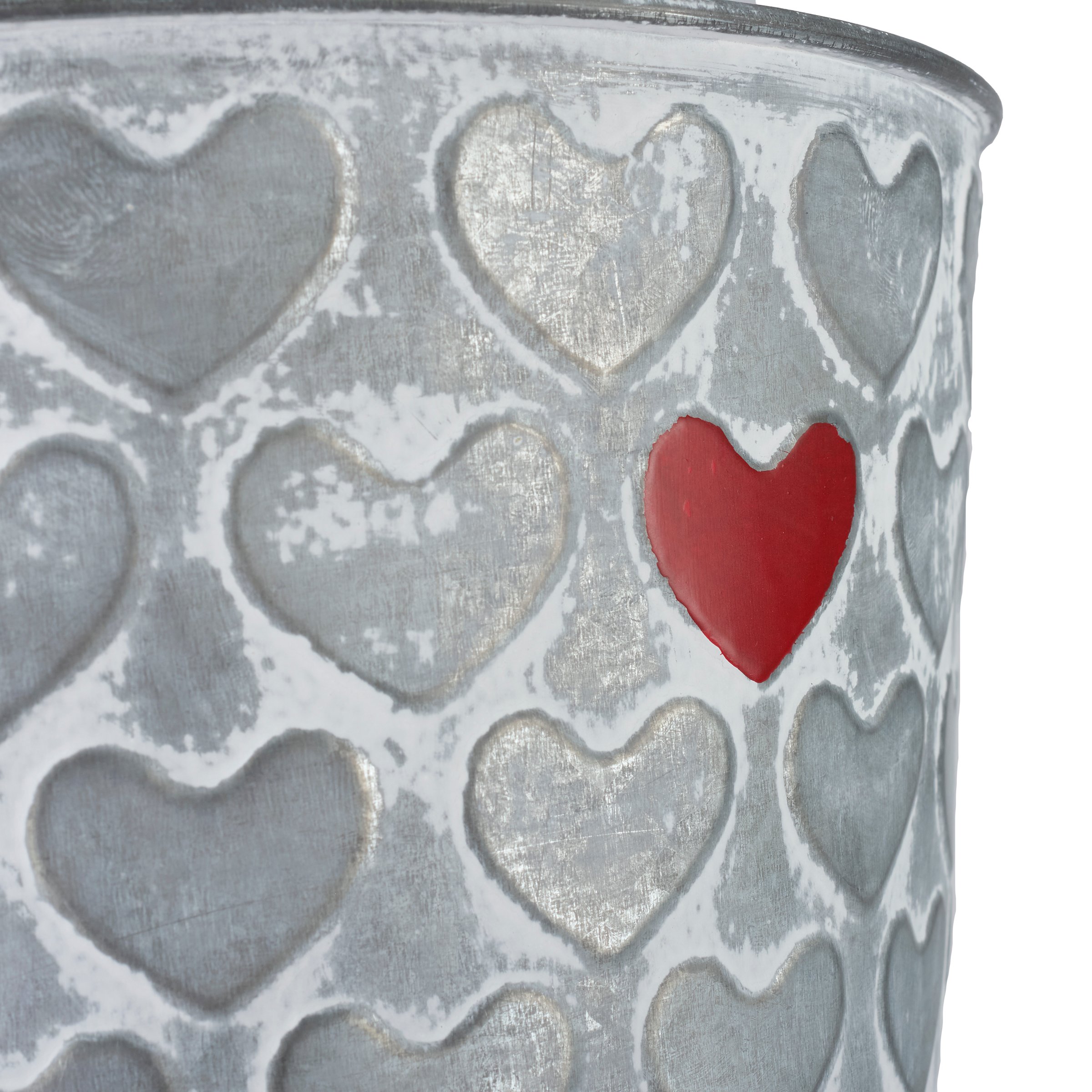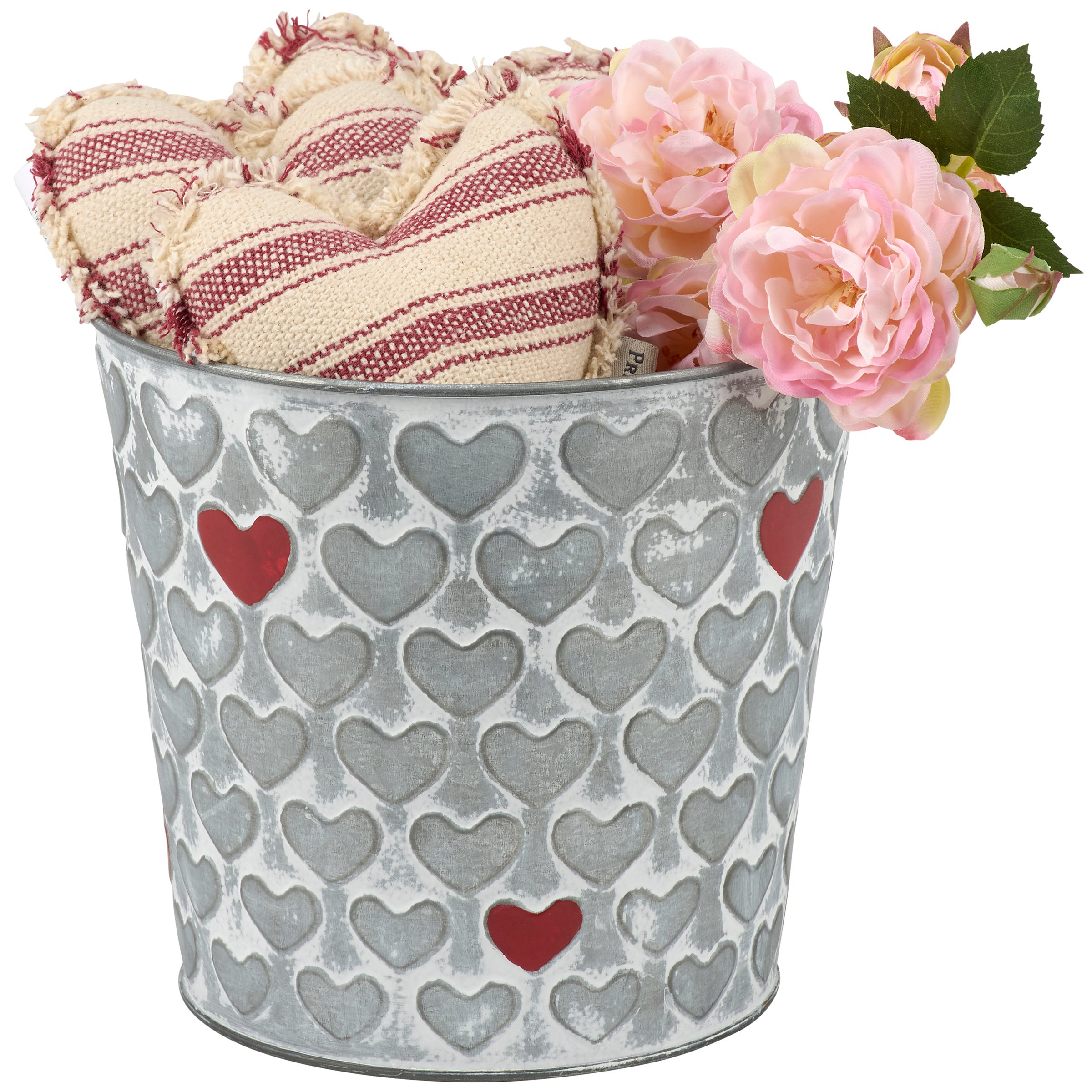 A metal bin from our Valentine's Day Collection displaying a fun pattern of heart designs with white dry brush details and painted red heart accents throughout. Valentine heart designs are embossed for added dimension. This seasonal bin is perfect for displaying Valentine's Day decor or storing holiday candy in style. Accessories pictured not included. Our Red Heart bin is a rustic Valentine's Day home accent with a variety of seasonal display options.