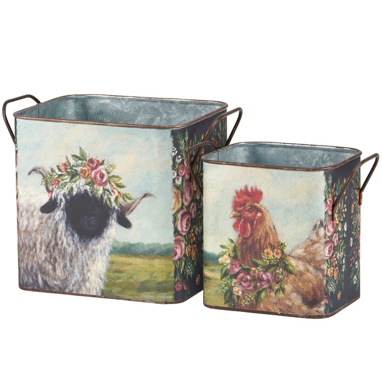 A set of two galvanized metal bins from our Easter & Spring Collection featuring enchanting hand painted scenes of farm animals wearing spring floral crowns or wreaths with complementing flower designs on the sides. Designs are replicated from original artwork painted onto burlap canvas, giving the art a unique depth and texture. Large bin displays a sheep on one side and highland cow on the other with small bin displaying a chicken and a goat. Our Floral Animals bin set includes dual side metal handles for easy carrying and nest inside each other for storage. Decorative use only; not food safe. Greenery pictured not included. A rustic seasonal home accent with a variety of display options.
