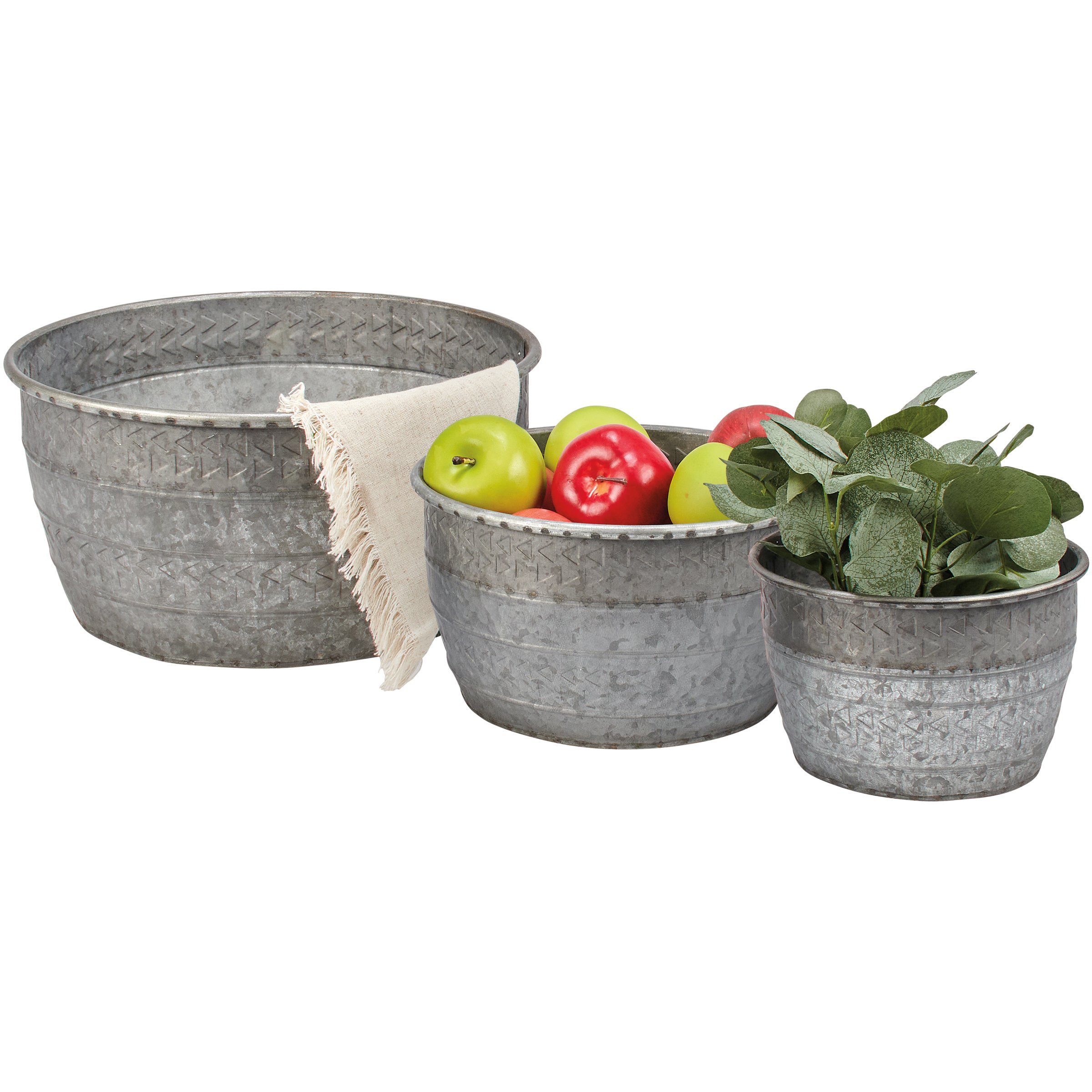A set of three galvanized metal bins in different sizes from our Western Collection featuring embossed patterns throughout to create a southwestern style. Southwestern bin set is perfect for holding small household objects or faux greenery. Accessories and greenery pictured not included. Metal bins nest inside each other for easy storage. Our Galvanized bins are a stylish western inspired home accent with a variety of display options.