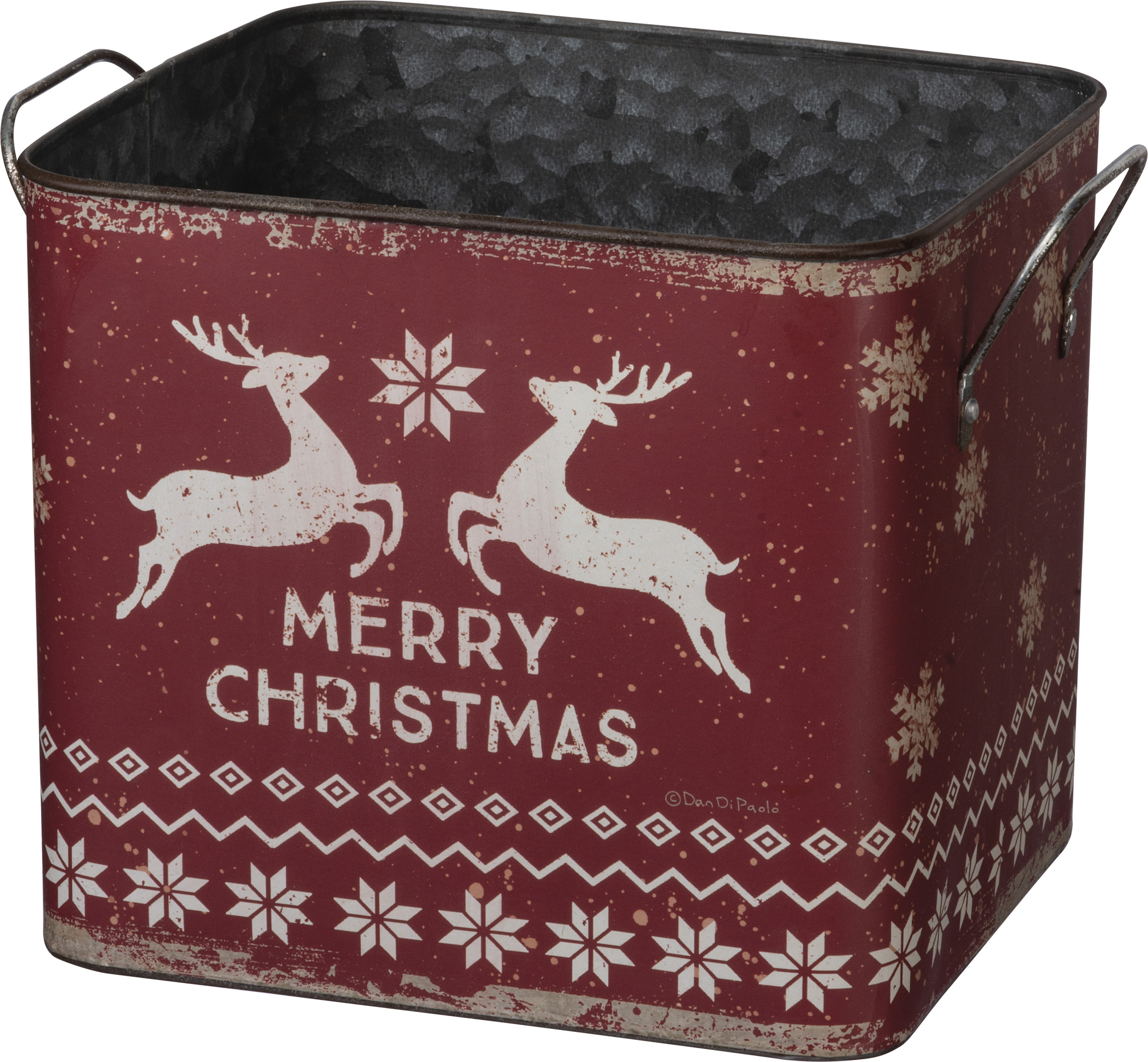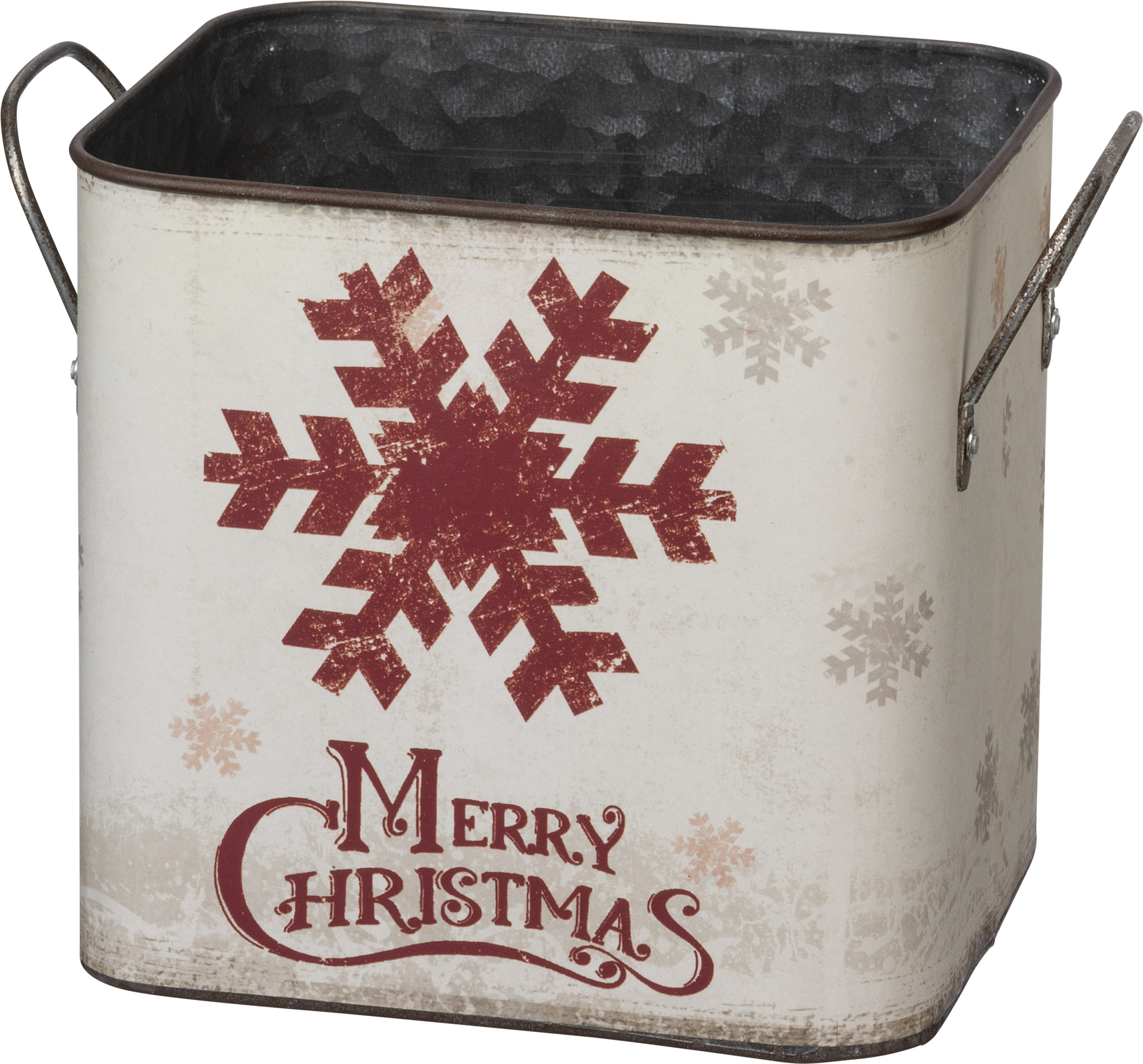 A set of two Nordic-inspired metal bins of varying sizes featuring double-sided "Merry Christmas" sentiments and wrap-around snowflake designs. Contains dual side handles for easy carrying.