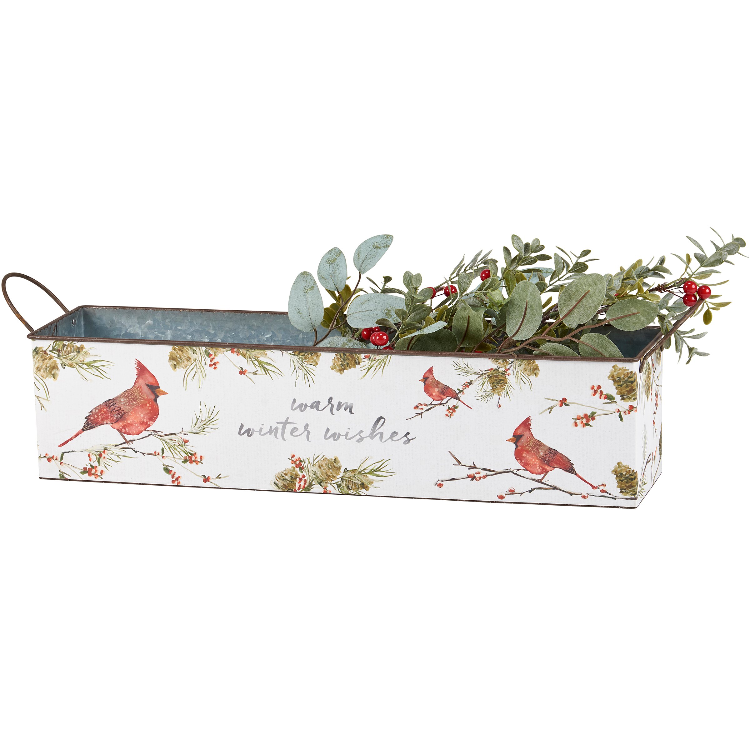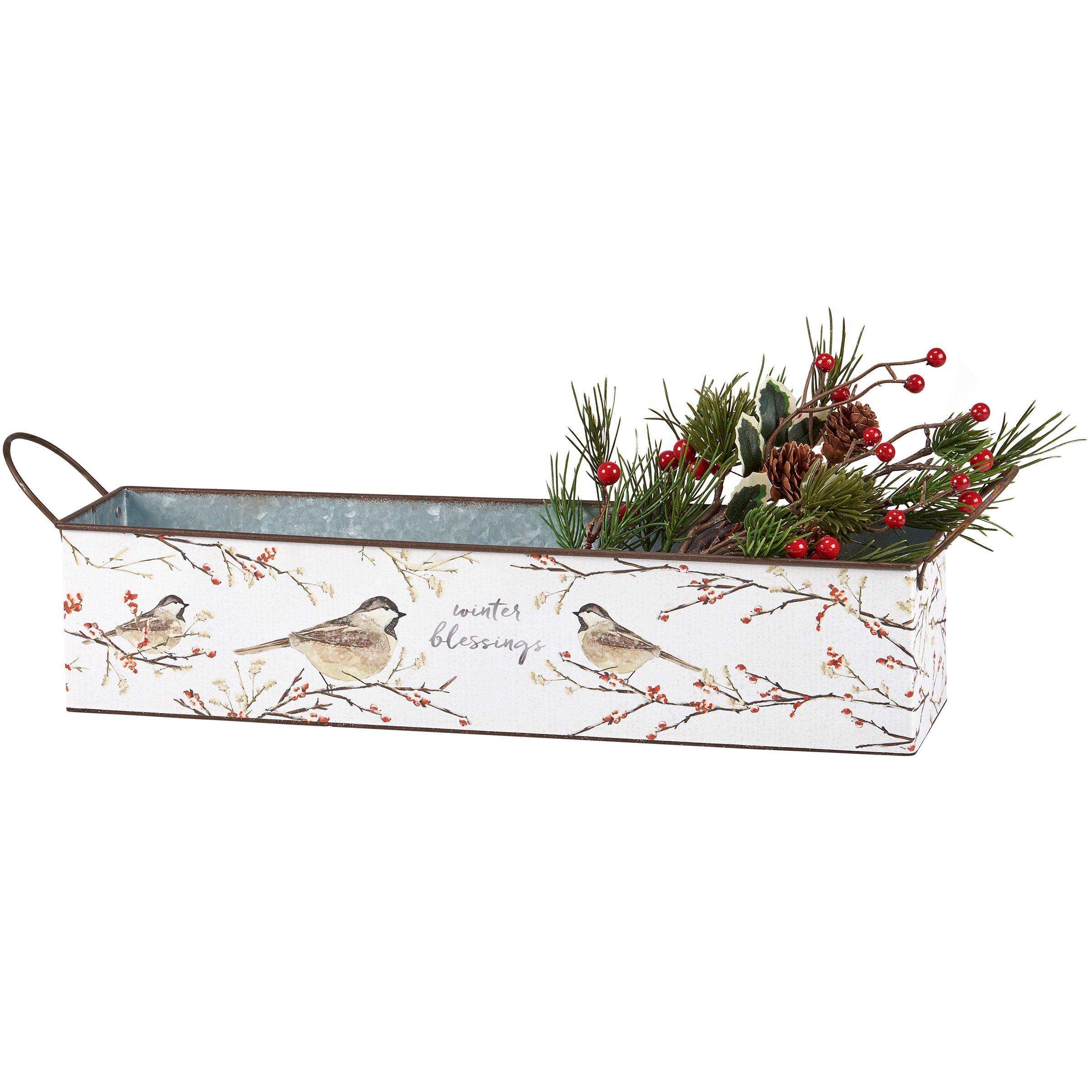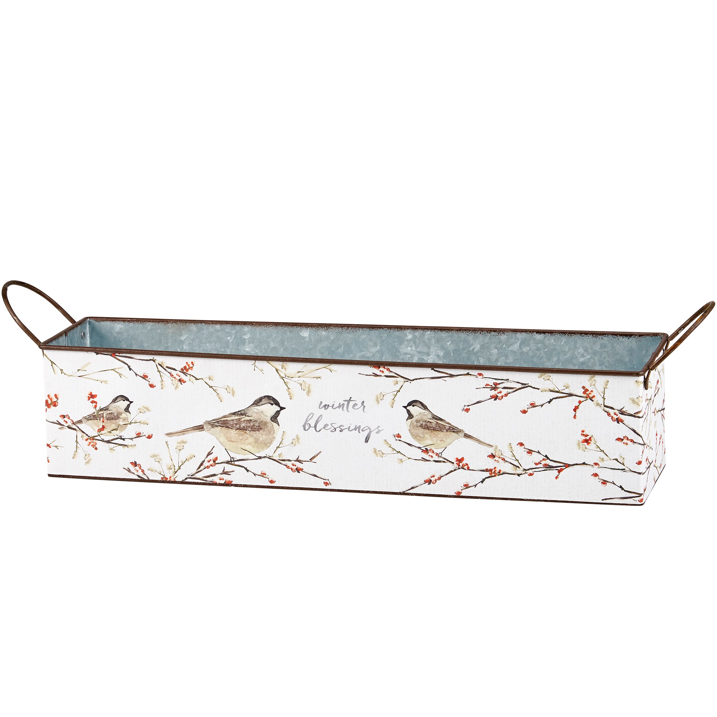 A galvanized metal bin set from our Christmas Collection including two different sized rectangular bins with metal handles on the sides that can nest within each other for easy storage. Each bin displays hand painted winter themed designs in a watercolor style. Larger bin displays a wrap-around design of cardinals on winter branches with "Warm Winter Wishes" sentiment on the front. Smaller bin displays a wrap-around design of birds on winter branches with "Winter Blessings" sentiment on the front. Our Warm Winter Wishes bin set is for decorative use only and is not food safe. Greenery shown is not included. A charming seasonal home accent with a variety of display options.