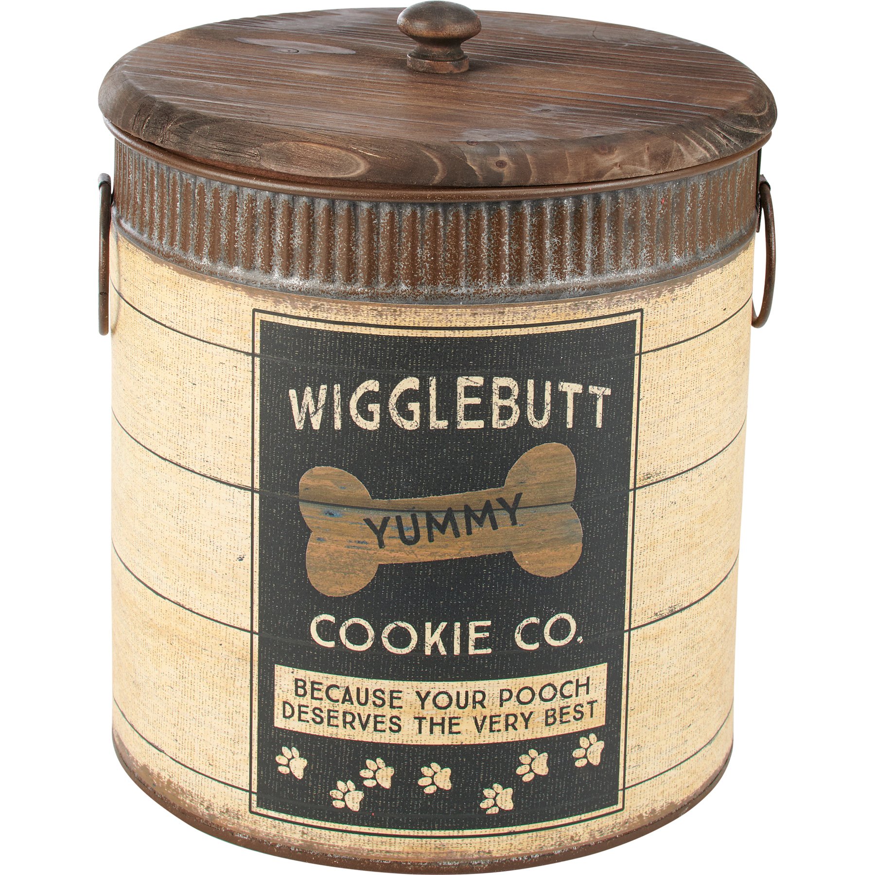 A galvanized metal bin set from our Pet Collection displaying wrap-around rustic pet-themed designs on each bin. Bin set includes two different sized bins with wooden lids and metal ring handles on the sides. Larger bin displays logo for "Wigglebutt Brand Kibble Bites" with "Your Dog Will Love It!" sentiment on the front and "It's Supper Time" sentiment on the back above a dog bone design. Smaller bin displays logo for "Wigglebutt Yummy Cookie Co." with "Because Your Pooch Deserves The Very Best" sentiment on the front and "Who's A Good Dog" sentiment on the back above a paw print design. Our Wigglebutt Cookie Co. bin set is a fun addition to any rustic space. Decorative use only. Not food safe.