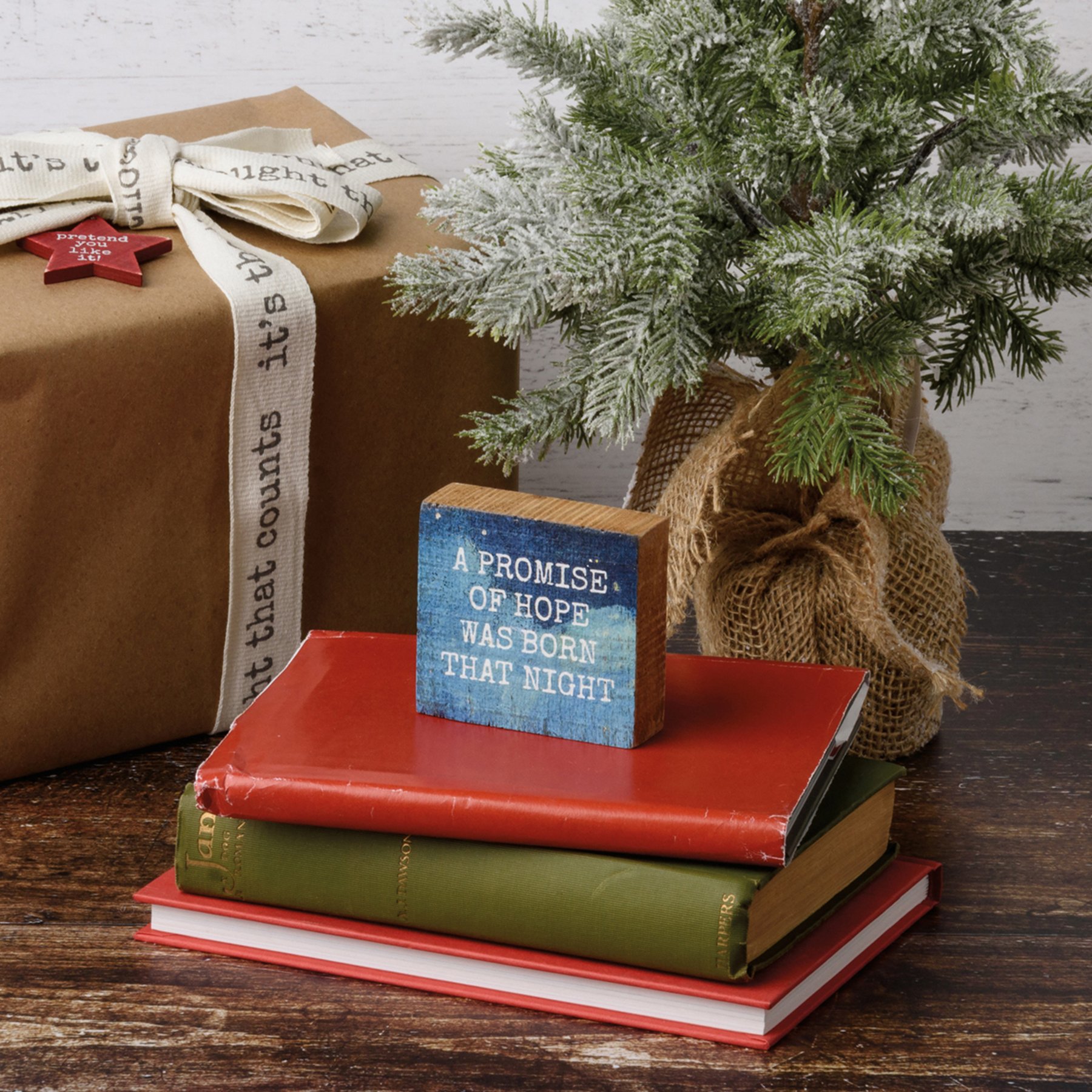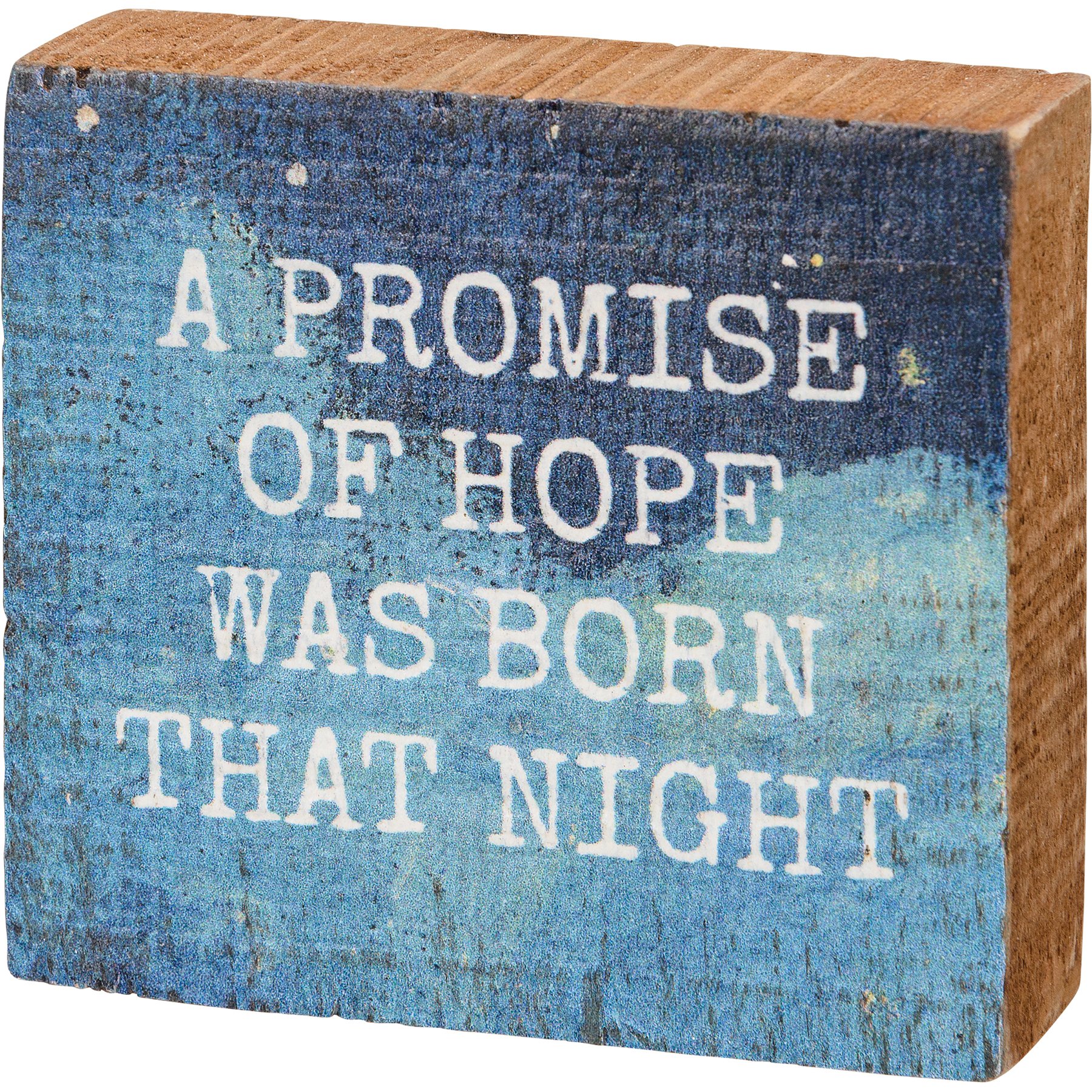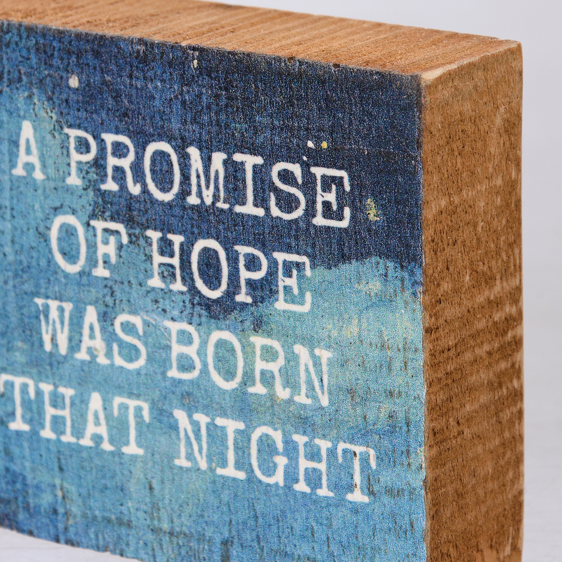A wooden block sign depicting a night sky with "A Promise Of Hope Was Born That Night" sentiment. Design is replicated from original artwork painted onto burlap canvas, giving the art a unique depth and texture. Easy to hang via predrilled keyhole slot or can free-stand alone.