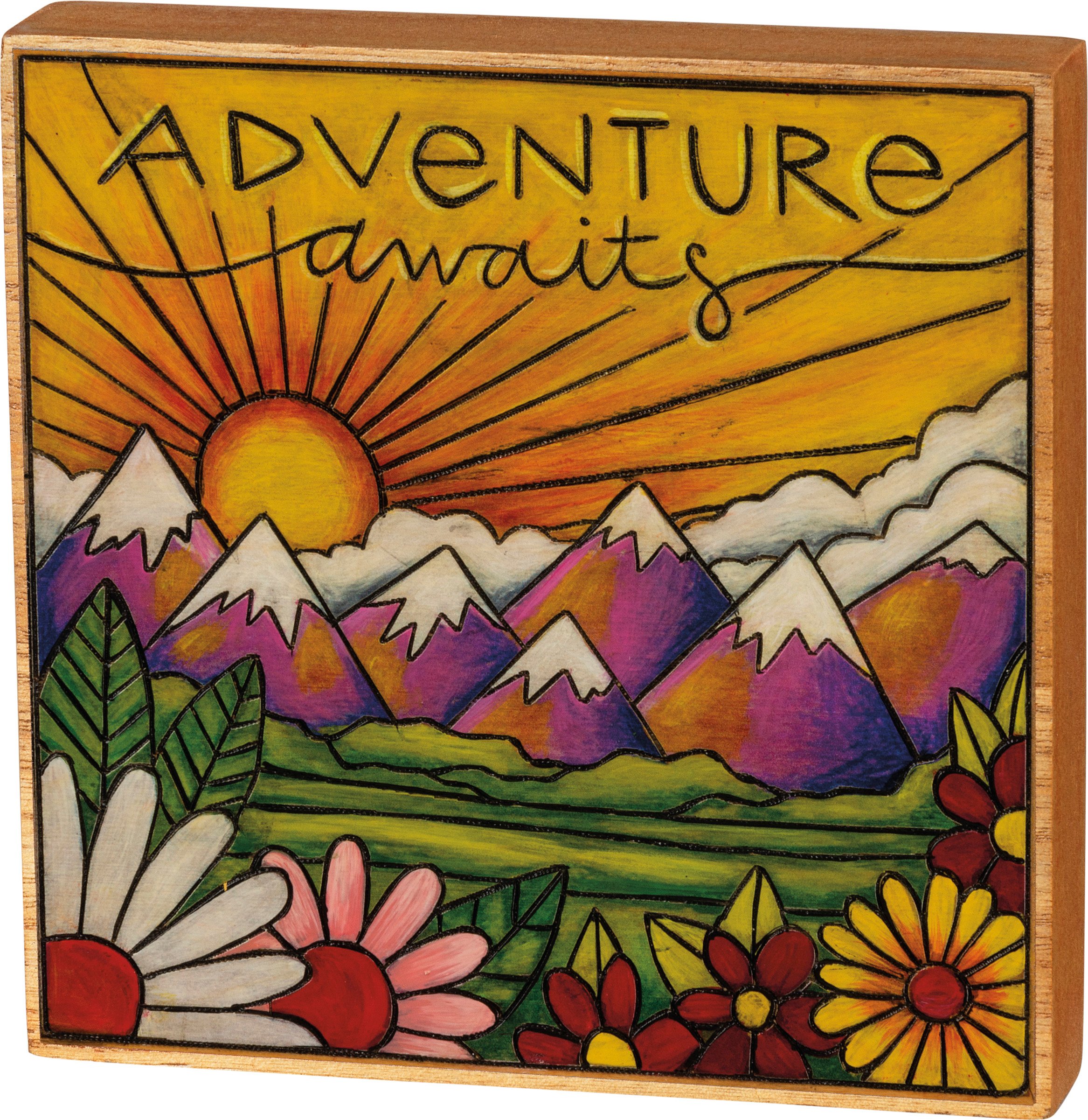 A vibrantly colored block sign featuring a hand lettered, woodburned "Adventure Awaits" sentiment with sun, mountain, meadow, and flower designs. Contains predrilled keyhole for easy hanging or can free-stand alone.