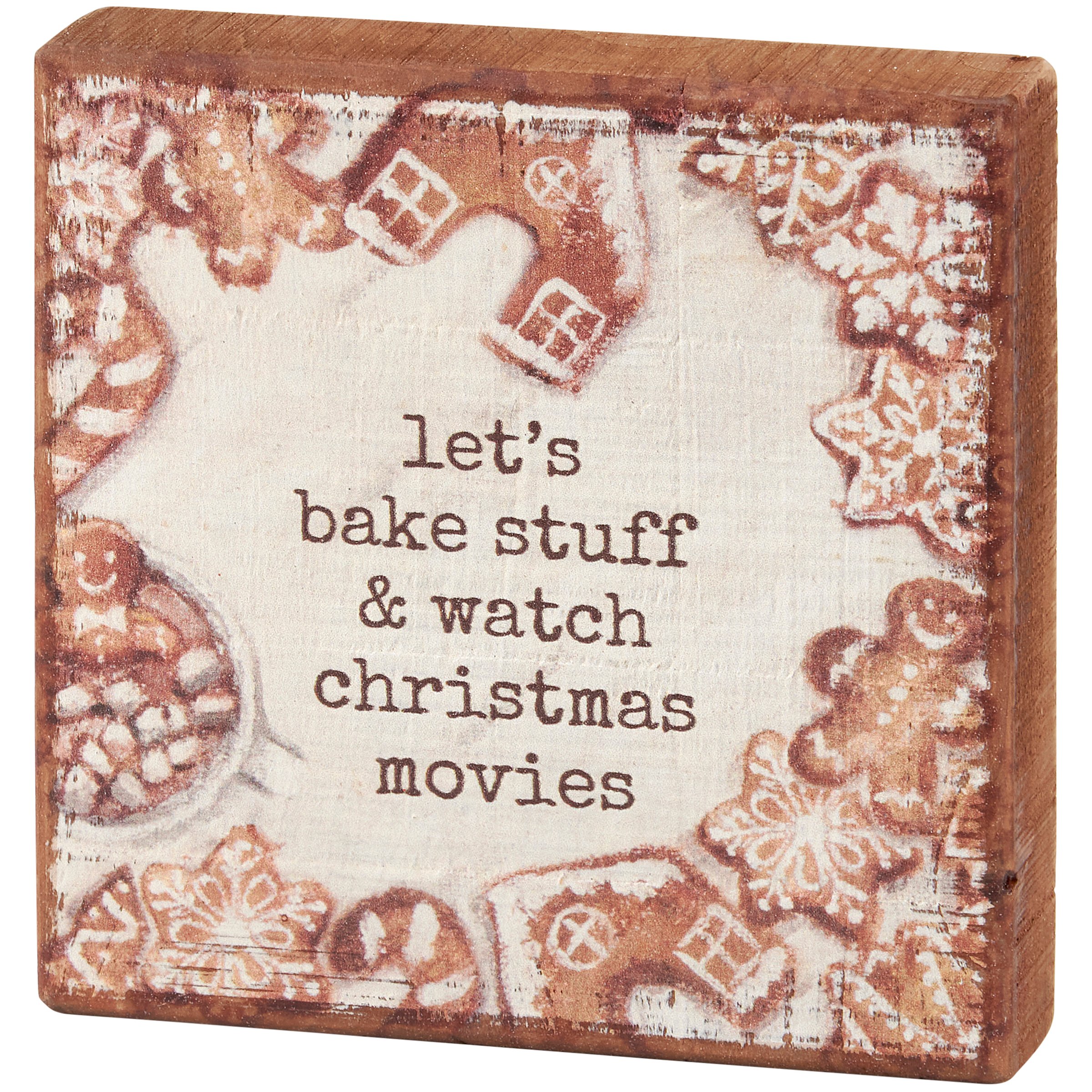 A wooden block sign from our Christmas Collection displaying various gingerbread cookies accenting a fun Christmas-themed sentiment that reads "Let's Bake Stuff & Watch Christmas Movies." Design is replicated from original artwork painted onto burlap canvas, giving the art a unique depth and texture. Seasonal block sign features distressed details with coordinating natural wood on the sides and back. Our Bake Stuff sign is easy to hang via predrilled keyhole slot or can free-stand alone. A rustic seasonal home accent great for gifting that can be easily displayed in any home or work space.