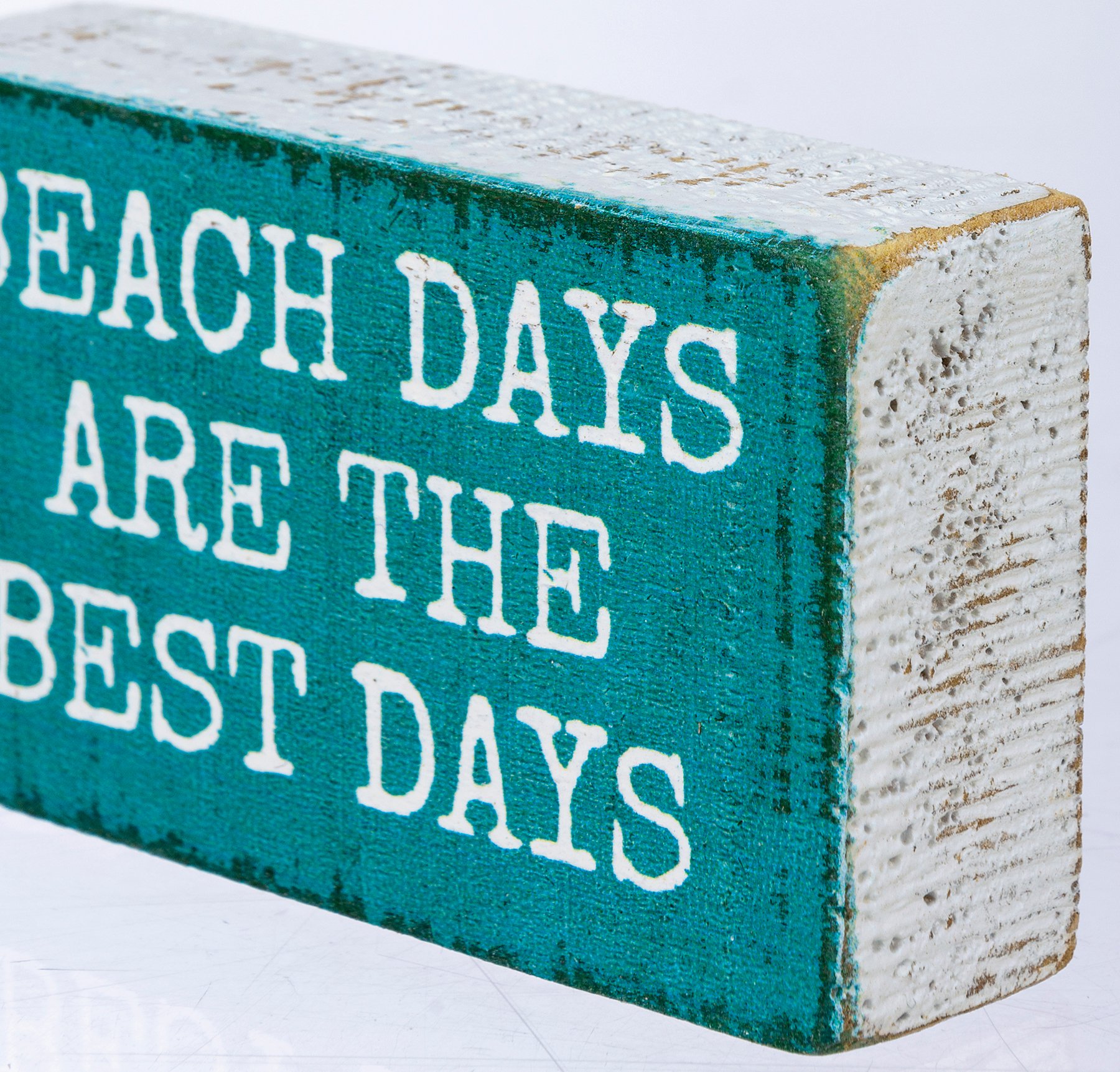 A wooden block sign featuring a "Beach Days Are The Best Days" sentiment in cream on a beachy blue background. Design is replicated from original artwork painted onto burlap canvas, giving the art a unique depth and texture. Distressed white sides make the design pop. Easy to hang via predrilled keyhole slot or can free-stand alone.