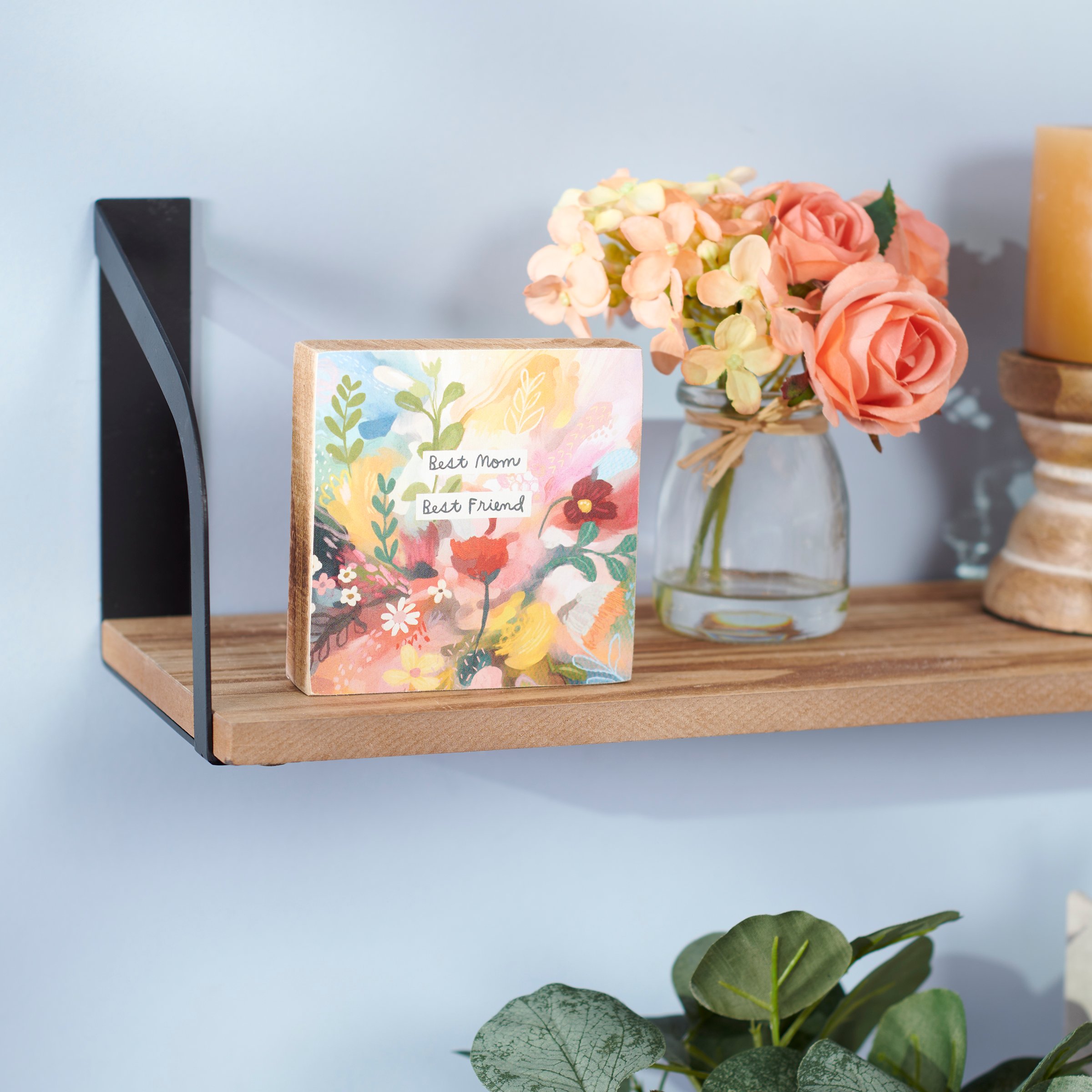 A colorful wooden block sign from our Mother's Day Collection displaying a vibrant hand illustrated design of flowers surrounding a heartwarming mom-themed sentiment that reads "Best Mom - Best Friend." Mom block sign features coordinating natural wood on the sides and back. Our Best Mom Best Friend block sign is easy to hang via predrilled keyhole slot or can free-stand alone. A lovely Mother's Day gift perfect for an everyday home accent.