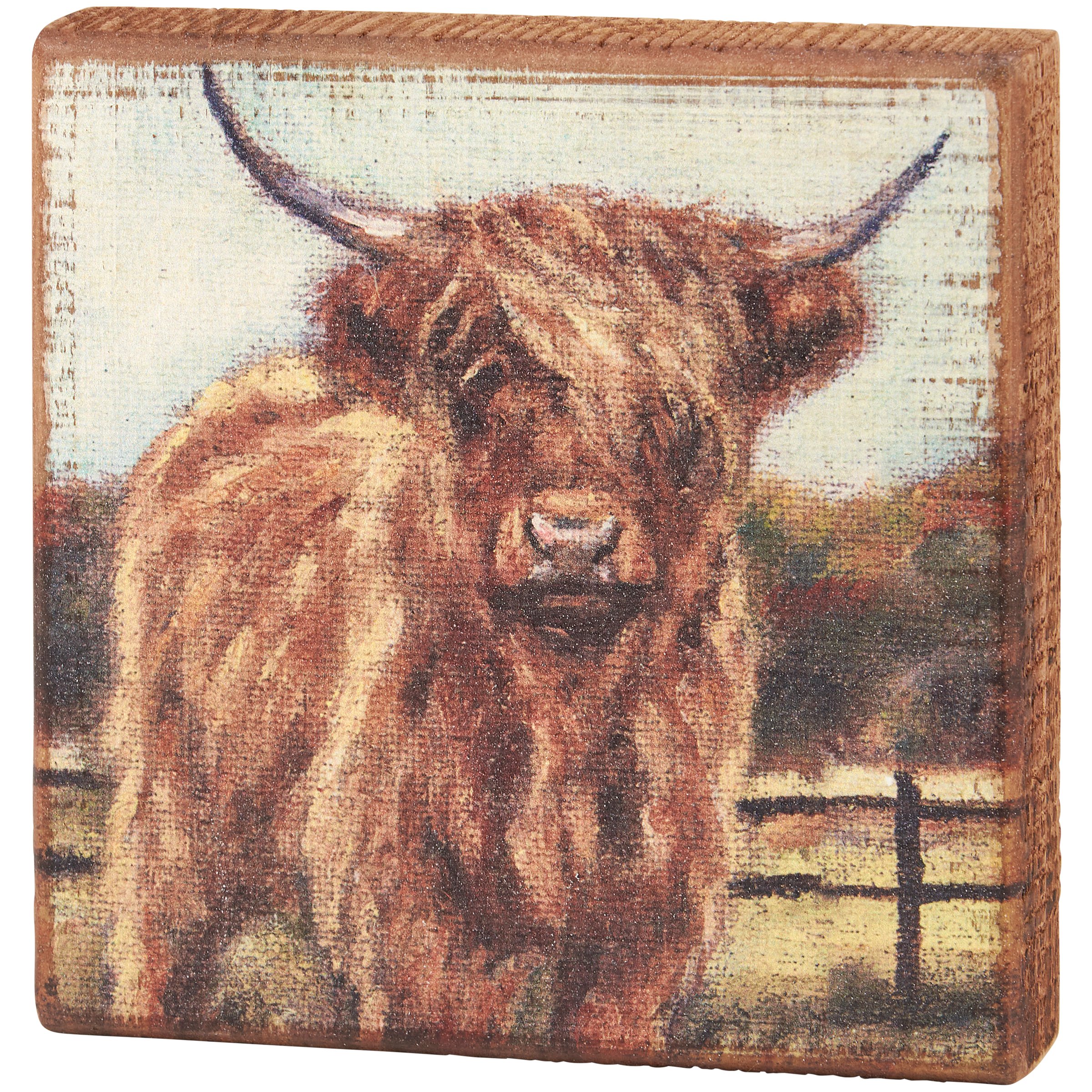 A wooden block sign from our Fall & Harvest Collection displaying a hand painted fall scene of a highland cow in a field. Design is replicated from original artwork painted onto burlap canvas, giving the art a unique depth and texture. Seasonal block sign features distressed details with coordinating natural wood on the sides and back. Our Fall Highland sign is easy to hang via predrilled keyhole slot or can free-stand alone. A rustic seasonal home accent that can be easily displayed in any home or work space.
