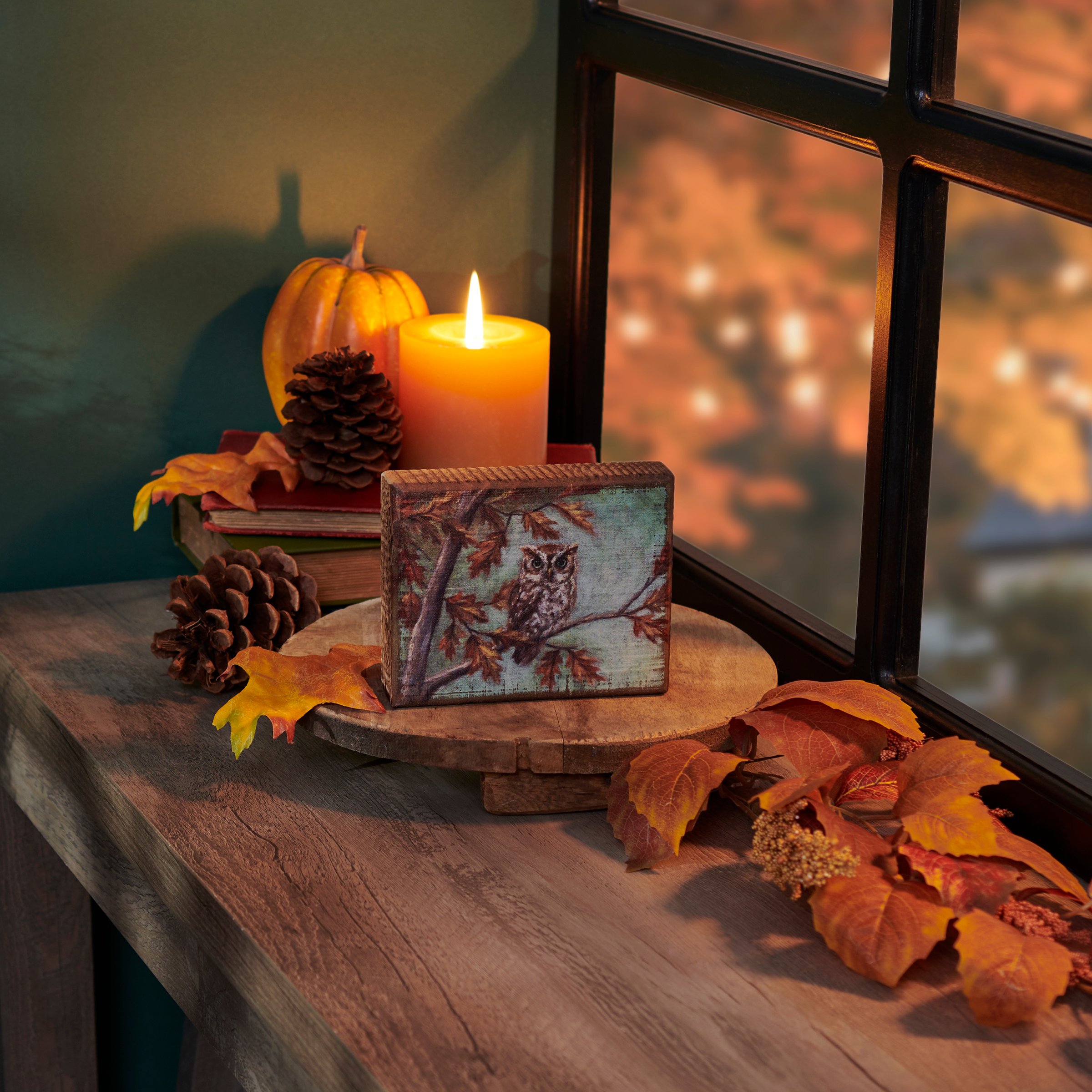A wooden block sign from our Fall & Harvest Collection displaying a hand painted fall scene of an owl on a tree branch. Design is replicated from original artwork painted onto burlap canvas, giving the art a unique depth and texture. Seasonal block sign features distressed details with coordinating natural wood on the sides and back. Our Fall Owl sign is easy to hang via predrilled keyhole slot or can free-stand alone. A rustic seasonal home accent that can be easily displayed in any home or work space.
