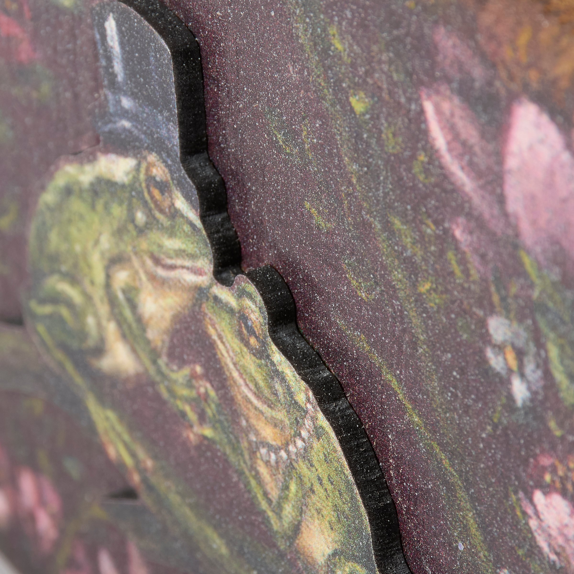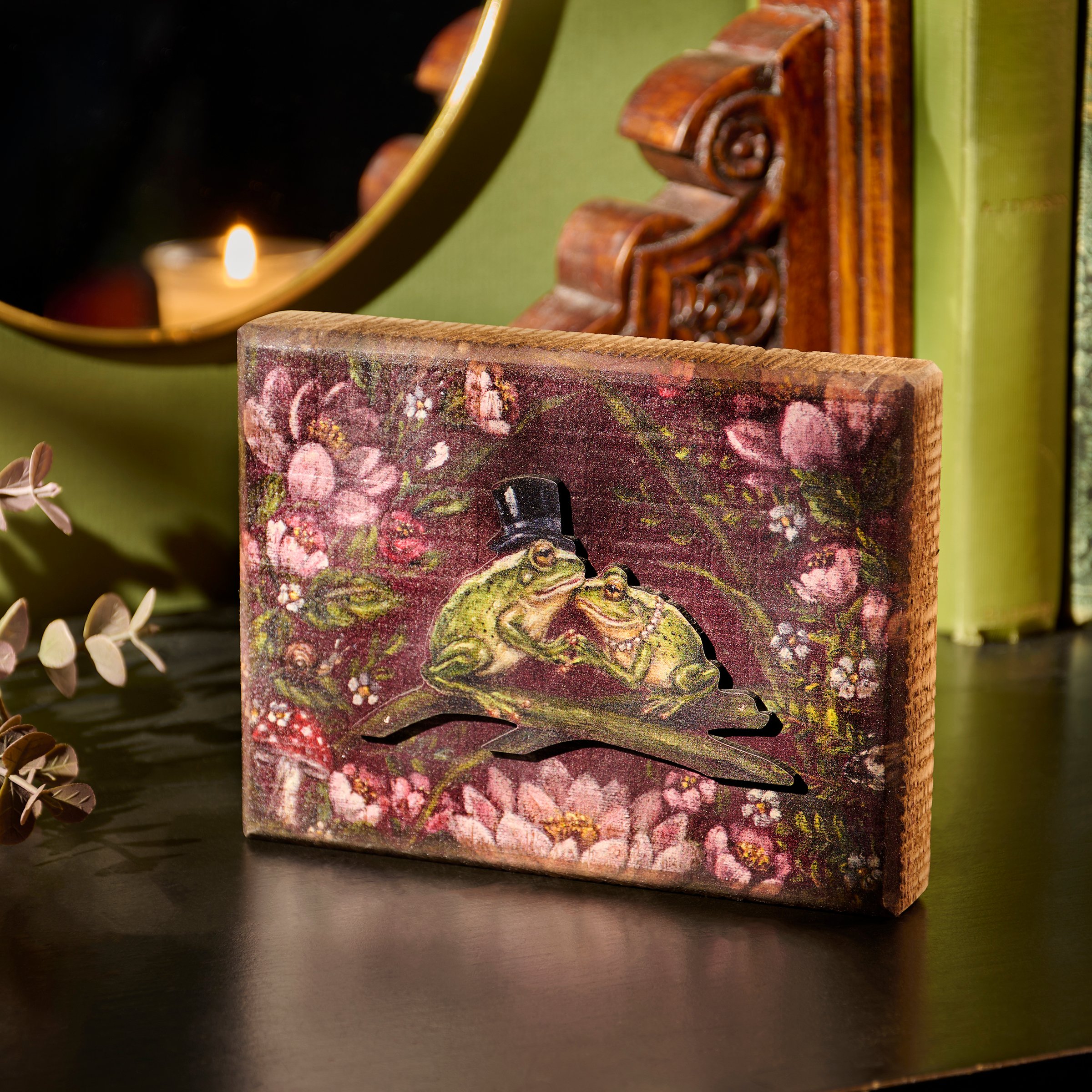 A wooden block sign from our Valentine's Day Collection displaying a heartwarming scene of moody florals surrounding a cute frog couple on separate wooden cutouts for added dimension. Valentine frogs design is replicated from original artwork painted onto burlap canvas, giving the art a unique depth and texture. This seasonal block sign features distressed details with coordinating natural wood on the sides and back. Our Frog Love sign is easy to hang via a predrilled keyhole slot on the back or can free-stand on a flat surface for display. A moody Valentine's Day home accent that can be easily displayed in any home or work space.