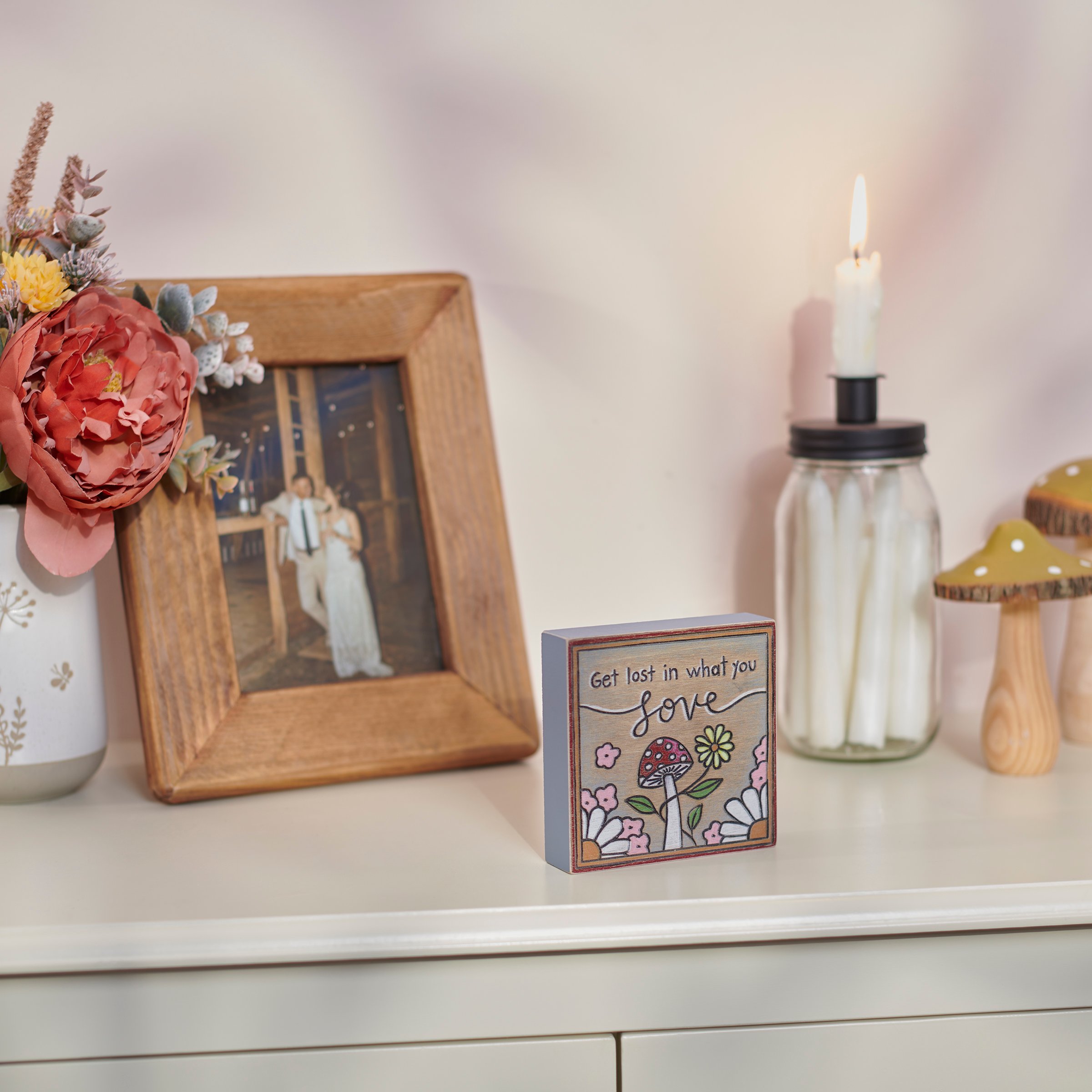 A wooden block sign from our Valentine's Day Collection displaying a unique hand illustrated design of a flower wrapped around a mushroom under a heartwarming sentiment that reads "Get Lost In What You Love." Love-themed block sign features wood burned details for added texture with coordinating blue color on the sides and natural wood on the back. Our Get Lost In What You Love block sign is easy to hang via predrilled keyhole slot or can free-stand alone. A love-themed home accent great for gifting that can be easily displayed in any home or work space.