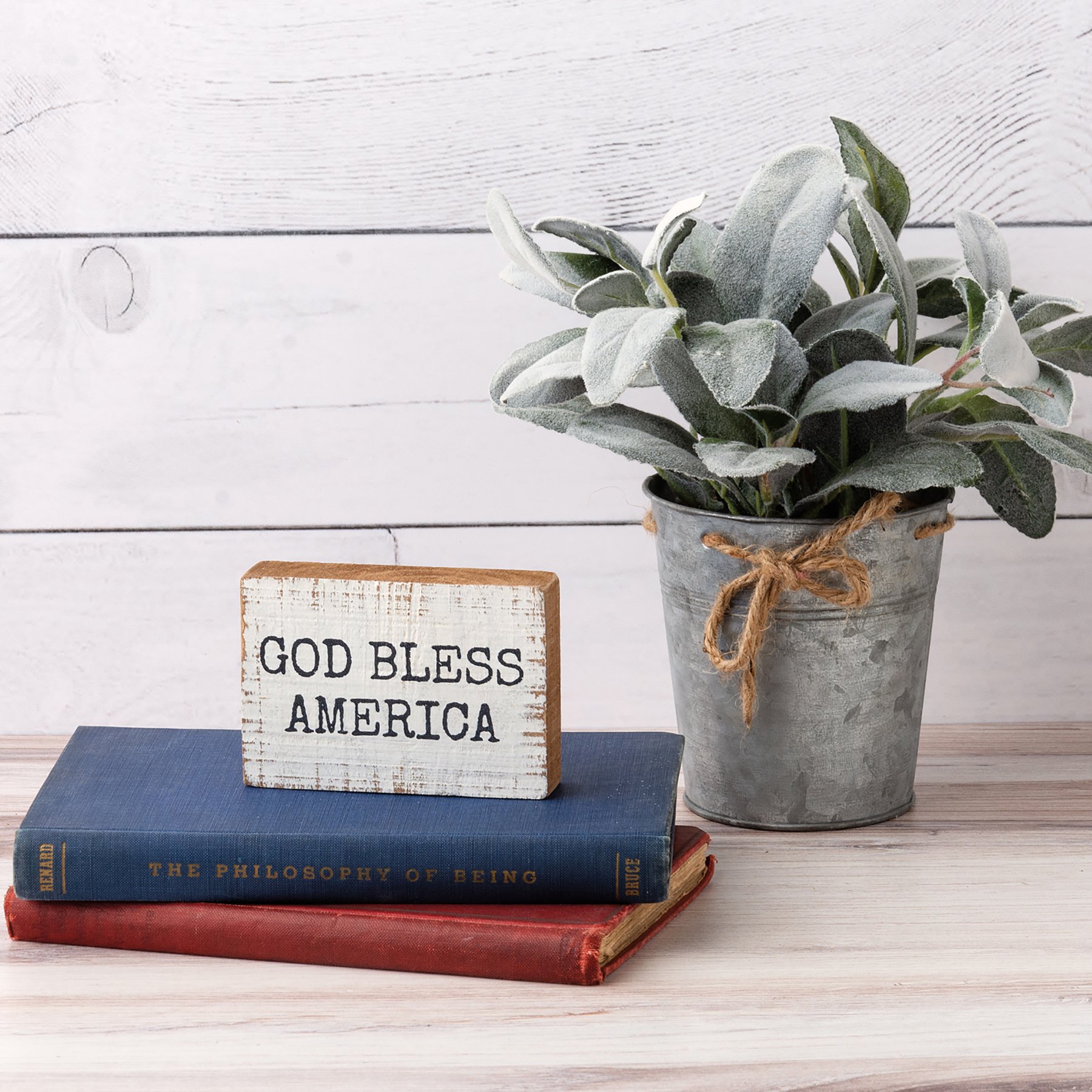 A wooden block sign from our Patriotic Collection featuring patriotic "God Bless America" sentiment. Natural wood sides make the design pop. Design is replicated from original artwork painted onto burlap canvas, giving the art a unique depth and texture. This God Bless America sign is easy to hang via predrilled keyhole slot or can free-stand alone.