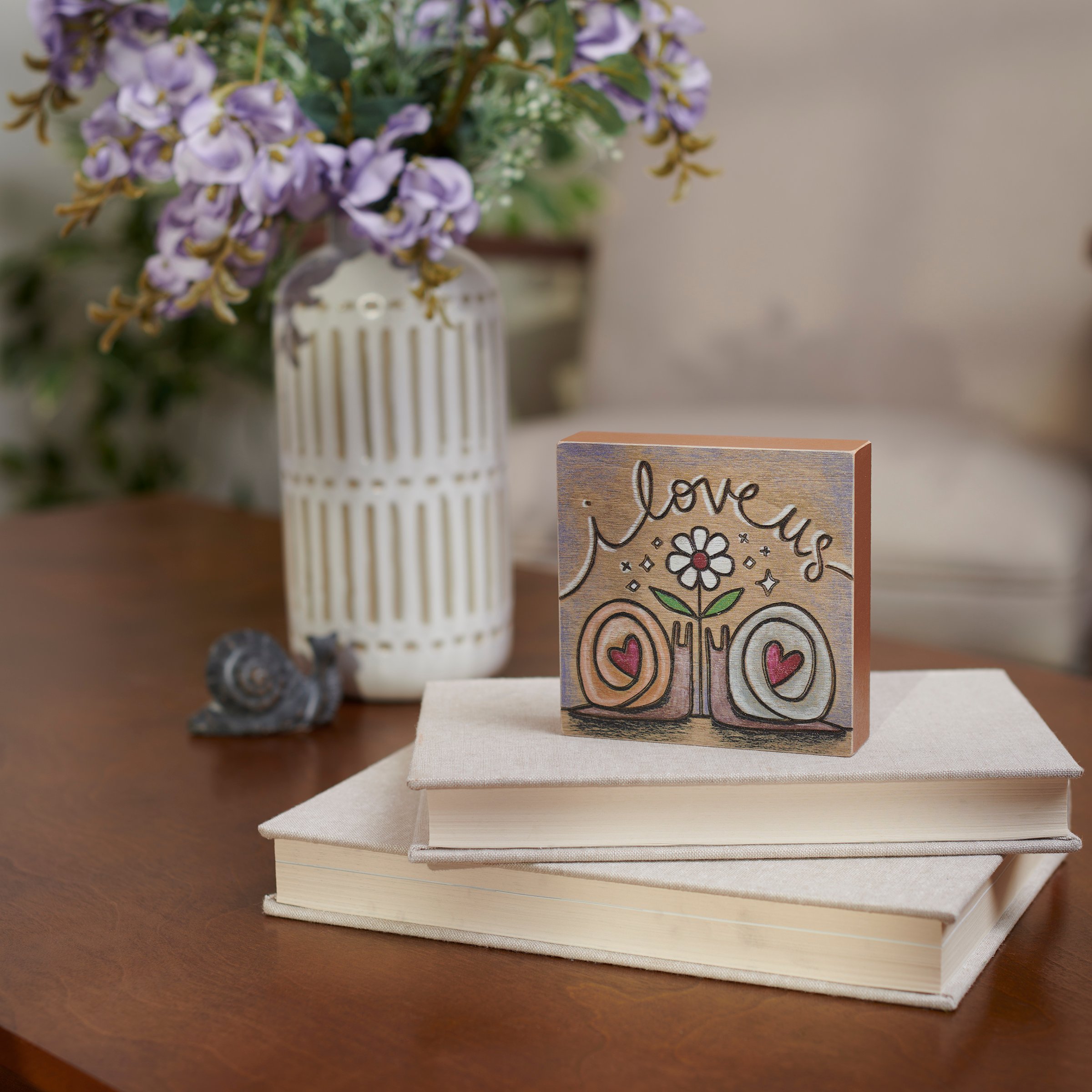 A wooden block sign from our Valentine's Day Collection displaying a unique hand illustrated design of a flower and snails with hearts on their shells under a heartwarming sentiment that reads "I Love Us." Love-themed block sign features wood burned details for added texture with coordinating blue color on the sides and natural wood on the back. Our I Love Us block sign is easy to hang via predrilled keyhole slot or can free-stand alone. A love-themed home accent great for gifting that can be easily displayed in any home or work space.
