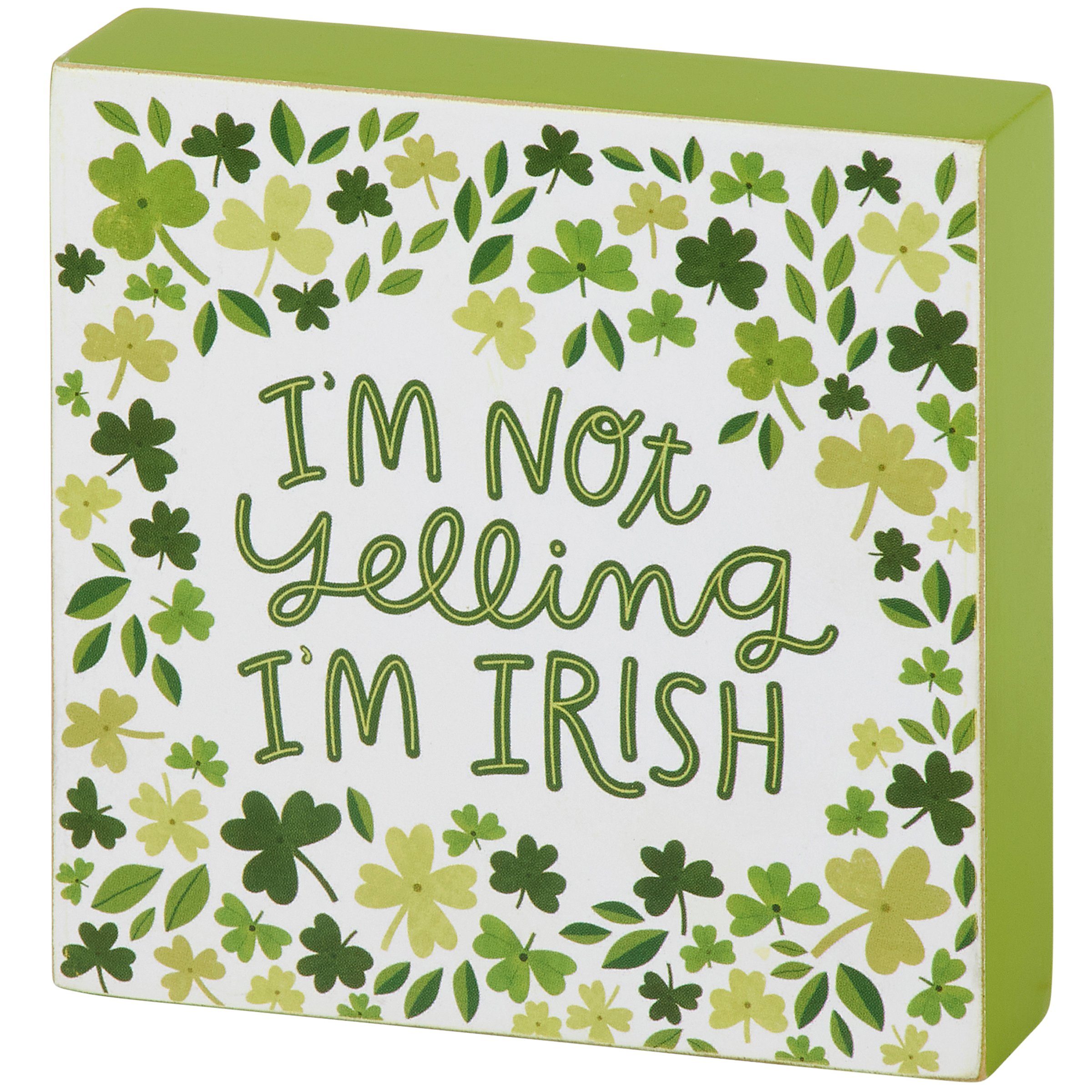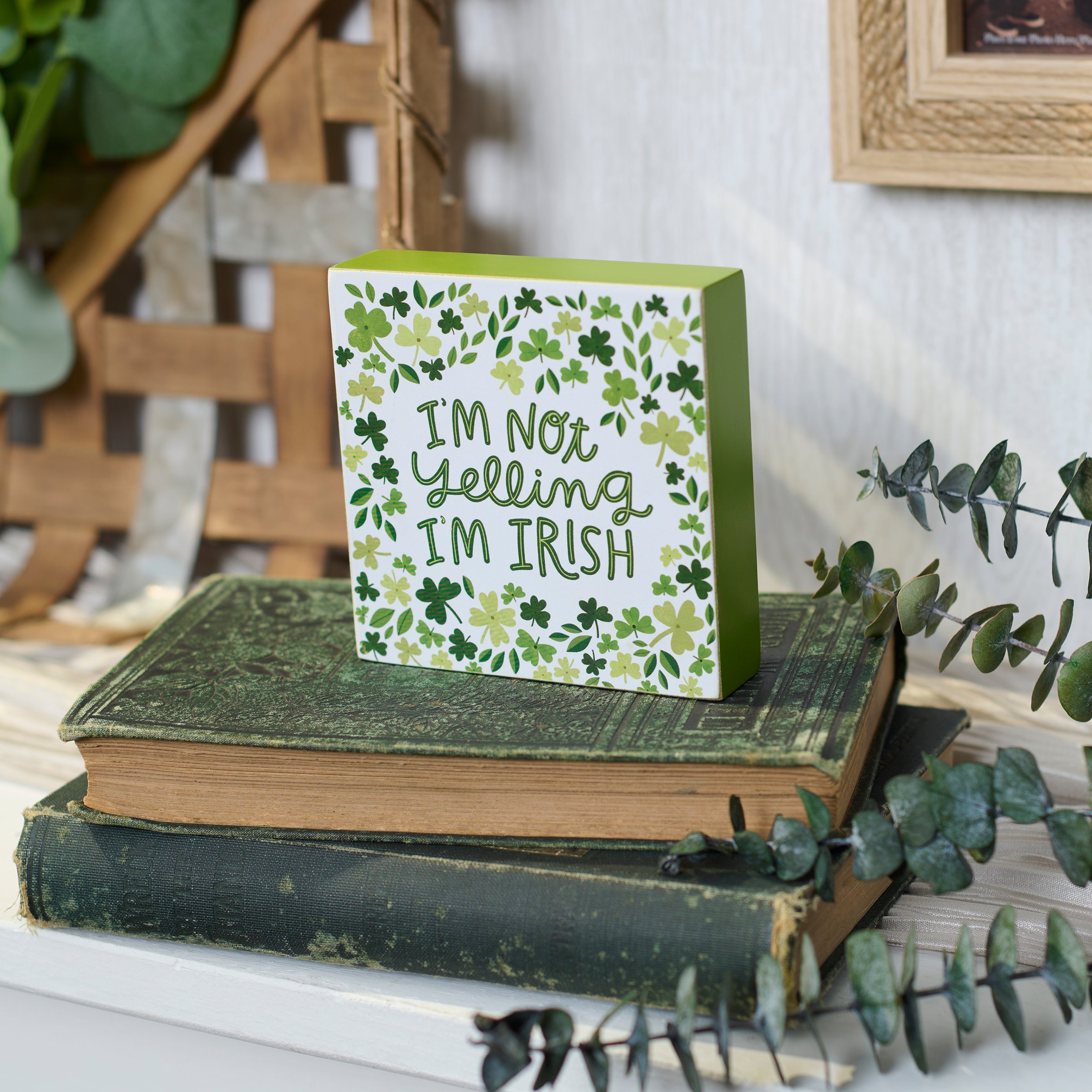 A wooden block sign from our St. Patrick's Day Collection displaying a shamrock toss pattern surrounding a fun Irish inspired sentiment that reads "I'm Not Yelling - I'm Irish." St. Patrick's Day inspired design is replicated from original hand illustrated artwork. This fun St. Patrick's Day block sign features distressed details with a coordinating green color on the sides and back. Our I'm Not Yelling I'm Irish sign is easy to hang via a predrilled keyhole slot on the back or can free-stand on a flat surface for display. A fun St. Patrick's Day home accent that can be easily displayed in any home or work space.