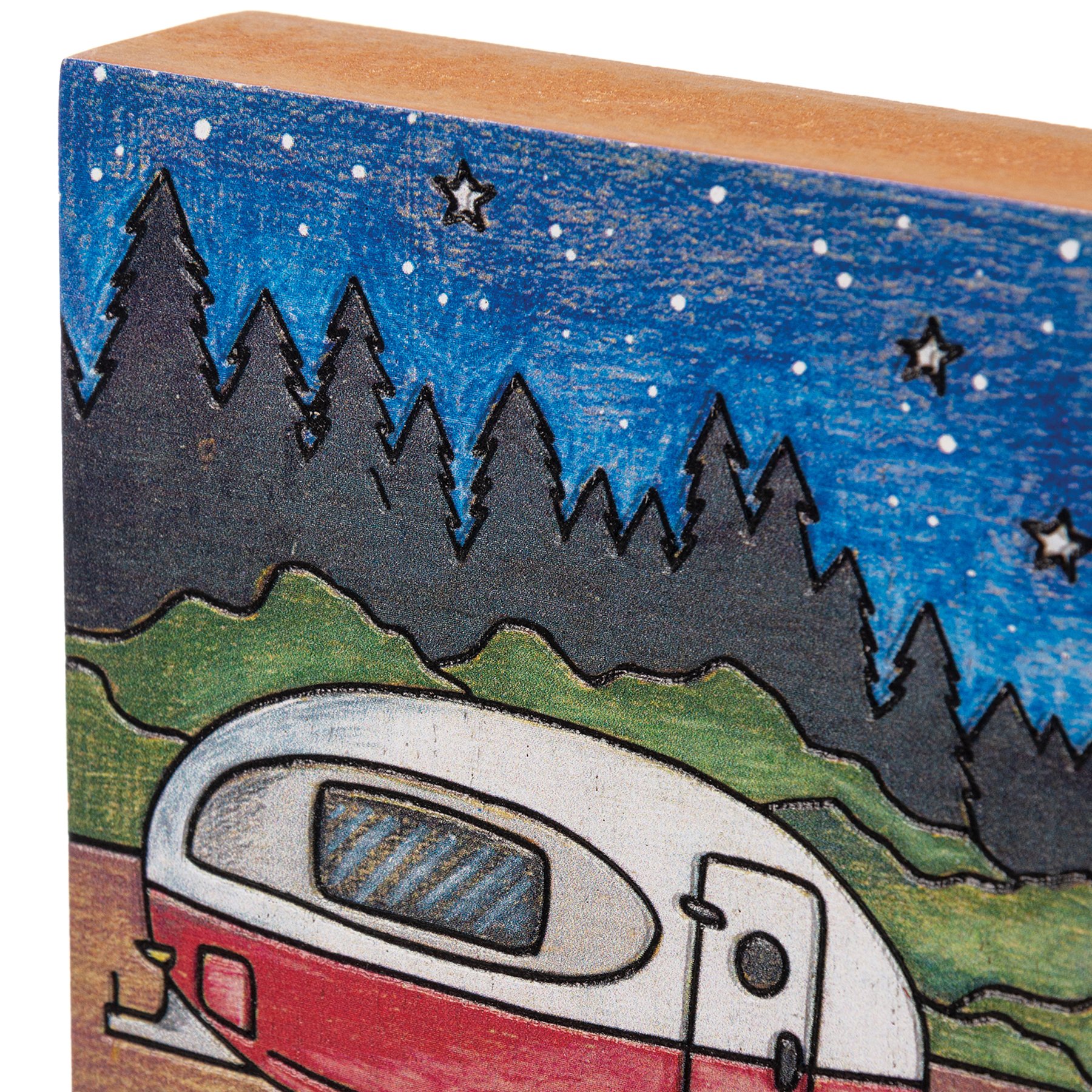 A wooden block sign featuring "Life Is Better By A Campfire." sentiment with wood burned camper and campfire and vibrant geometric designs. Natural wood sides make the design pop. Wooden wall art is easy to hang via predrilled keyhole slot or can free-stand alone.