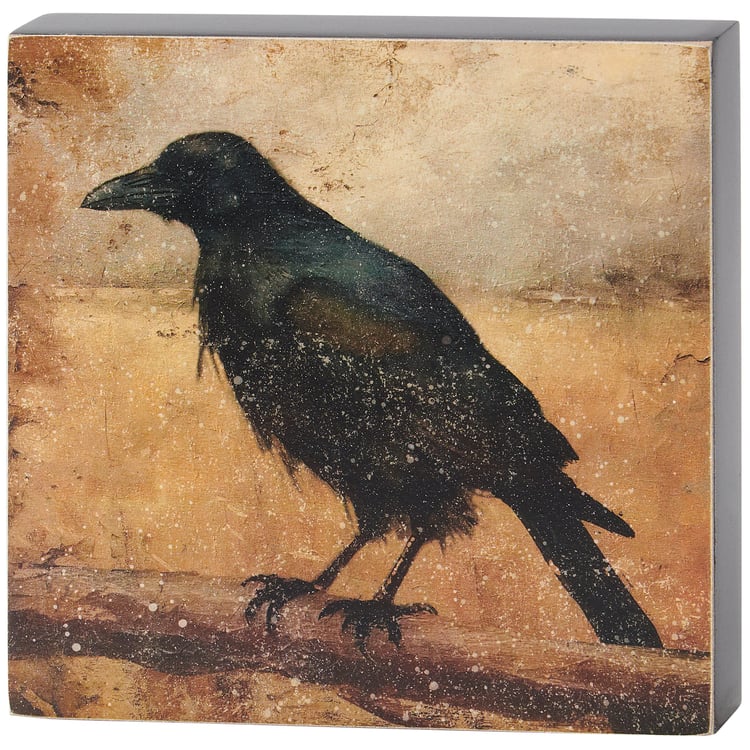 A wooden block sign from our Halloween Collection displaying a rustic scene of a raven in front of a harvest field. Seasonal block sign features distressed details with coordinating black color on the sides and back. Our Lone Raven block sign is easy to hang via predrilled keyhole slot or can free-stand alone. A rustic seasonal home accent that can be easily displayed in any home or work space.
