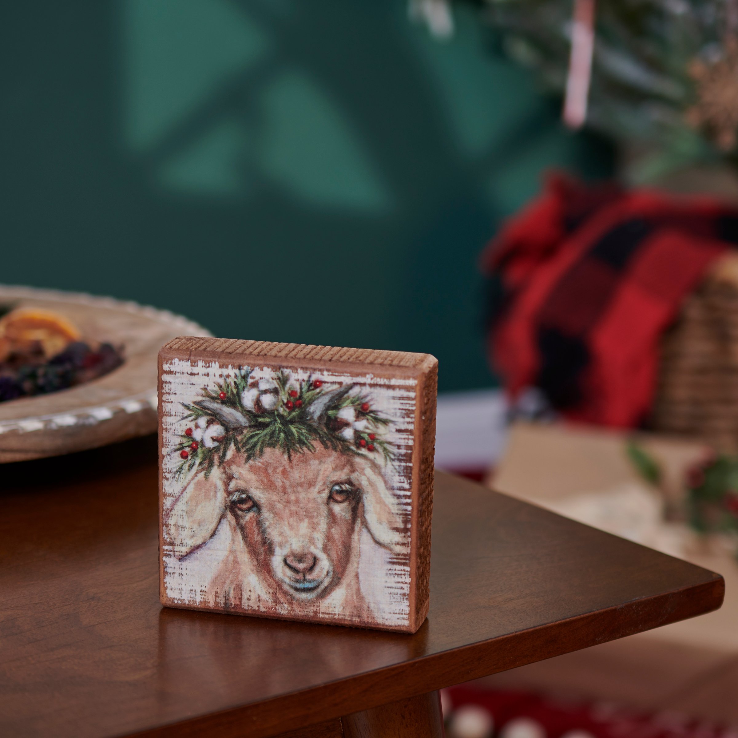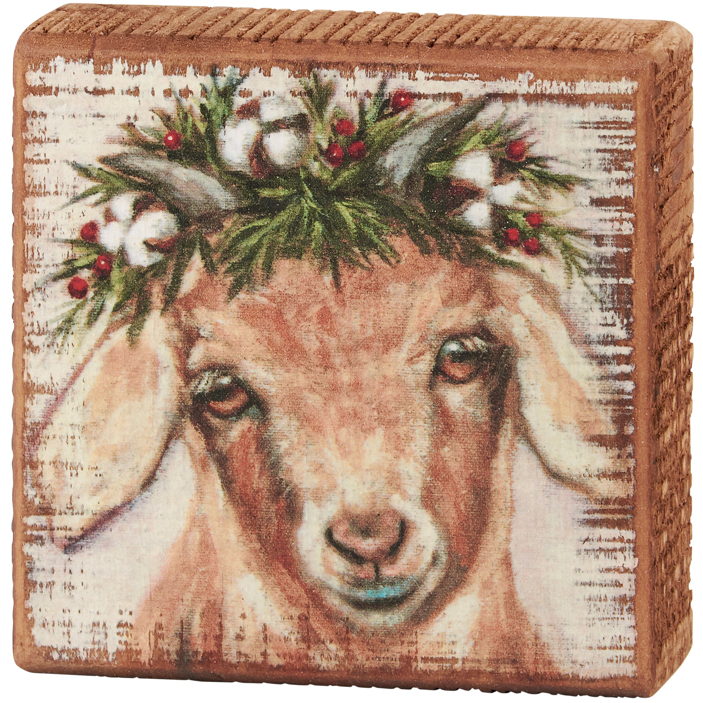 A wooden block sign from our Christmas Collection displaying a charming hand painted goat wearing a festive Christmas crown. Design is replicated from original artwork painted onto burlap canvas, giving the art a unique depth and texture. Seasonal block sign features distressed details with coordinating natural wood on the sides and back. Our Merry Goat sign is easy to hang via predrilled keyhole slot or can free-stand alone. A rustic seasonal home accent great for gifting that can be easily displayed in any home or work space.