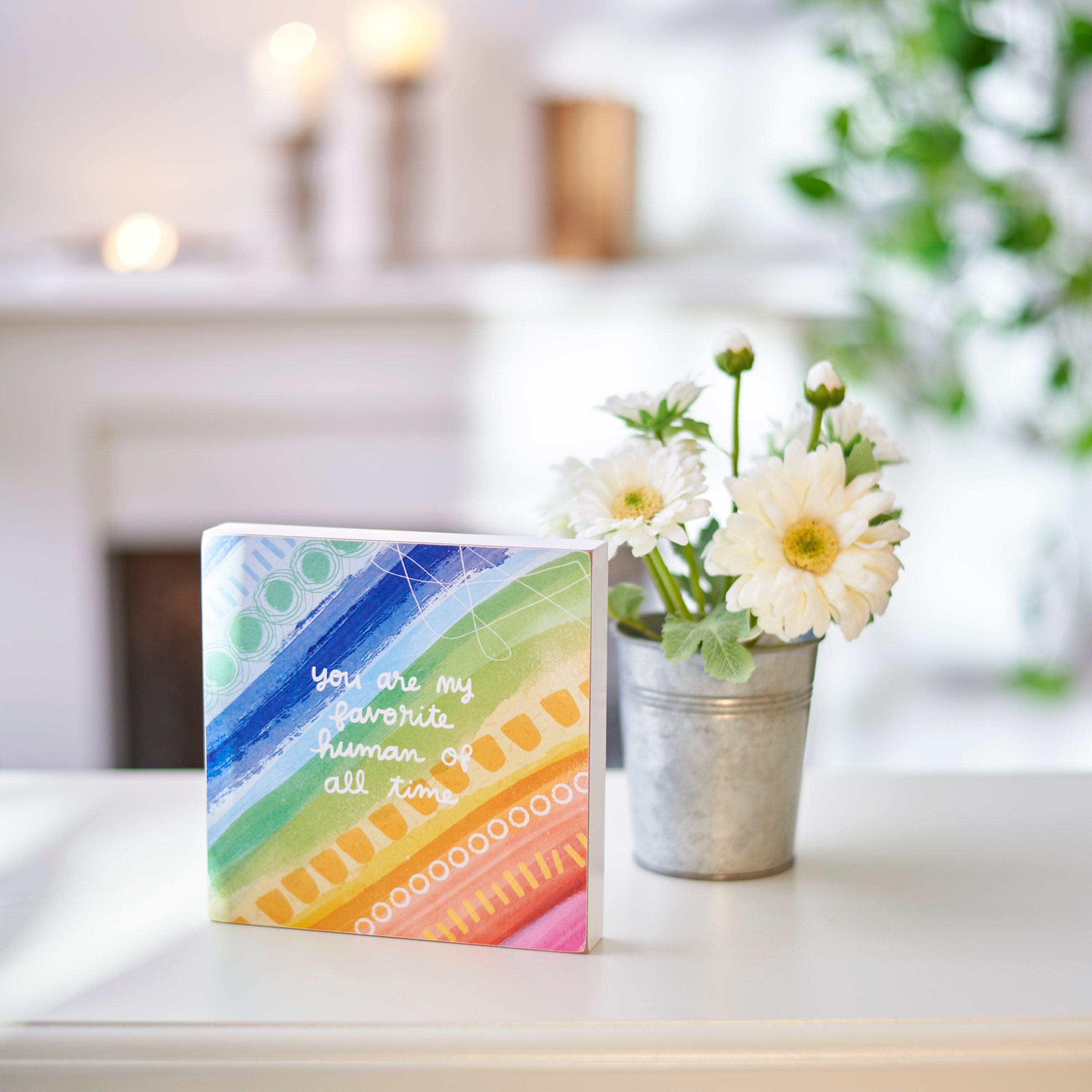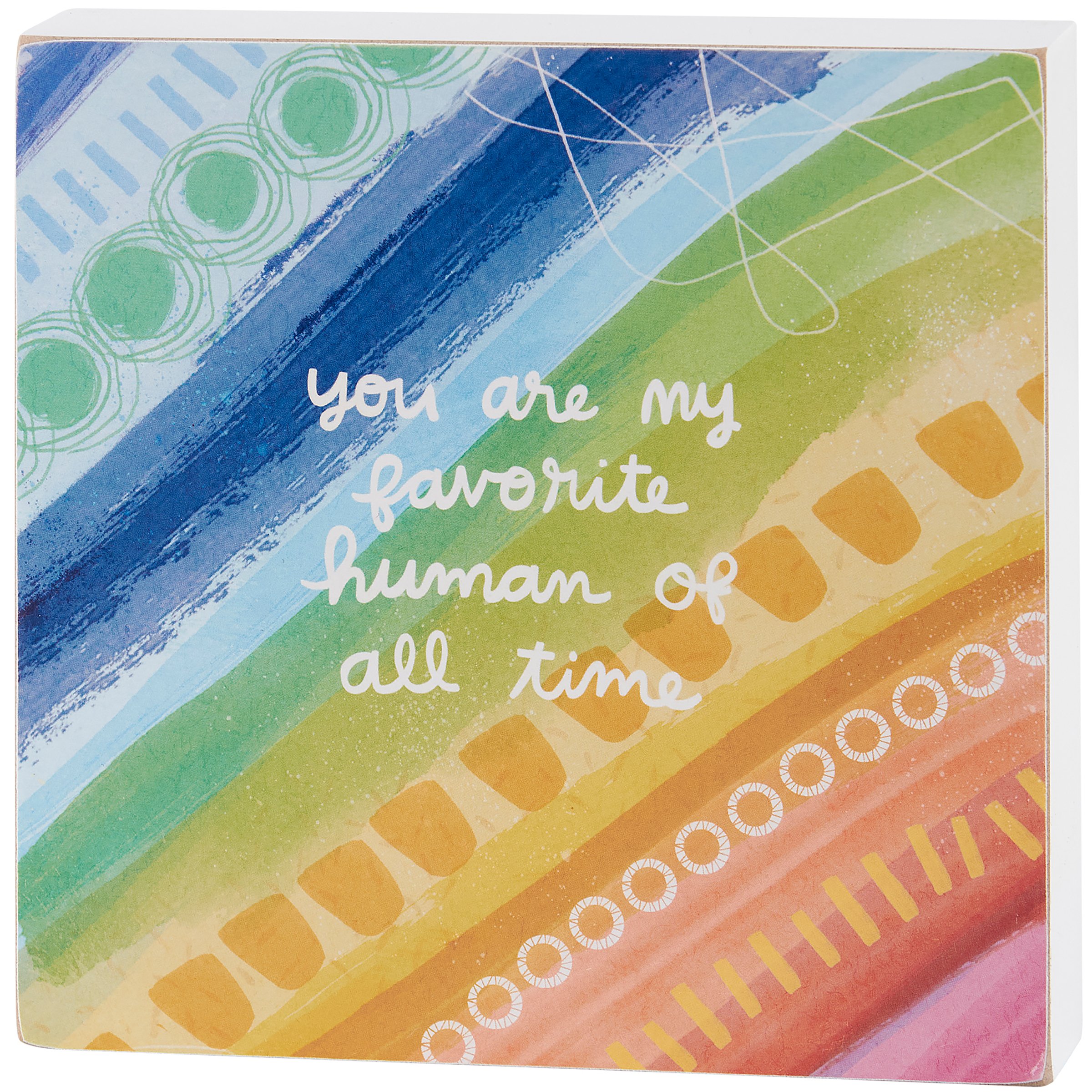 A wooden block sign from our Inspiration & Blooms Collection displaying a hand illustrated abstract design in a warm color palette behind a heartwarming sentiment that reads "You Are My Favorite Human Of All Time." Block sign features coordinating white color on the sides and back. Our You Are My Favorite Human block sign is easy to hang via predrilled keyhole slot or can free-stand alone. A lovely gift perfect for an everyday home accent.