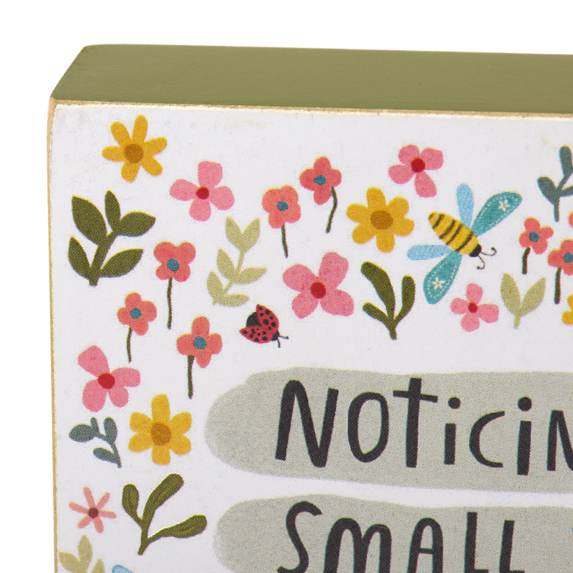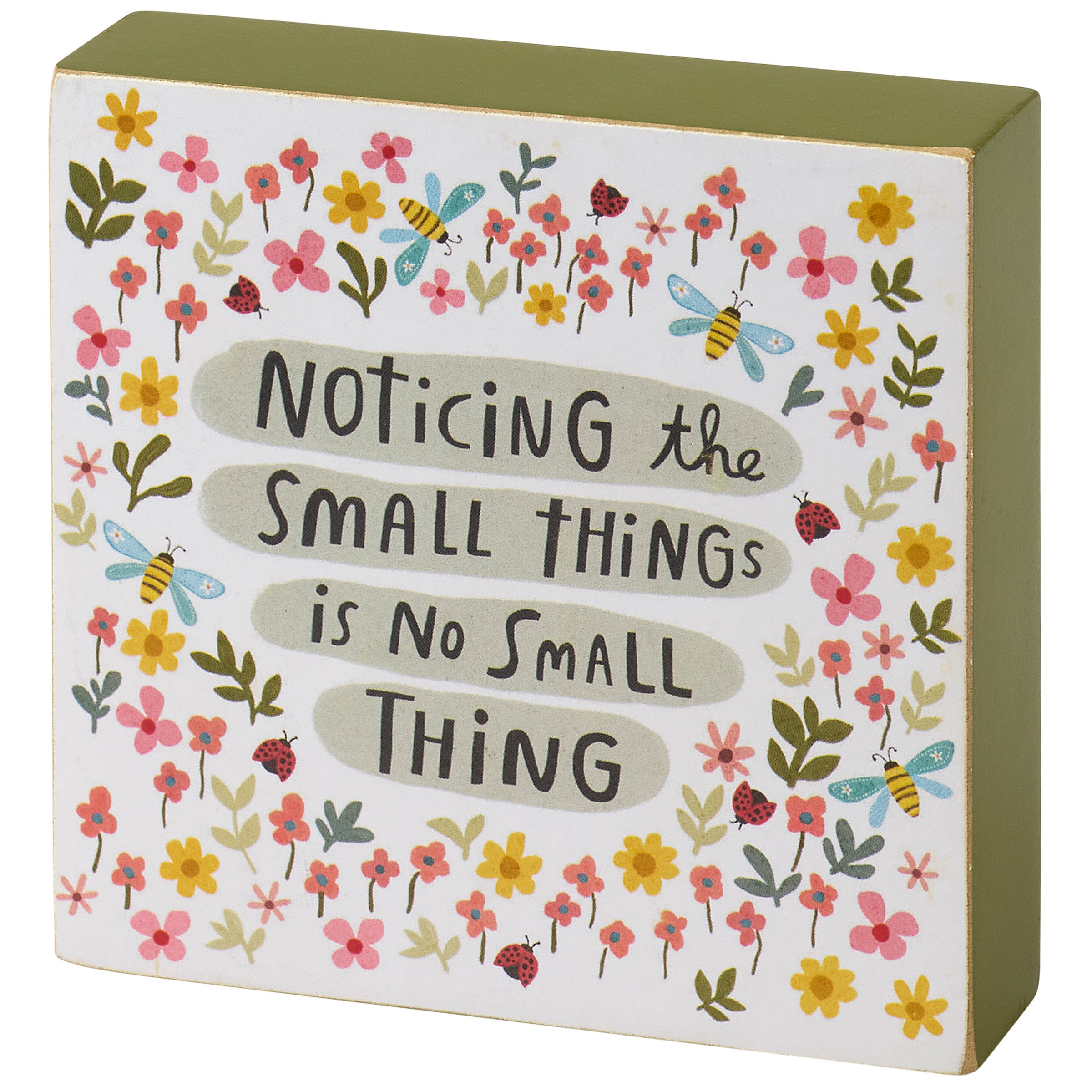 A wooden block sign from our Inspiration & Blooms Collection displaying vibrant flowers with bees and lady bugs surrounding an inspirational sentiment that reads "Noticing The Small Things Is No Small Thing." Vibrant design and sentiment is replicated from original hand illustrated artwork. This inspirational block sign features a coordinating green color on the sides and back. Our No Small Thing sign is easy to hang via a predrilled keyhole slot on the back or can free-stand on a flat surface for display. An inspirational home accent that can be easily displayed in any home or work space.