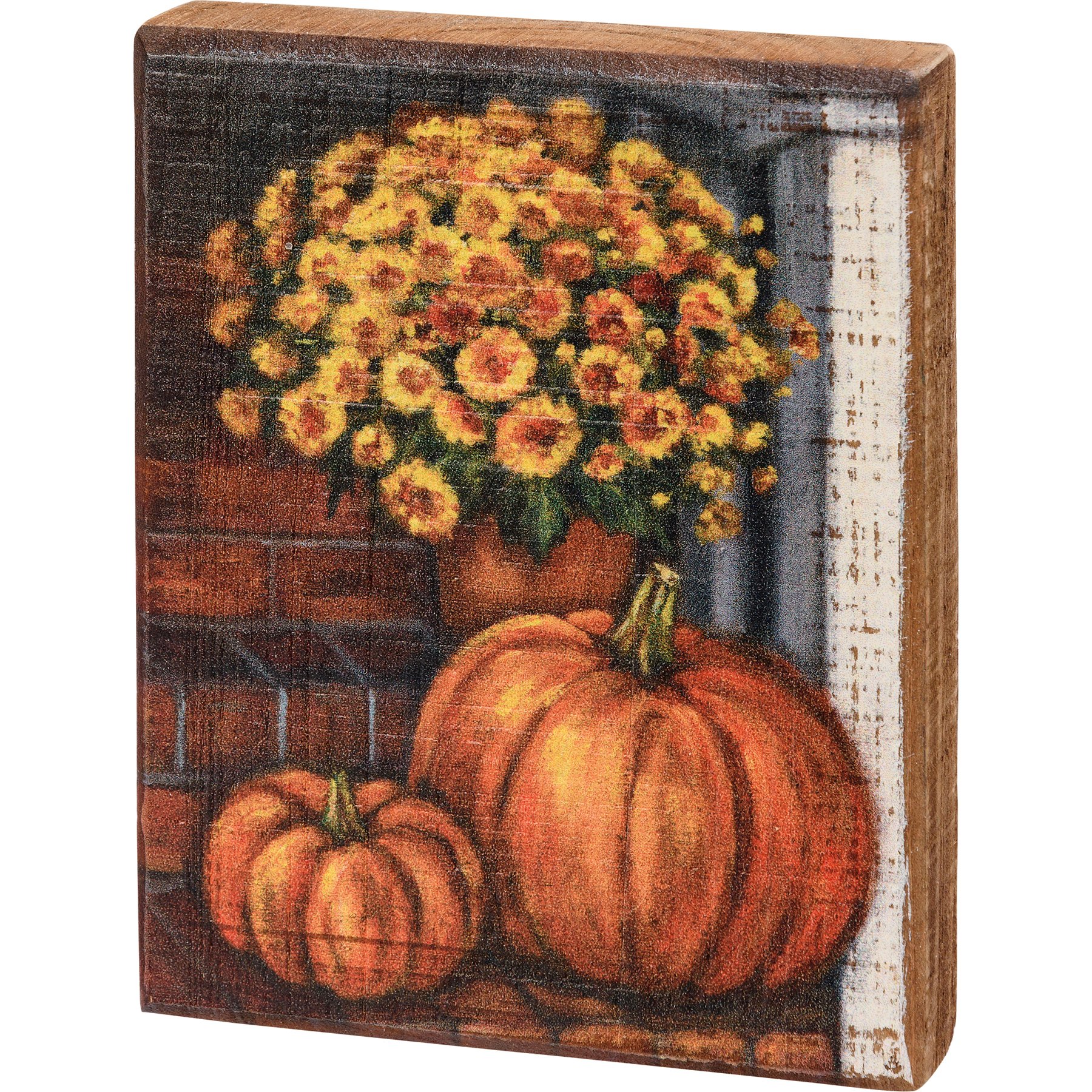 A wooden block sign depicting a fall display of mums and pumpkins. Design is replicated from original artwork painted onto burlap canvas, giving the art a unique depth and texture. Easy to hang via predrilled keyhole slot or can free-stand alone.