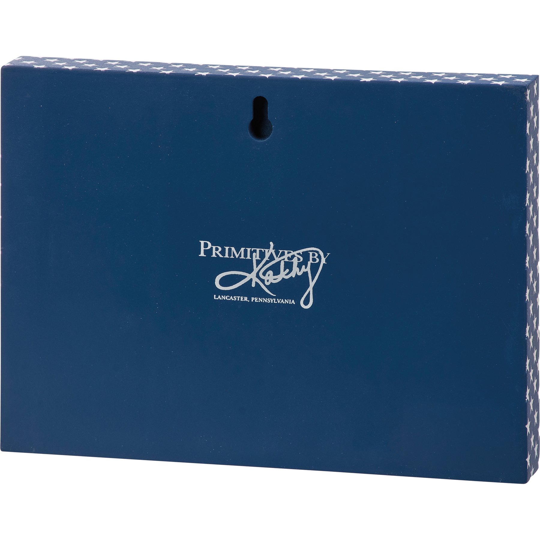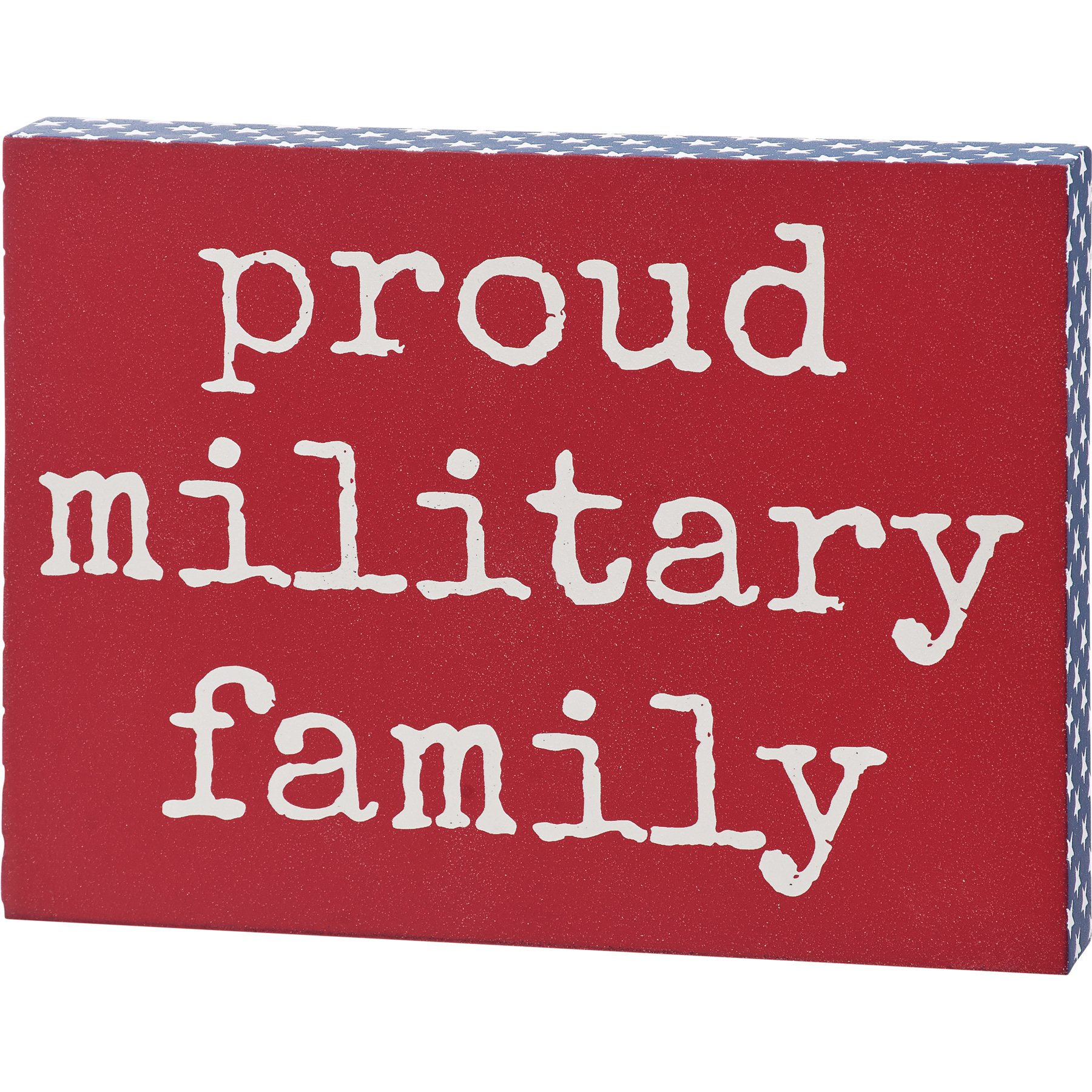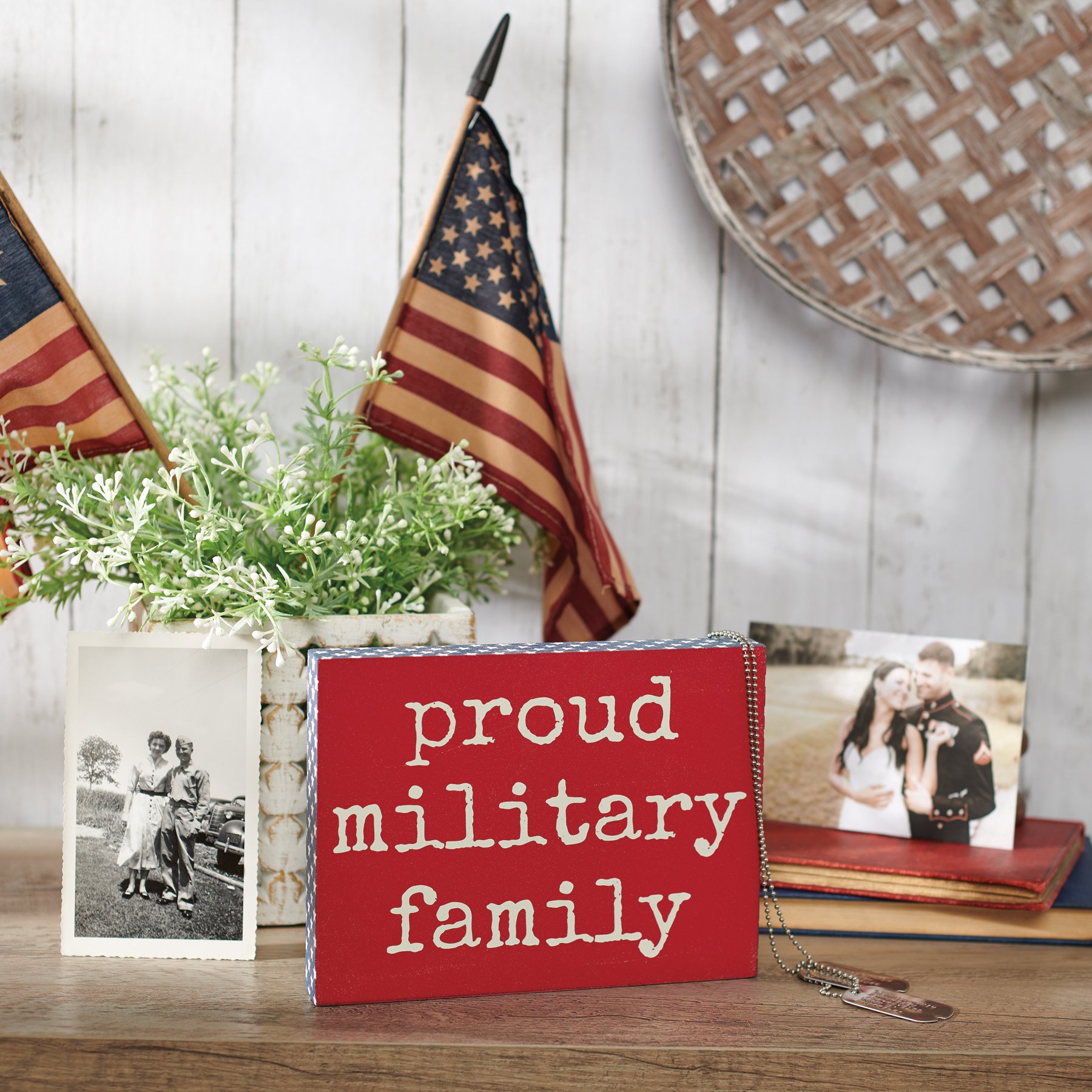 A rustic wooden block sign from our Patriotic Collection displaying "Proud Military Family" sentiment on patriotic red background. Sides feature debossed white star designs on blue for added texture. Our Proud Military Family block sign is easy to hang via predrilled keyhole slot or can free-stand alone.
