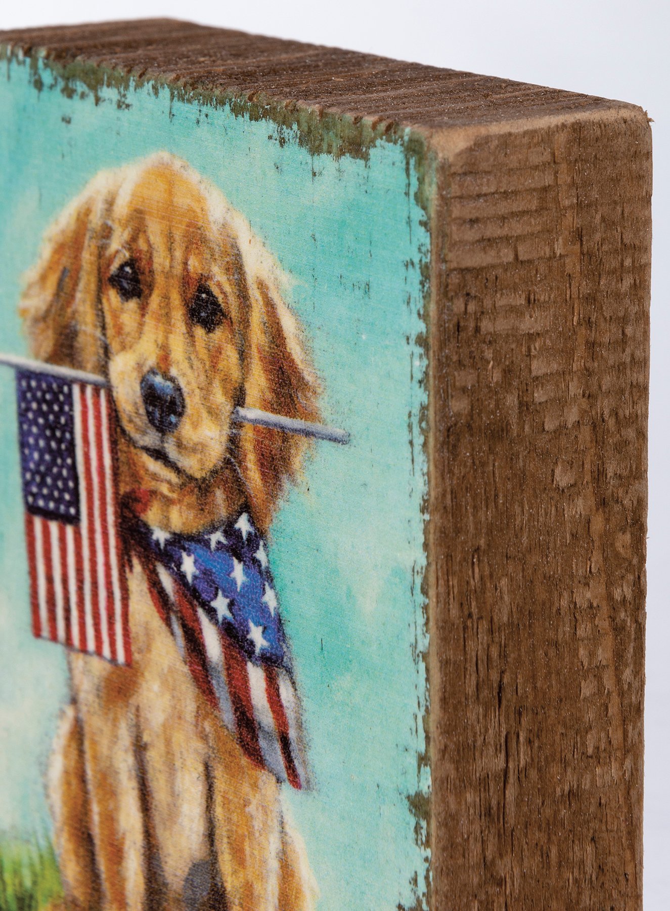 A wooden block sign depicting a puppy holding an American flag. Design is replicated from original artwork painted onto burlap canvas, giving the art a unique depth and texture. Easy to hang via predrilled keyhole slot or can free-stand alone. Not eligible for discounting.