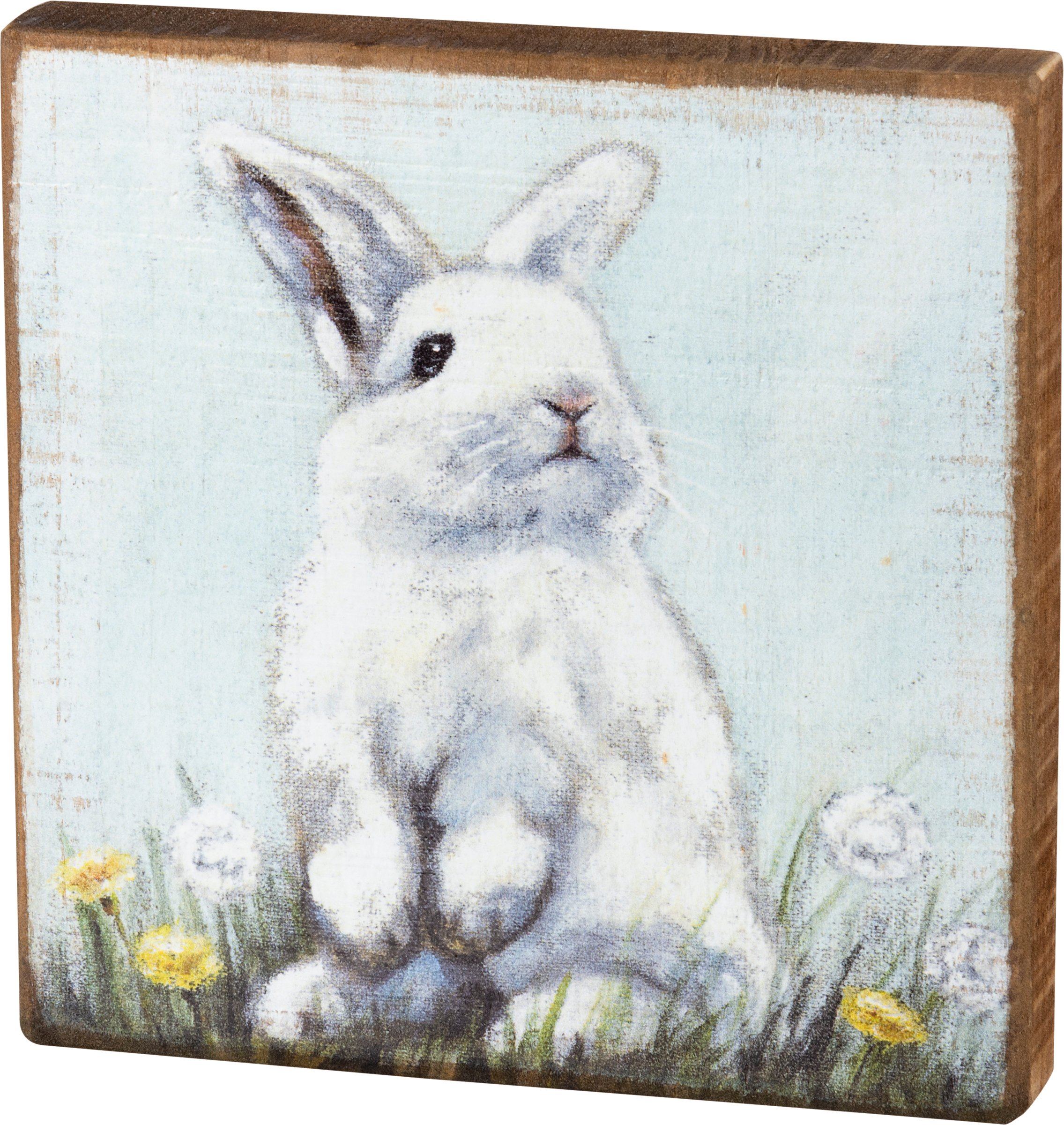 A wooden block sign featuring a bunny in a field and dandelion details. Design is replicated from original artwork painted onto burlap canvas, giving the art a unique depth and texture. Hangs easily by predrilled back keyhole or can free-stand alone.