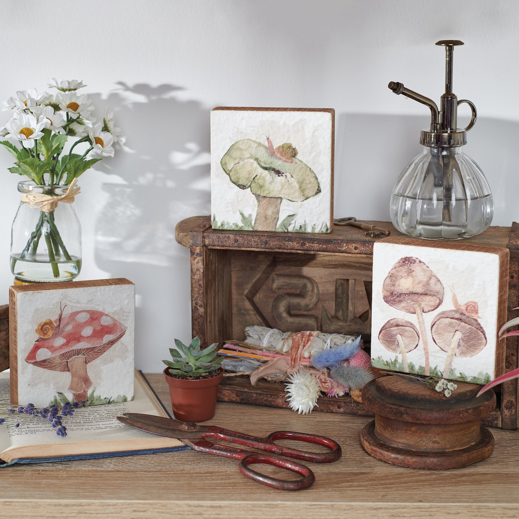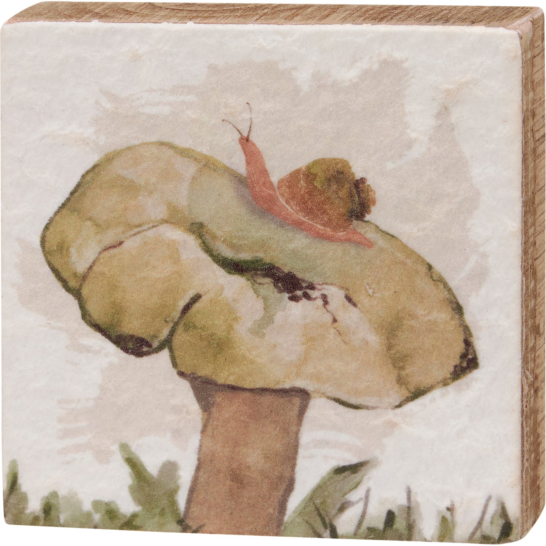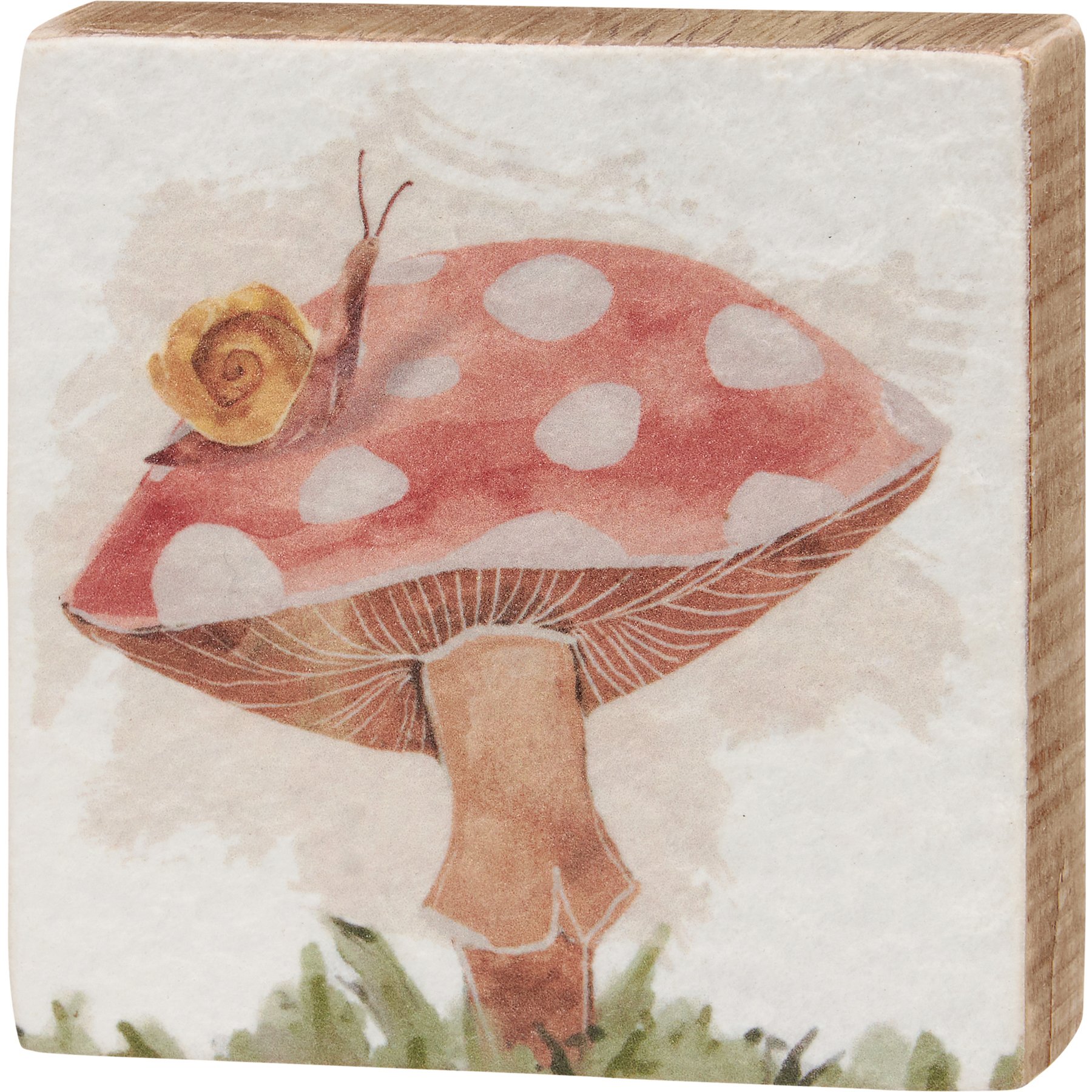 A coordinating set of three wooden block signs from our Cottagecore Collection displaying hand painted designs of mushrooms in the wild. Each sign features nature inspired designs printed on watercolor paper for added texture. Easy to hang via predrilled keyhole slot or can free-stand alone. The wild mushroom block sign set is shrink wrapped with cardboard backing and finished with cotton tape ribbon and hang tag.