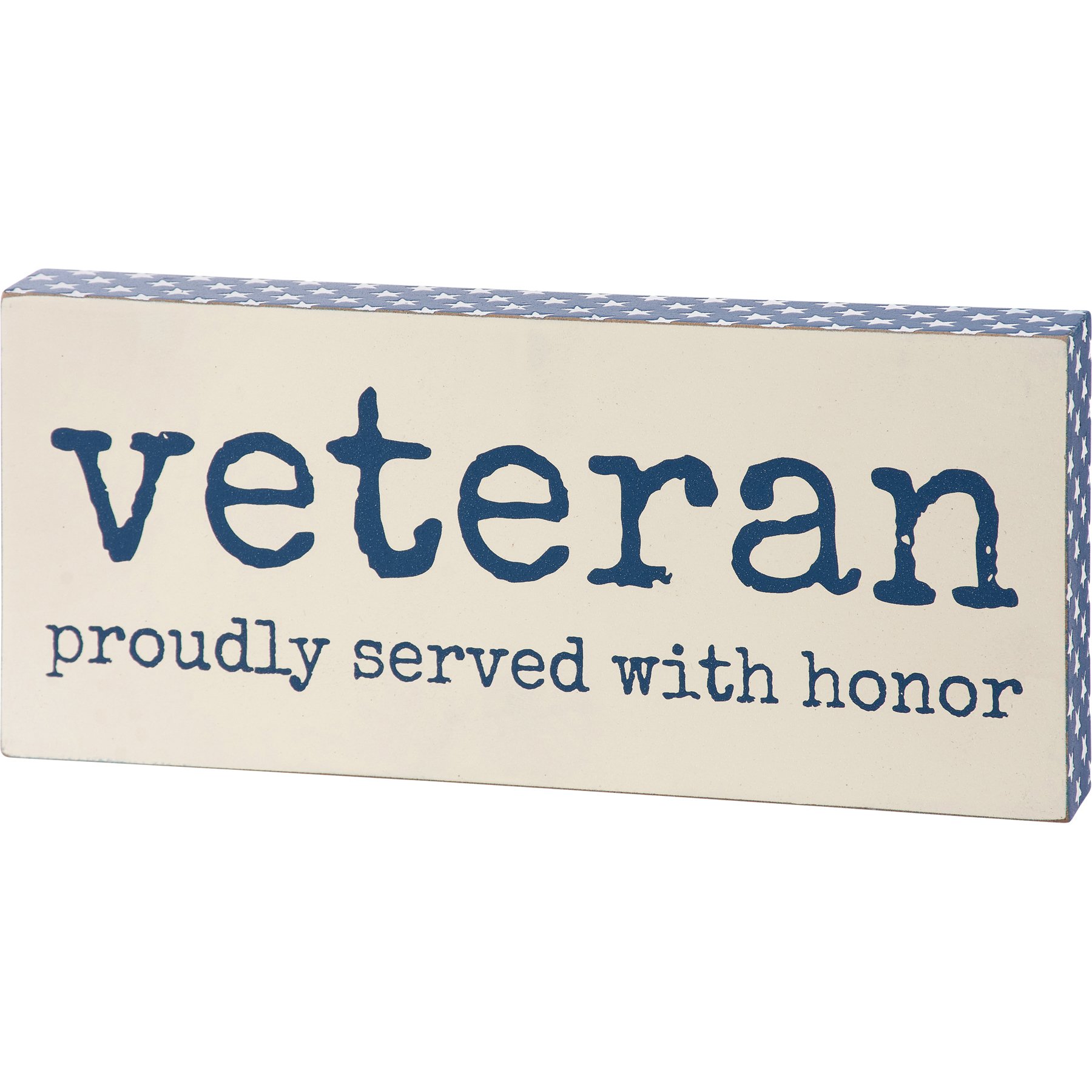 A rustic wooden block sign from our Patriotic Collection displaying "Veteran Proudly Served With Honor" sentiment in patriotic blue color. Sides feature debossed white star designs on blue for added texture. Our Veteran Served With Honor block sign is easy to hang via predrilled keyhole slot or can free-stand alone.