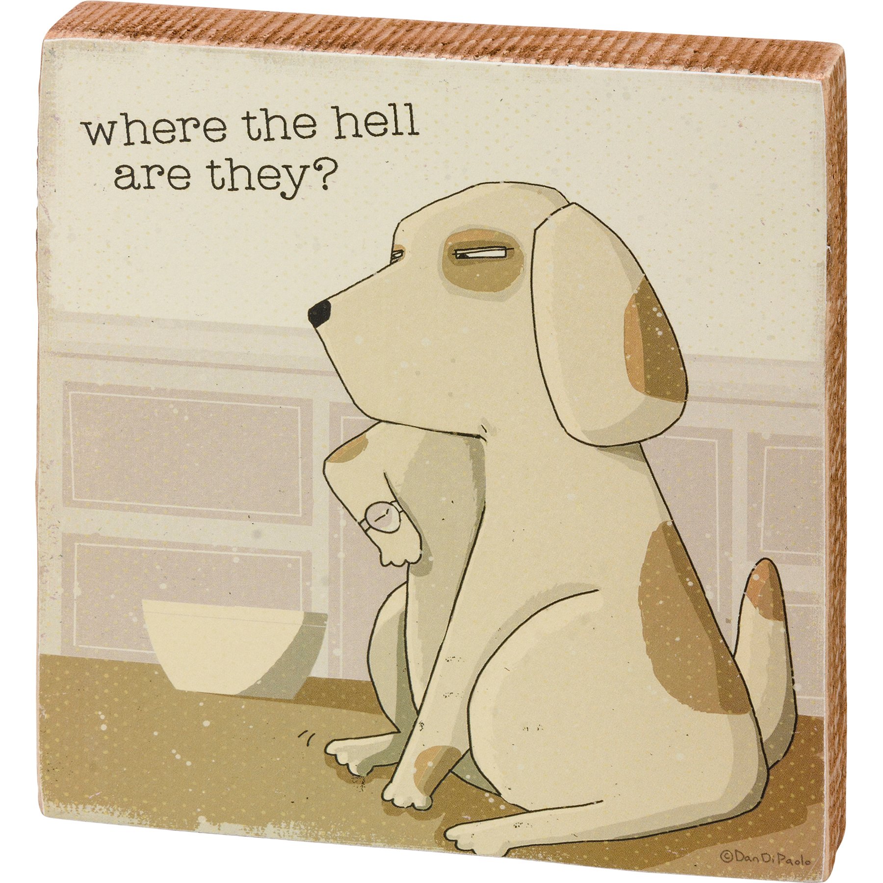 A wooden block sign from our Pet Collection displaying a rustic design of a dog sitting by its food bowl and staring at its watch with a fun pet inspired sentiment that reads "Where The Hell Are They?" Dog block sign features distressed details with coordinating natural wood on the sides and back. Our Where Are They block sign is easy to hang via predrilled keyhole slot or can free-stand alone. A fun pet-themed home accent perfect for gifting to dog lovers.