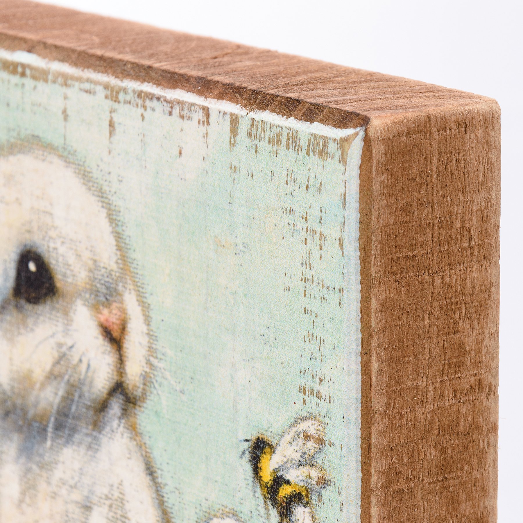 A wooden block sign from our Farmhouse Collection depicting a white bunny in a field. Design is replicated from original artwork painted onto burlap canvas, giving the art a unique depth and texture. Out white bunny sign is easy to hang via predrilled keyhole slot or can free-stand alone.