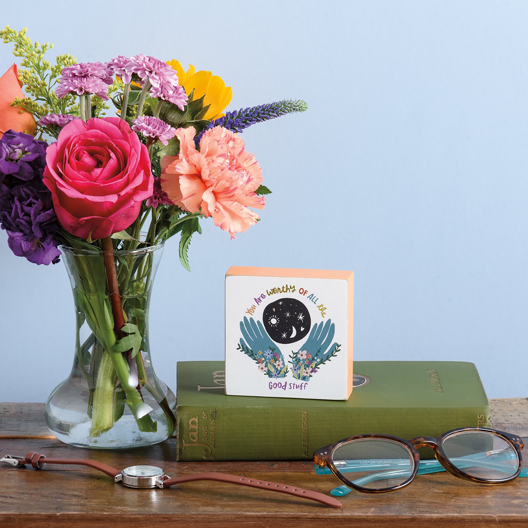 A wooden block sign featuring a vibrant color palette with whimsical designs and inspirational words. Sentiment reads "You Are Worthy Of All The Good Stuff". Wooden wall art is easy to hang via predrilled keyhole slot or can free-stand alone. Sides feature coordinating solid color for added interest.