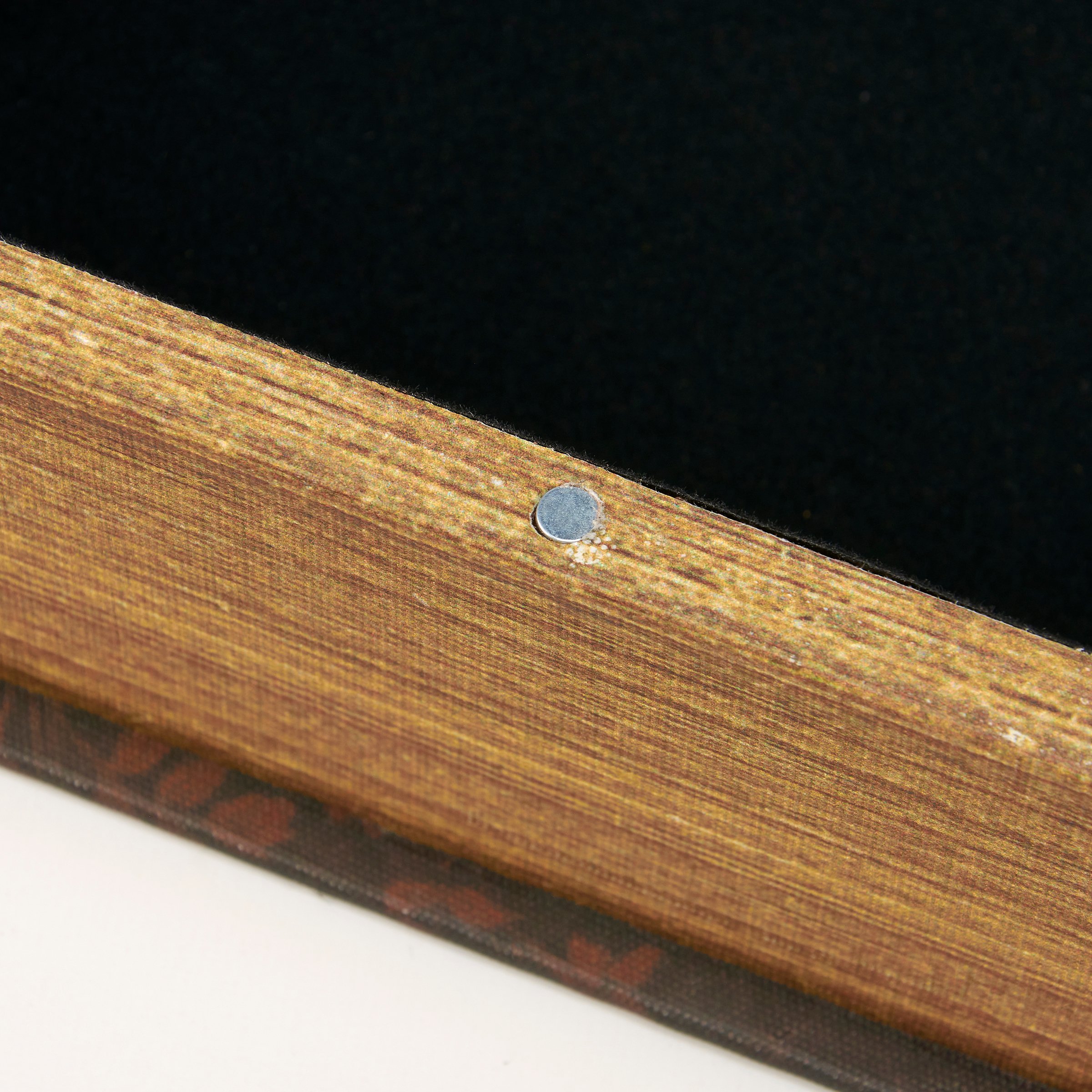 A decorative box from our Moody Collection displaying the appearance of a book inspired by Dark Academia décor. Book box features a textured canvas wrap displaying the exterior of a vintage book with floral patterns on the covers and distressed details. Front cover opens to reveal a velvet lined space for storing items and a magnet closure for secure storage when standing up. Our Dark Floral book box can be used upright as a book or displayed laying down with the cover open and decorative accents inside. Accessories pictured not included. A rustic home accent perfect for storing keepsakes or for everyday décor displays.