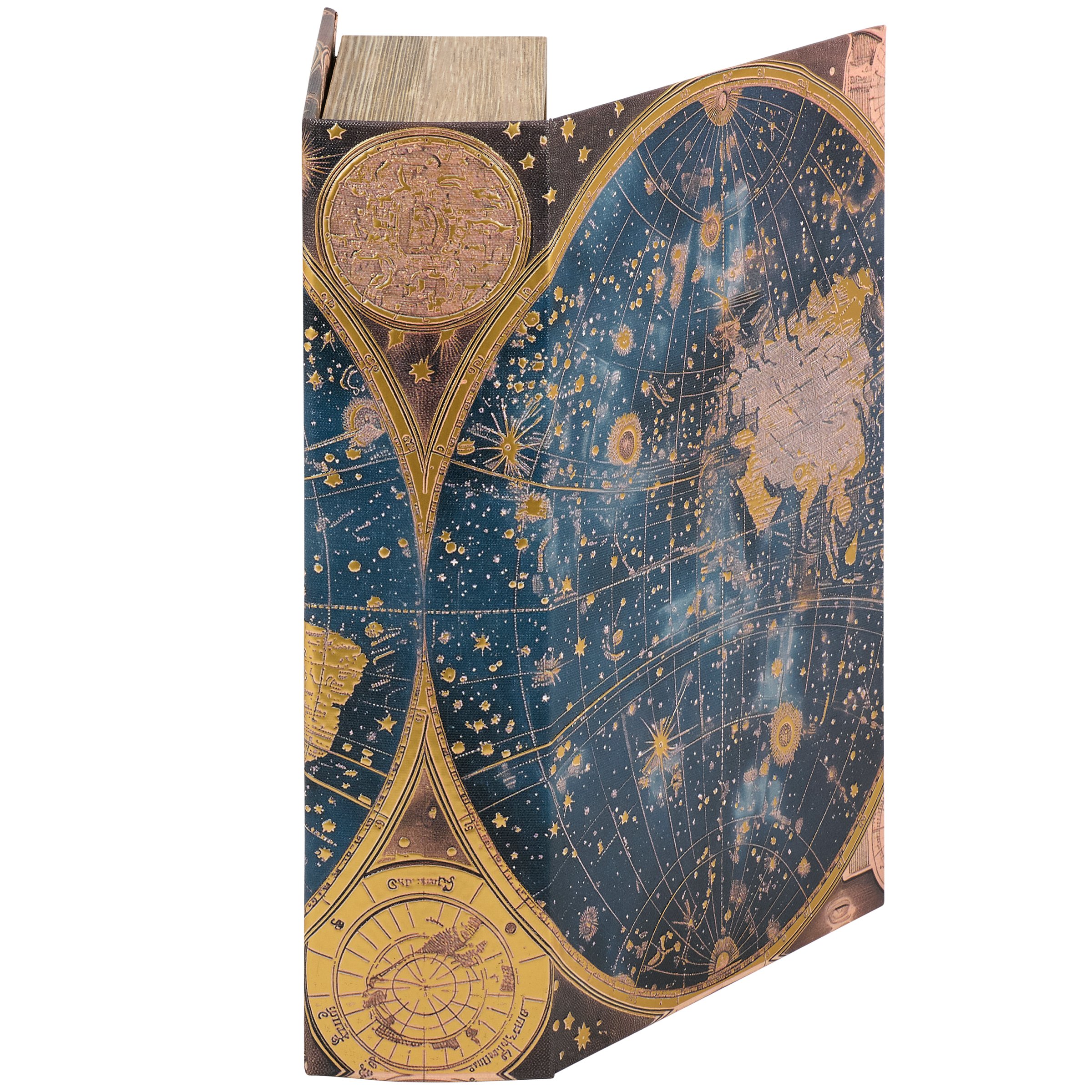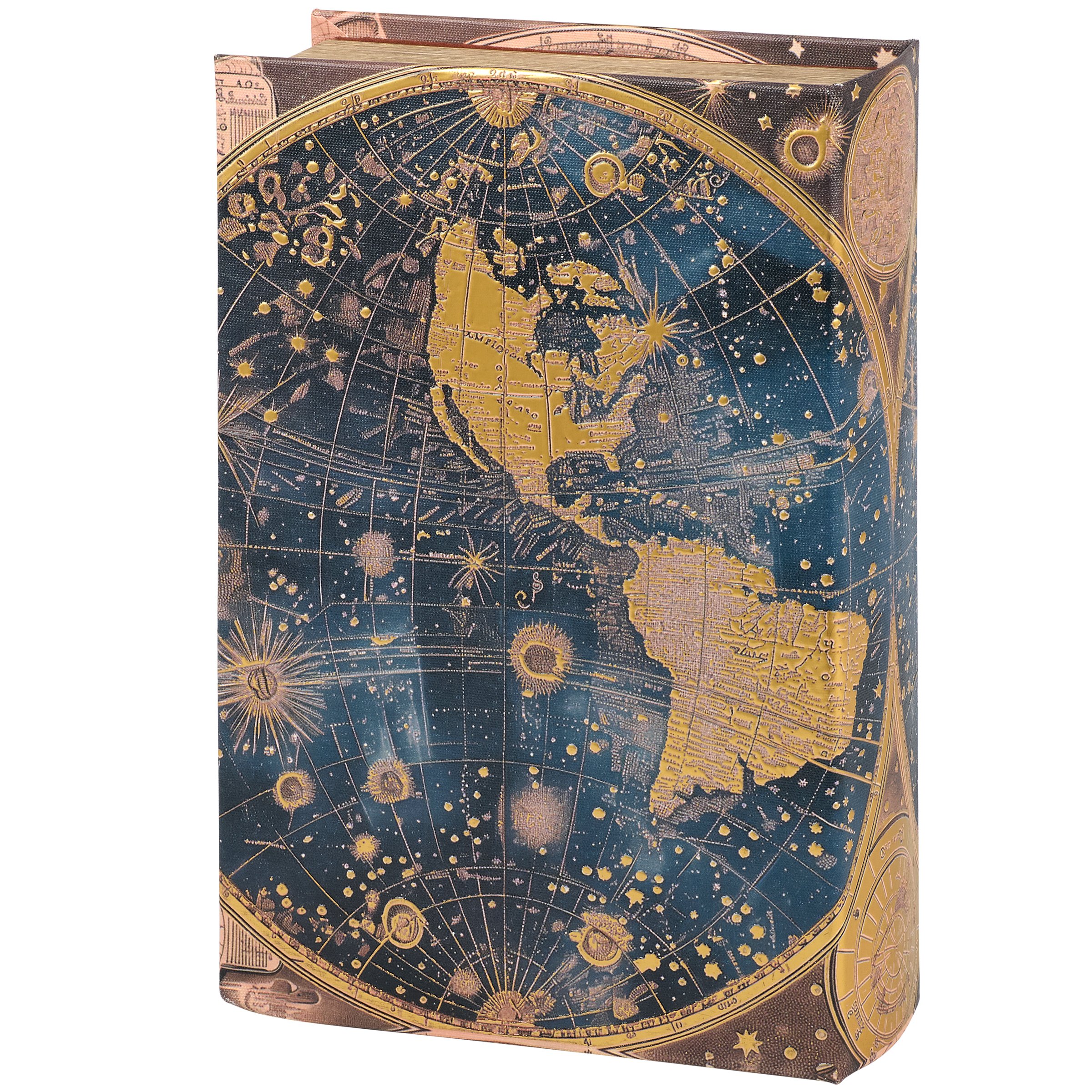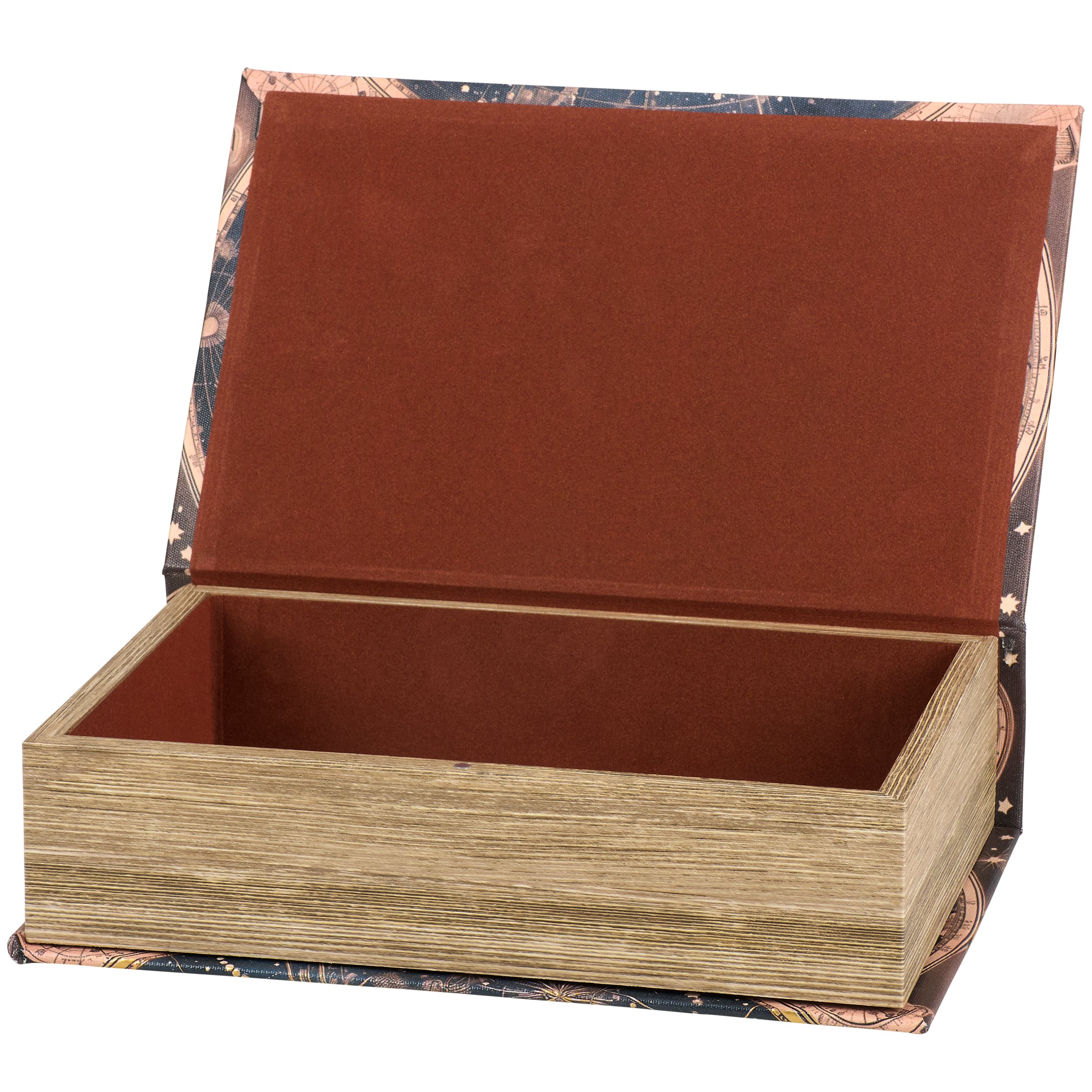 A decorative box from our Mystical Collection displaying a book design inspired by celestial maps. Decorative book box features a soft fabric wrap displaying the exterior of a vintage book with a detailed celestial maps and charts. Celestial book box also features embossed details for added dimension. Front cover opens to reveal a velvet lined space for storing items with a magnet closure for secure storage when standing up. Our Mystical book box can be used upright on a bookshelf or laid flat with the cover open displaying decorative accents inside. A stylish home accent perfect for storing keepsakes or for everyday home décor displays.
