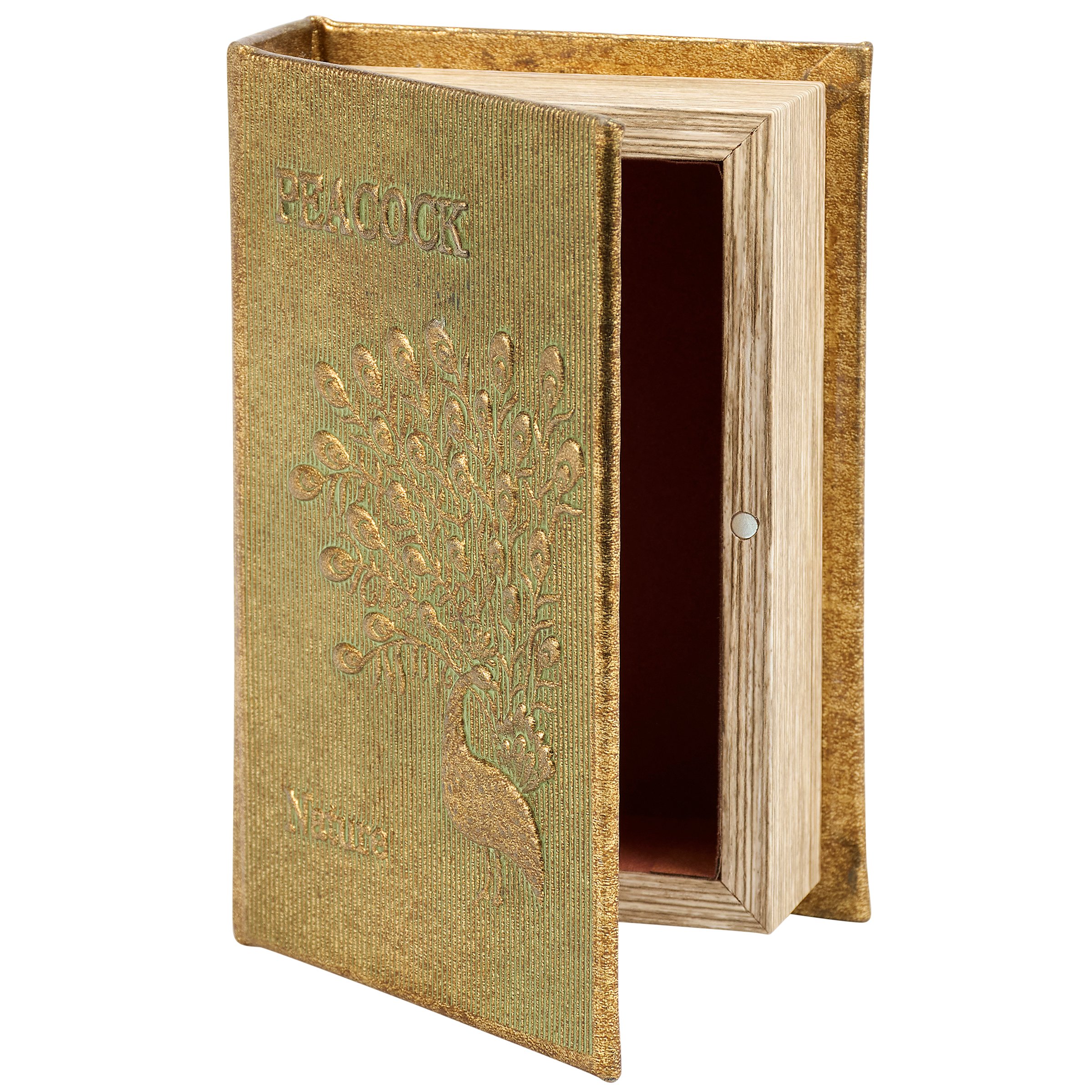 A decorative box from our Art Nouveau Collection displaying a book design inspired by art nouveau décor. Book box features a textured faux leather wrap displaying the exterior of a vintage book with a metallic gold and patina finish on an embossed peacock design. Peacock book box also displays a coordinating embossed gold and patina design on its side to give the appearance of a book spine when on a shelf. Front cover opens to reveal a velvet lined space for storing items with a magnet closure for secure storage when standing up. Our Peacock book box can be used upright on a bookshelf or laid flat with the cover open displaying decorative accents inside. A vintage home accent perfect for storing keepsakes in style or for everyday home décor displays.