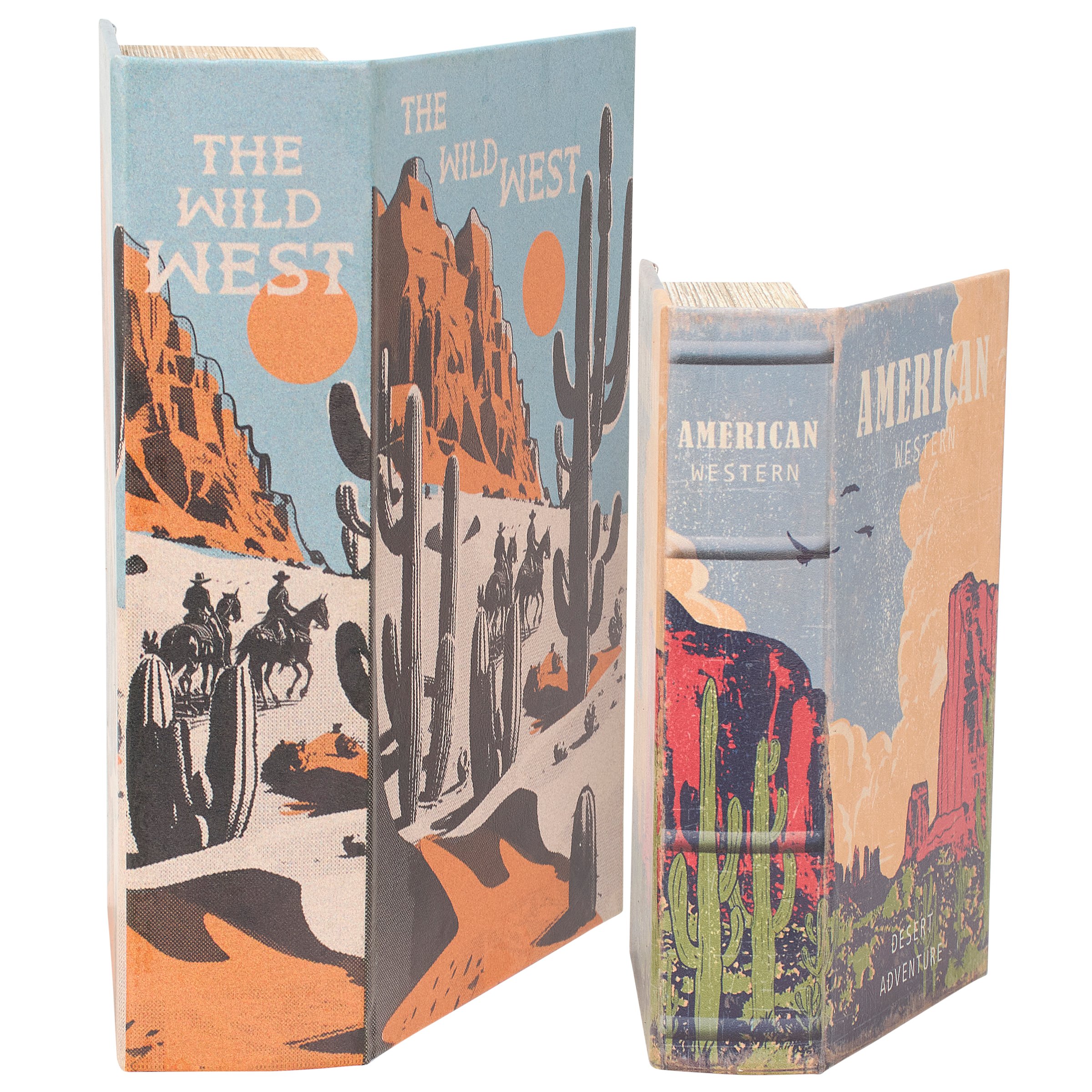 A set of 2 decorative boxes from our Western Collection displaying coordinating book designs in different sizes inspired by western home décor. Book boxes feature a textured faux leather wrap displaying the exterior of a vintage book with distressed details and colorful desert-themed designs as well as titles including "American Western" and "The Wild West." Western book boxes also display coordinating desert designs on the side to give the appearance of a book spine when on a shelf. Front covers open to reveal a velvet lined space for storing items with a magnet closure for secure storage when standing up. Our American West book box set can be used upright on a bookshelf or laid flat with the cover open displaying decorative accents inside. A rustic set of home accents perfect for storing keepsakes in style or for western décor displays.