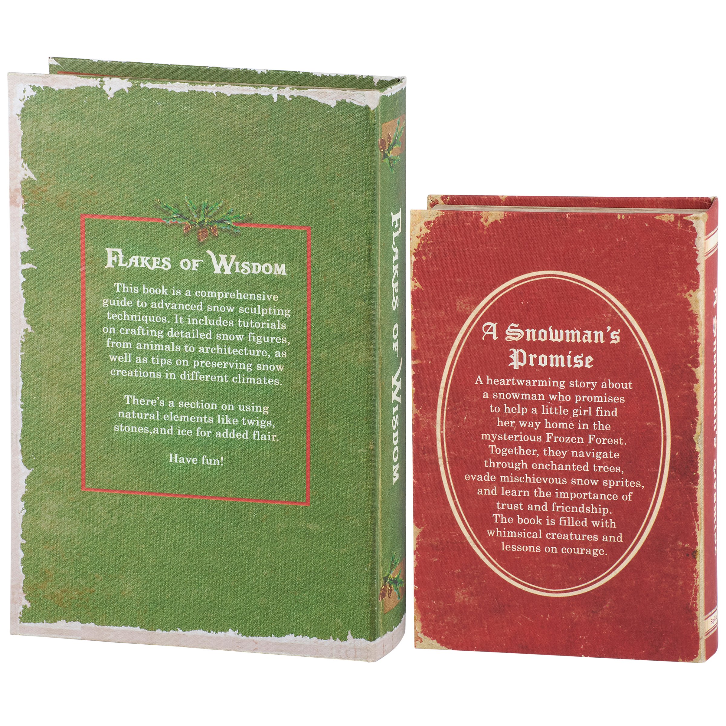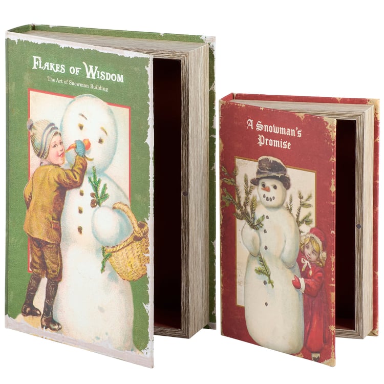A set of 2 decorative boxes from our Christmas Collection displaying coordinating book designs in different sizes inspired by vintage Christmas home décor. Each Christmas book box features a textured canvas wrap displaying the exterior of a vintage book with distressed details and classic snowman designs as well as titles including "Flakes of Wisdom - The Art Of Snowman Building" and "A Snowman's Promise." This set of vintage snowman book boxes also display coordinating title designs on the side to give the appearance of a book spine when on a shelf and a synopsis on the back for each book. The front covers open to reveal a velvet lined space for storing items with a magnet closure for secure storage when standing up. Our Flakes Of Wisdom book box set can be used upright on a bookshelf or laid flat with the cover open displaying decorative accents inside. A set of snowman themed home accents perfect for storing keepsakes in style or for decorating vintage Christmas displays.